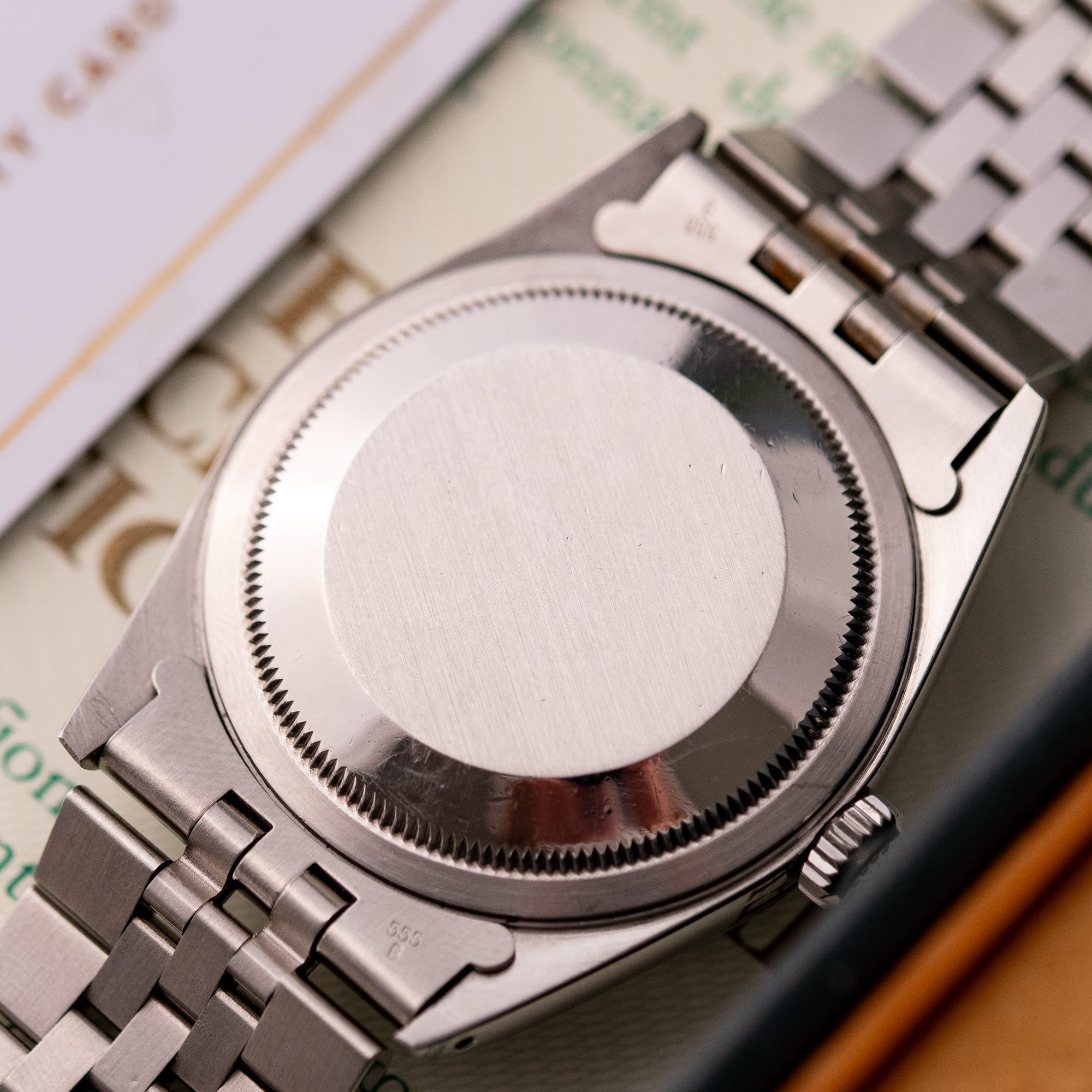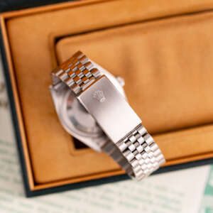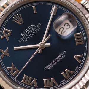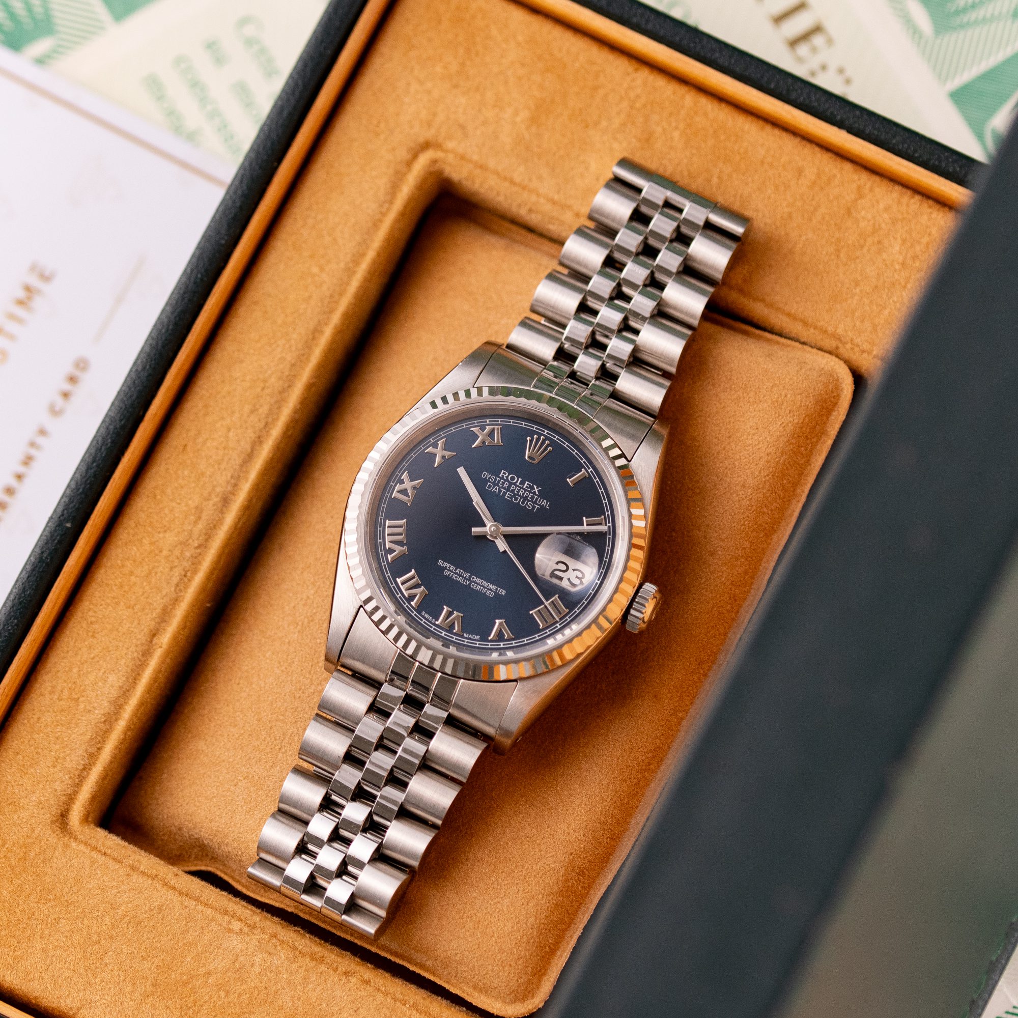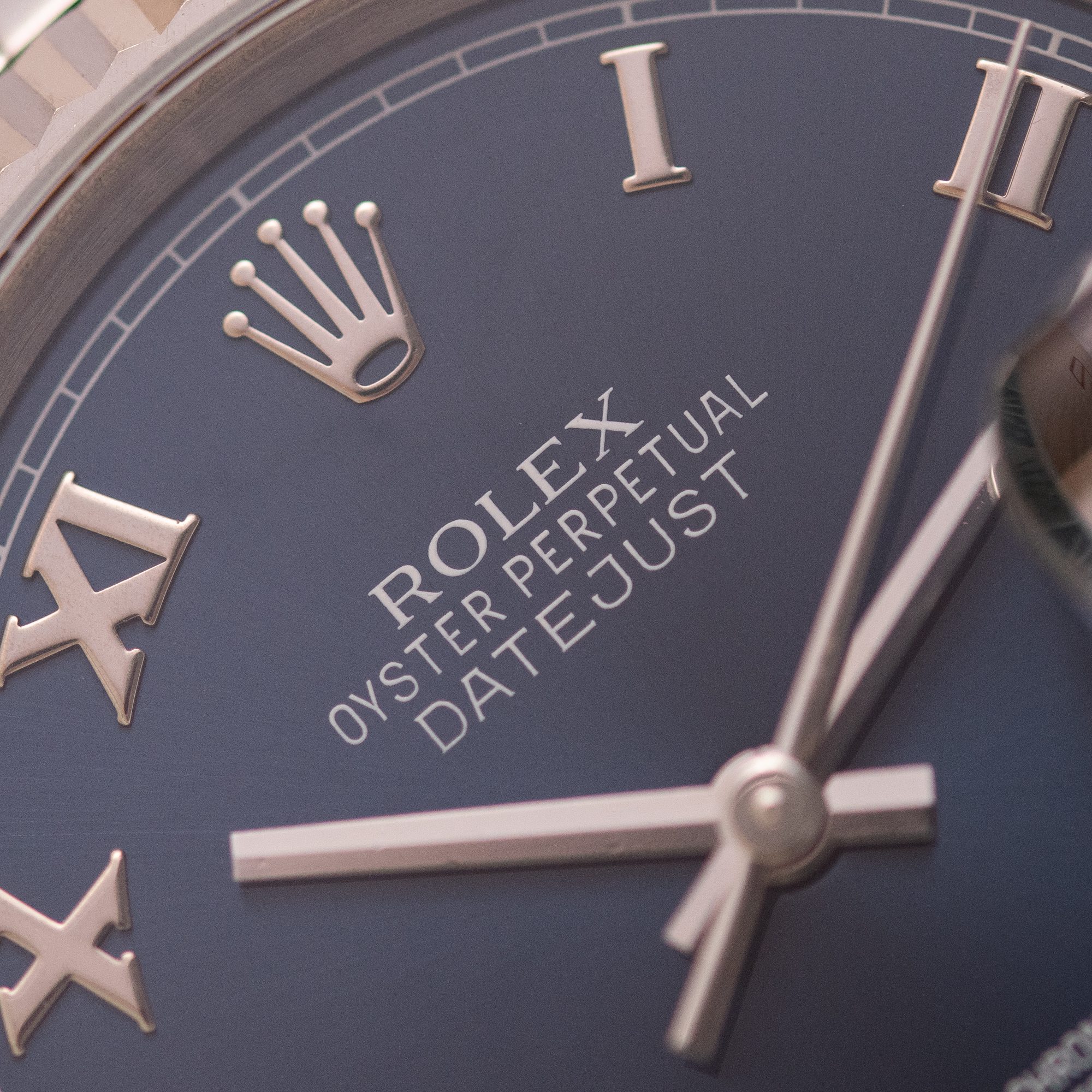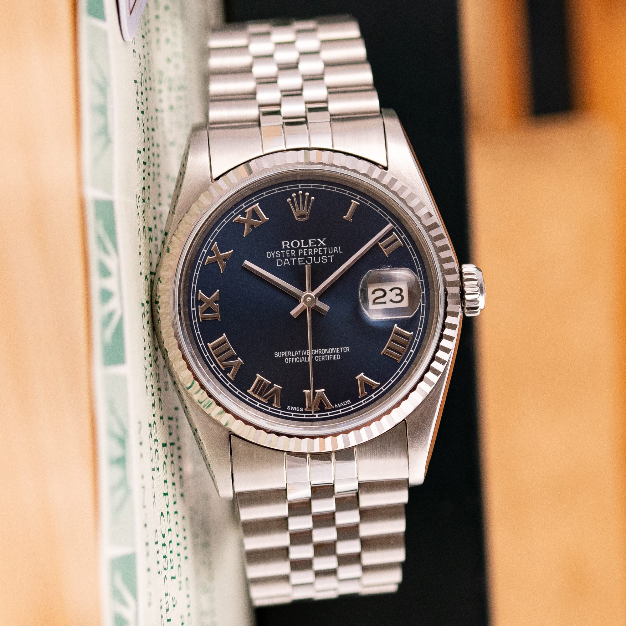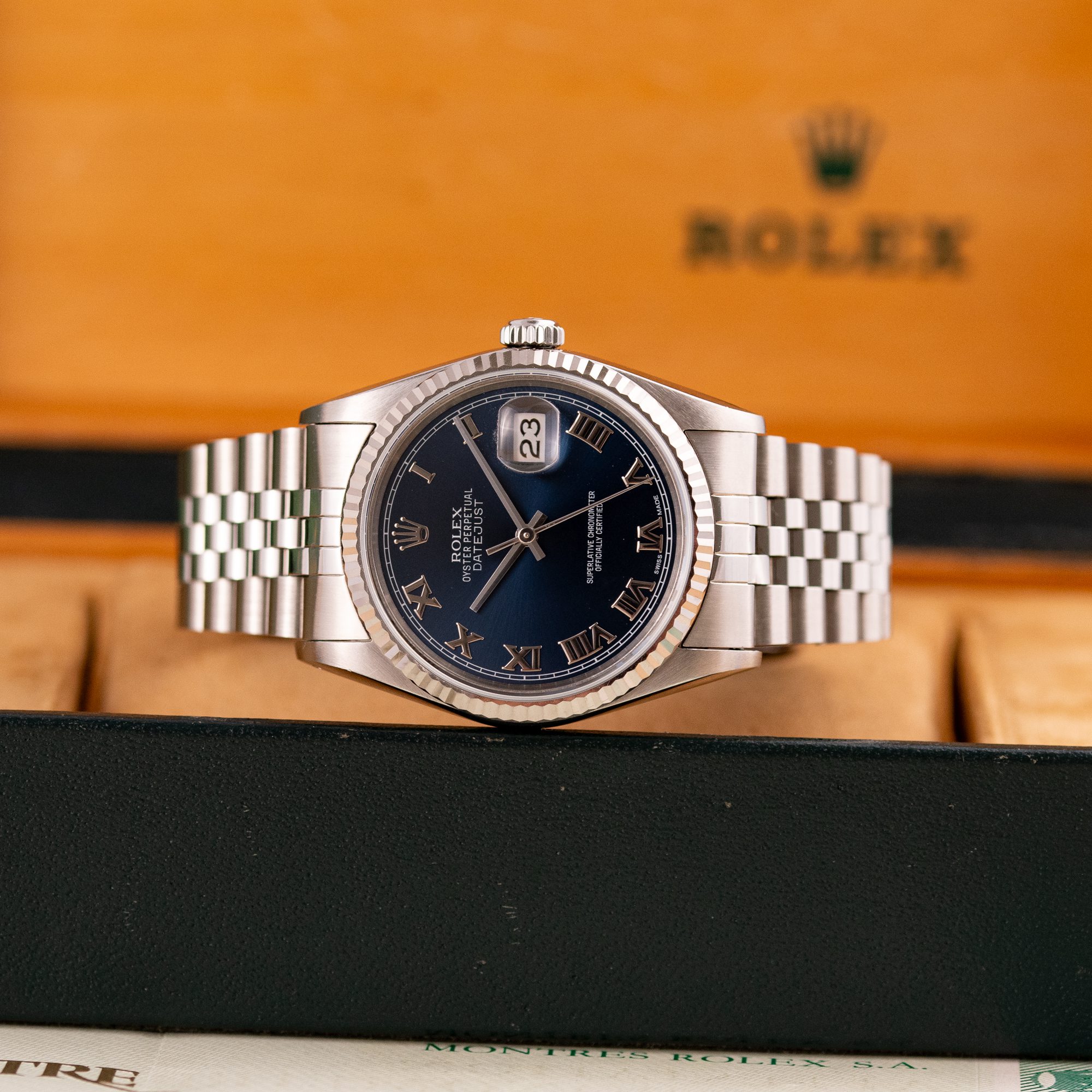 This particular piece, originally sold in 1990 at Bucherer in Geneva, features a beautiful Blue Roman dial that adds a refined and classic touch. The watch is in very good condition, mechanically fully functional, with a bracelet showing minimal stretch. It comes as a full set with the original box and papers, making it a fantastic choice for collectors seeking a well-preserved and elegant Datejust.