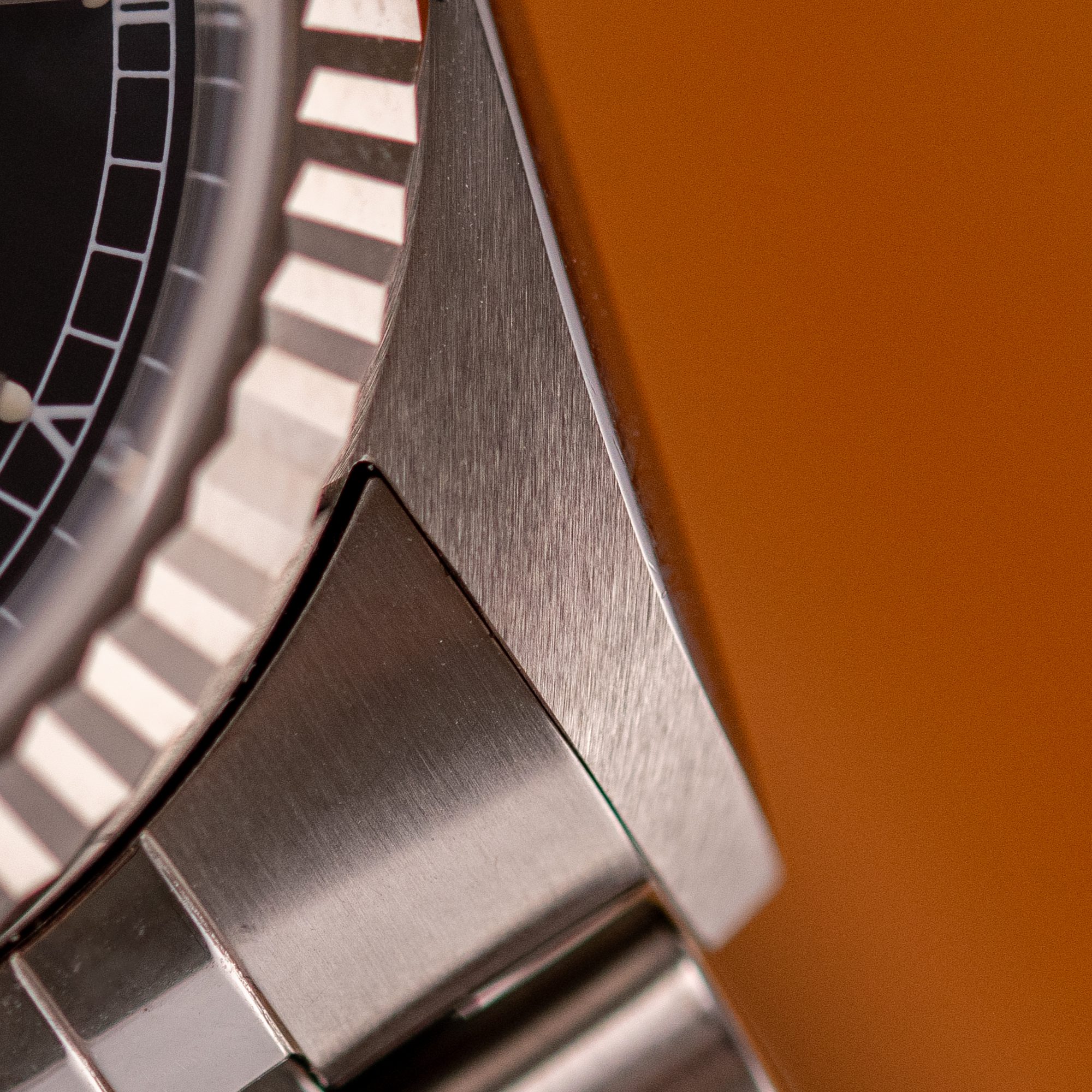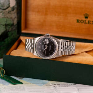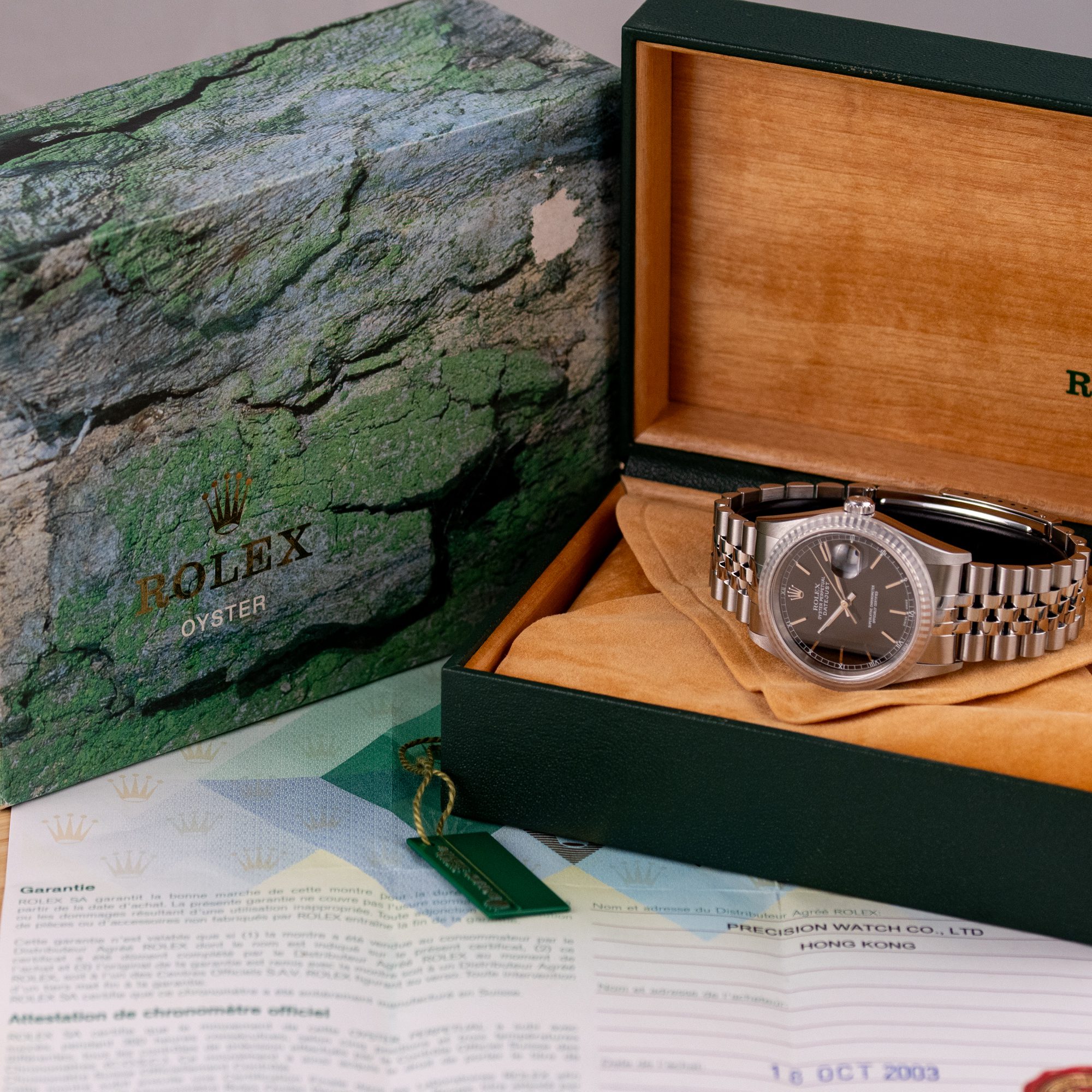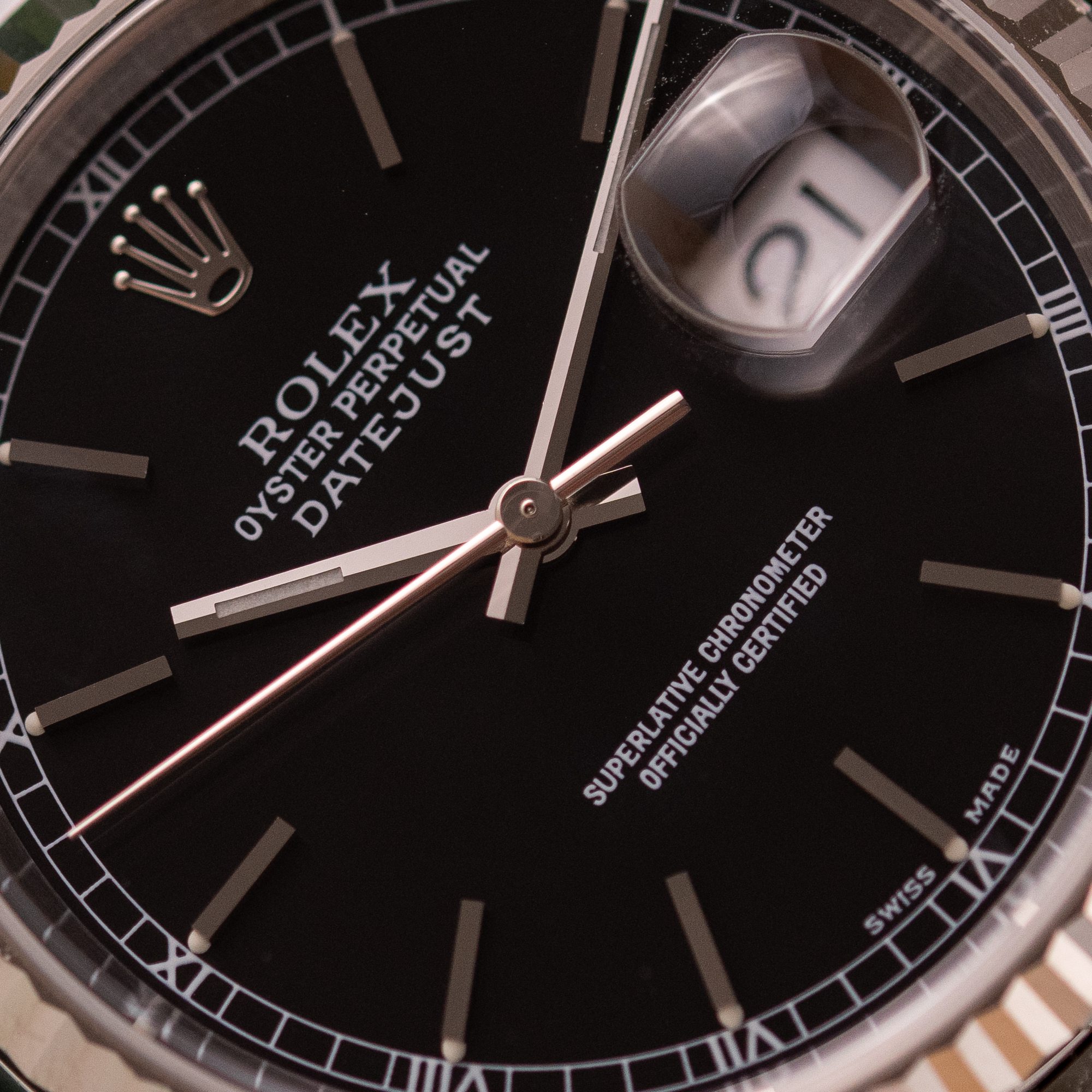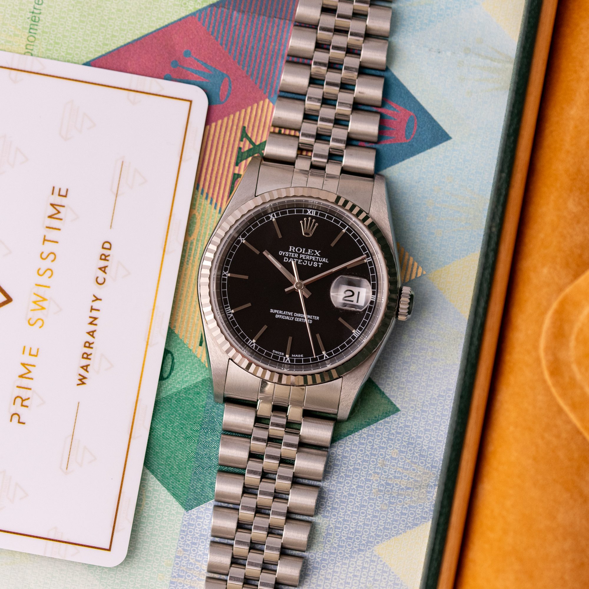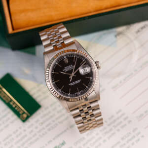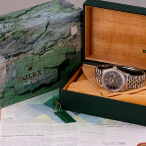 This particular piece, originally sold in 2003, boasts a highly sought-after black dial that exudes sophistication and pairs perfectly with the sharp, well-preserved case. The watch is in very good condition, with a mechanically fully functional movement and a stretch-free bracelet sized for wrists up to 18 cm. Presented as a full set with the original Rolex box and papers, this Datejust is an excellent choice for collectors or those desiring a distinguished, versatile timepiece.