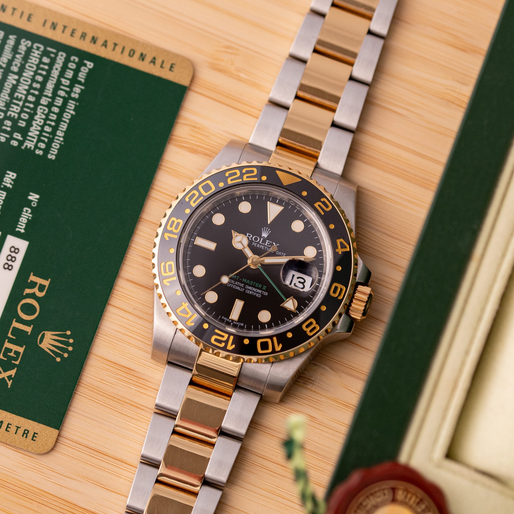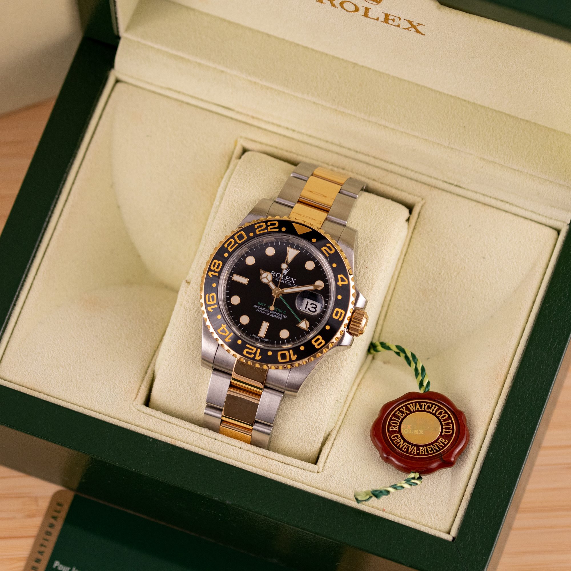 This particular piece was originally sold in 2010 and is in very good condition, with a mechanically fully functional movement. The bracelet is sized for wrists up to 19 cm, offering a comfortable fit. Presented as a full set with the original Rolex box and papers, this watch is an excellent choice for collectors or those seeking a reliable, stylish companion for global travels.
