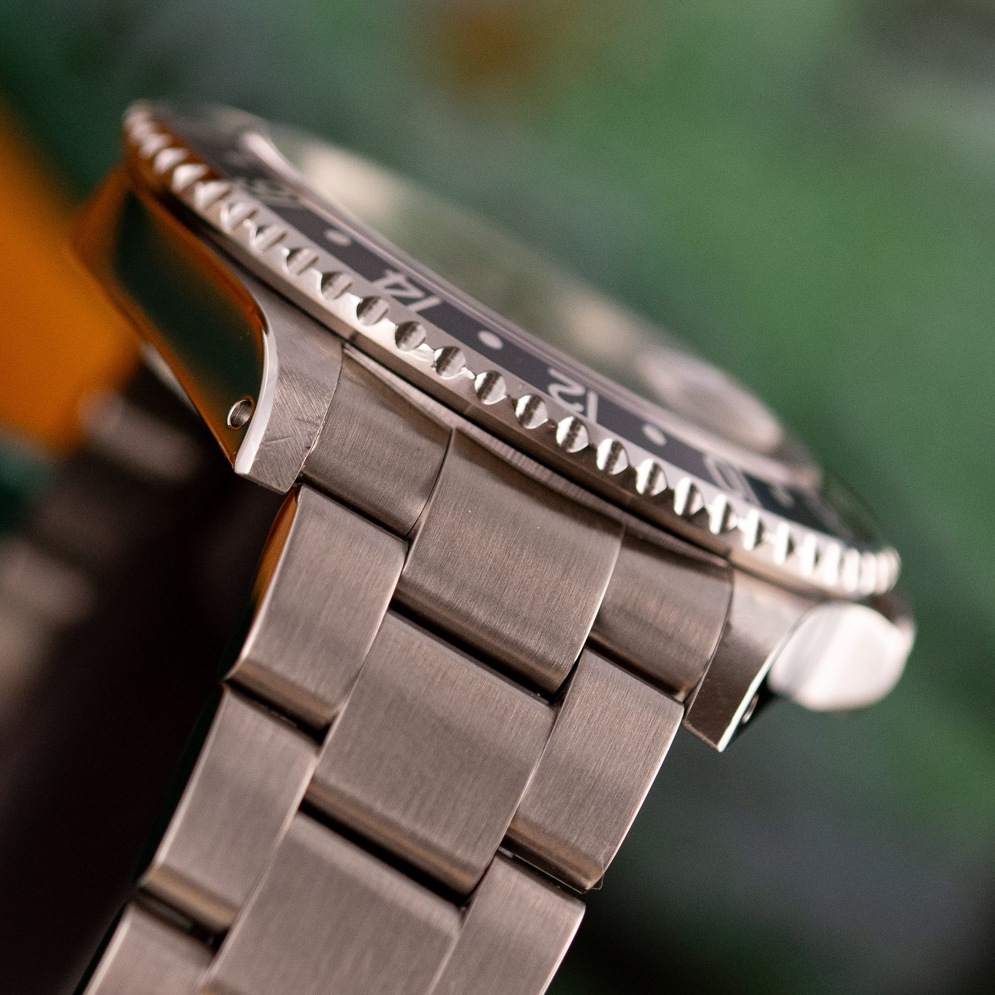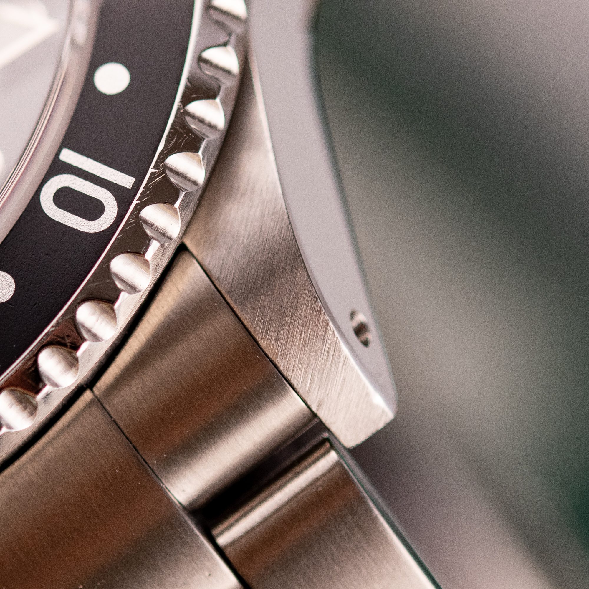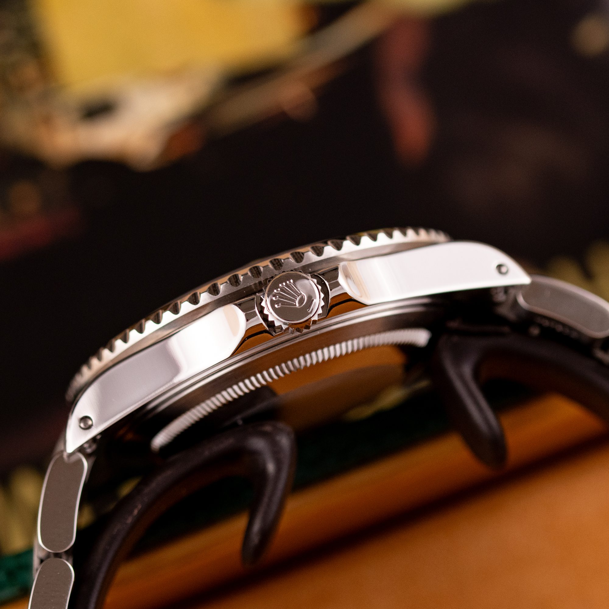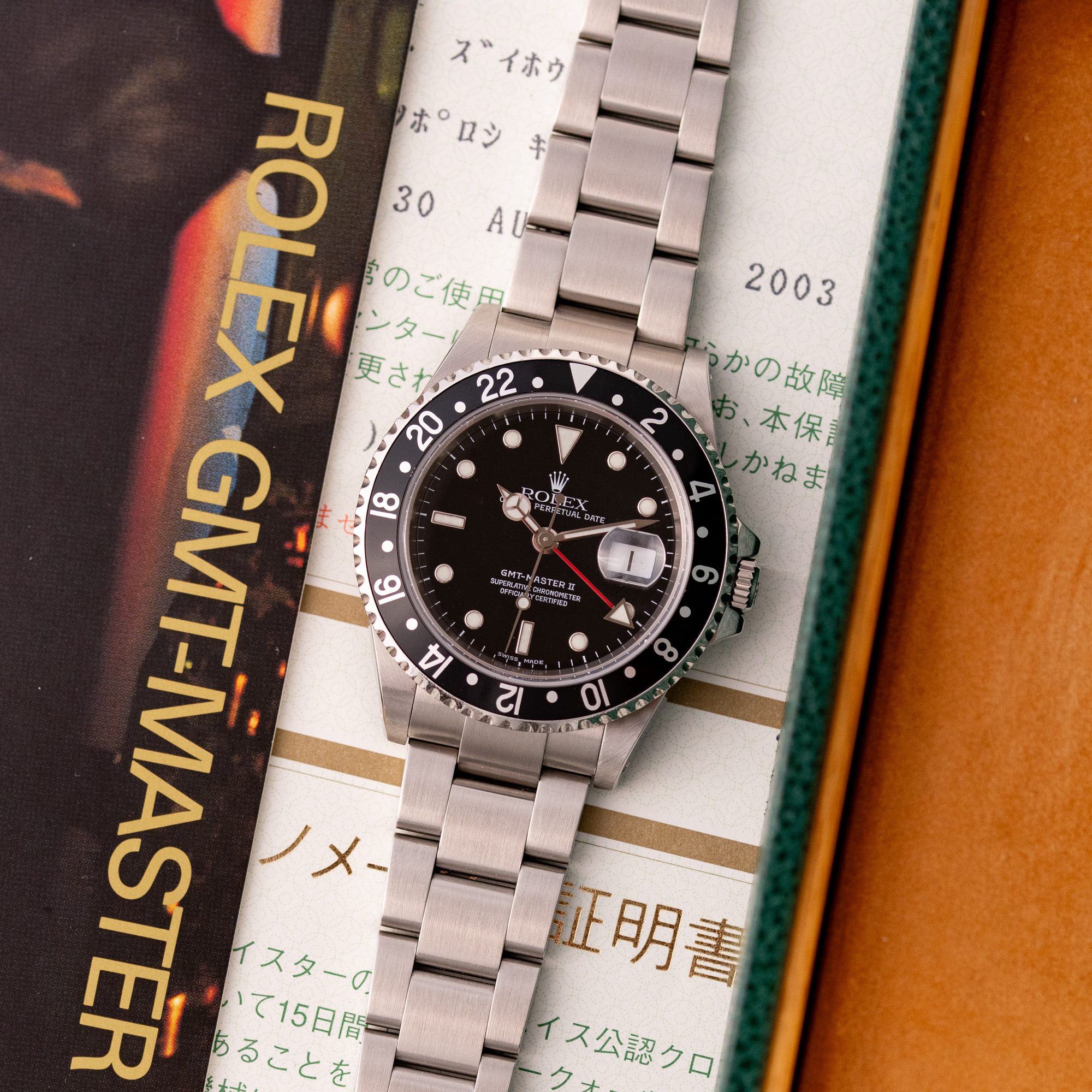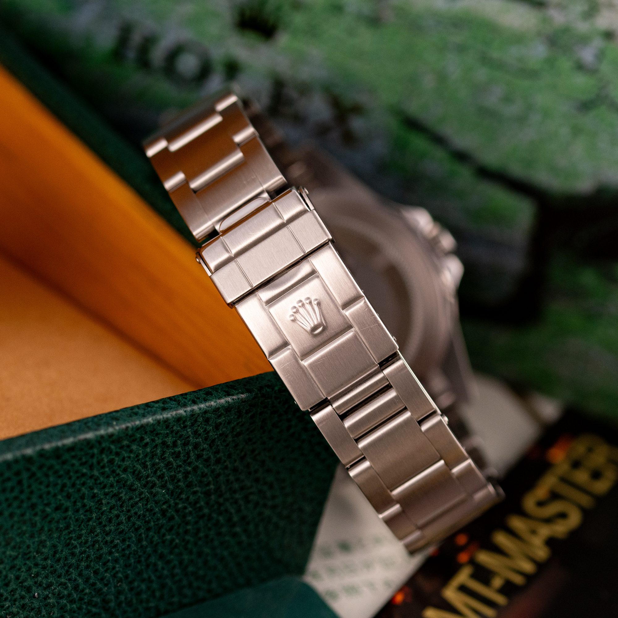 This particular piece, originally sold in 2003, features the LN (Lunette Noire) configuration with a full black bezel. The watch is in great condition with a very sharp case and a bracelet showing no stretch. It was serviced by Rolex in 2021 and comes as a full set with the original box and papers, making it an exceptional choice for any serious collection.