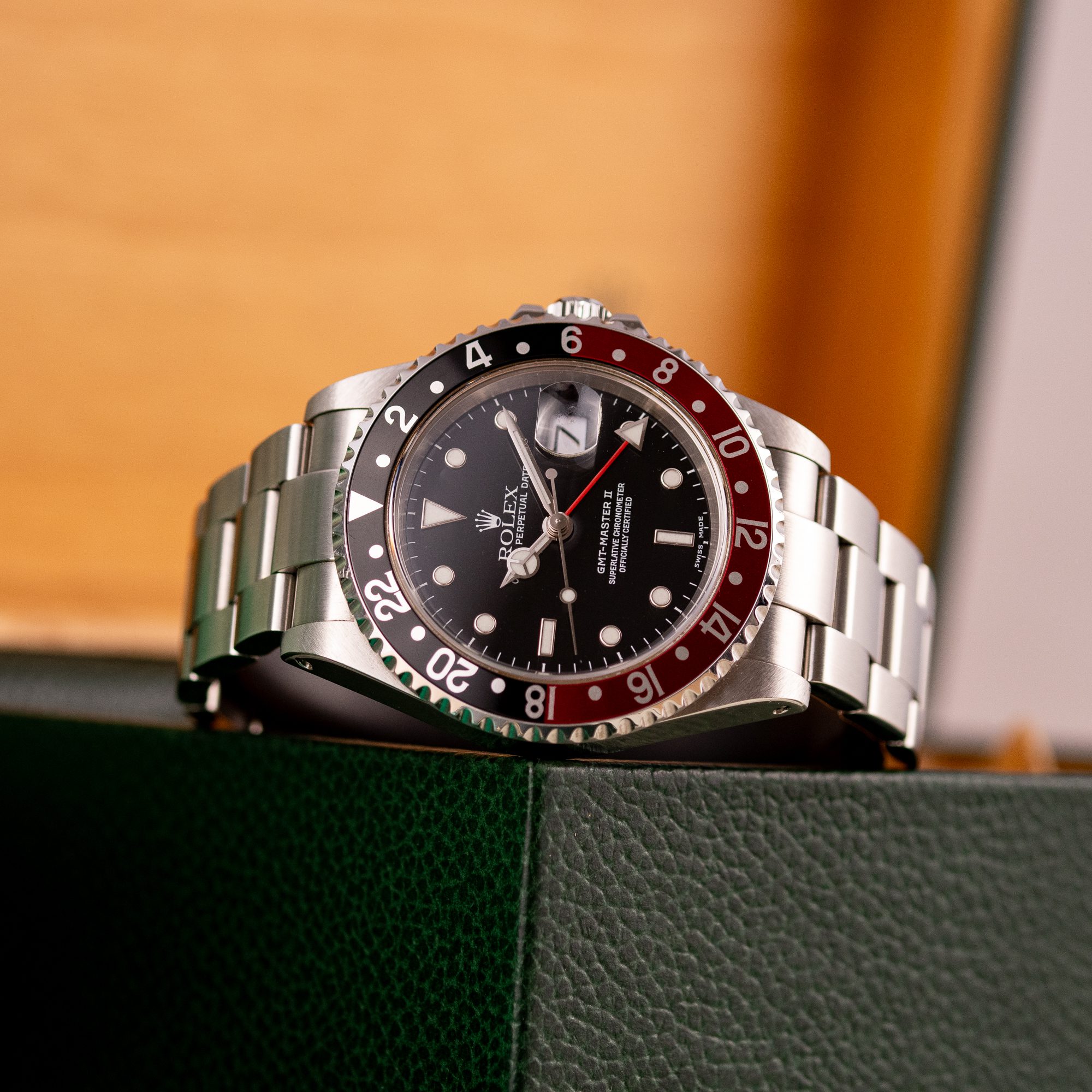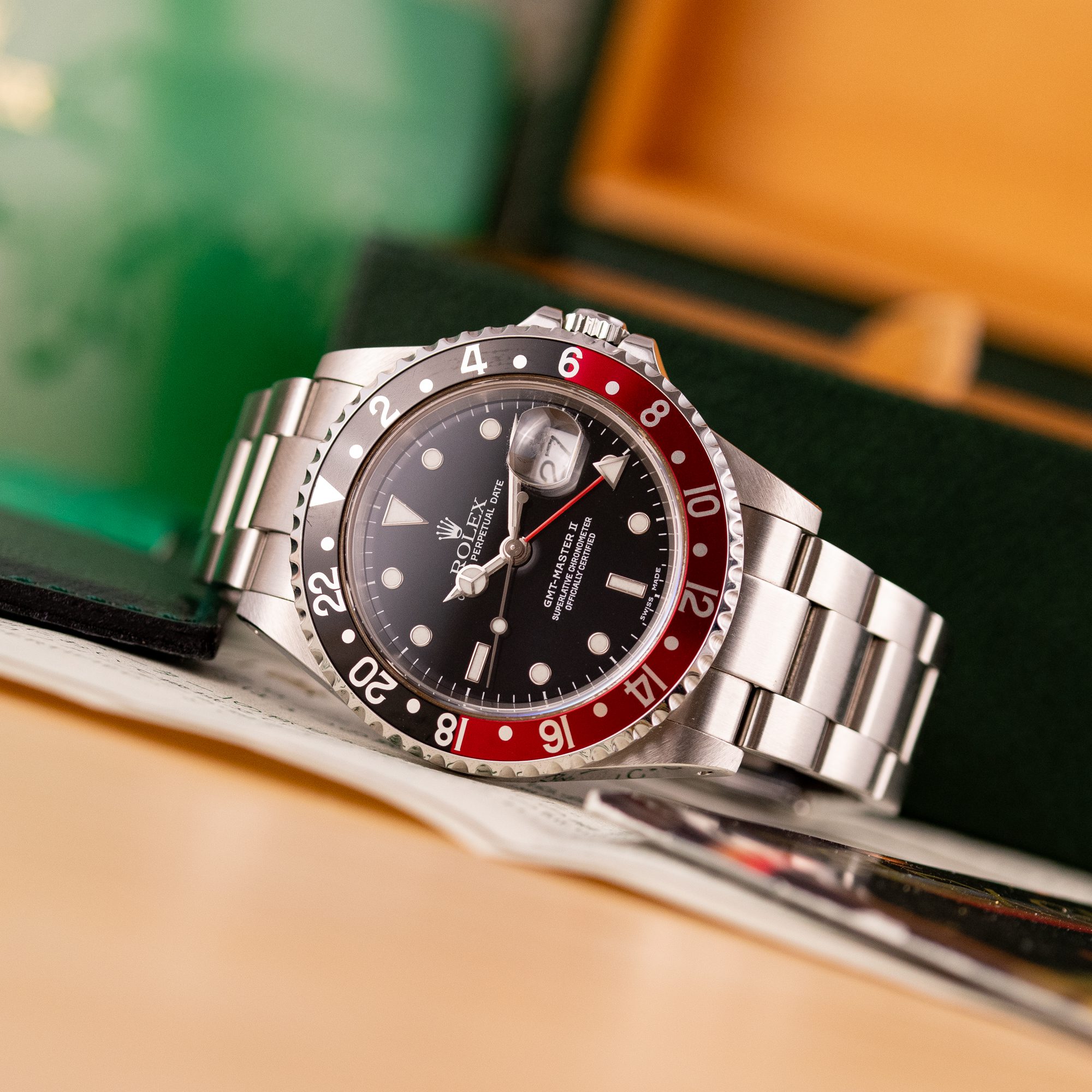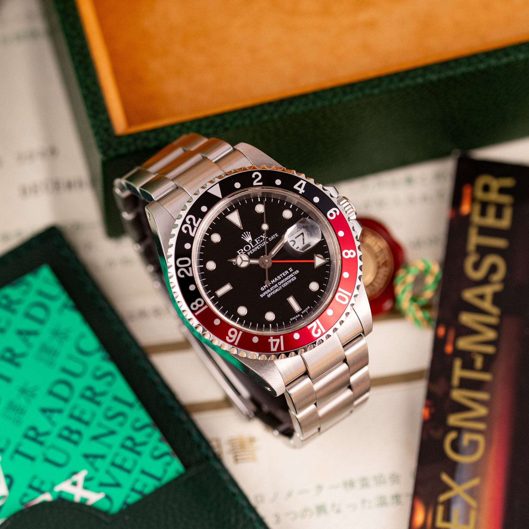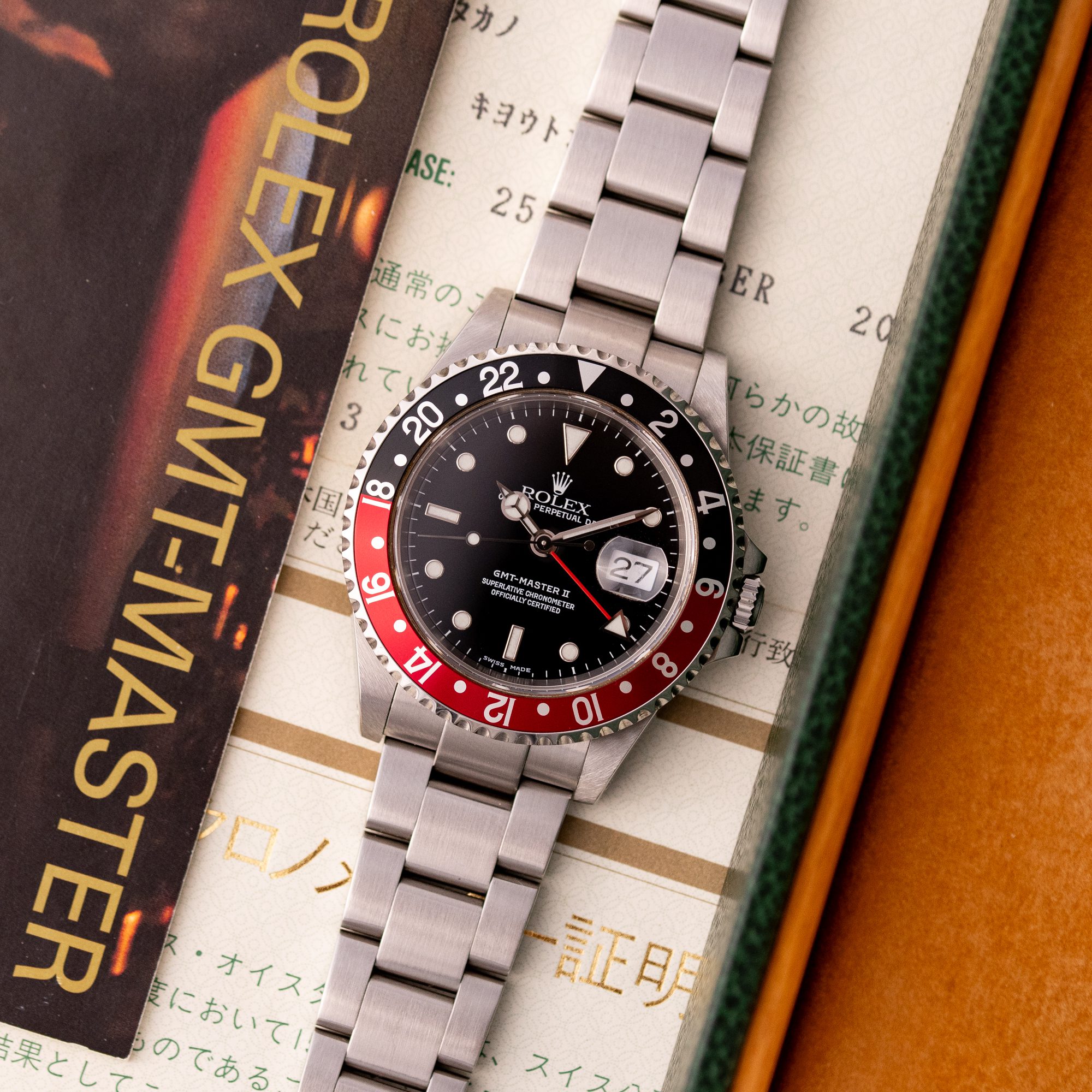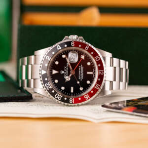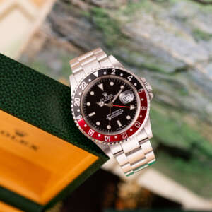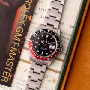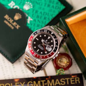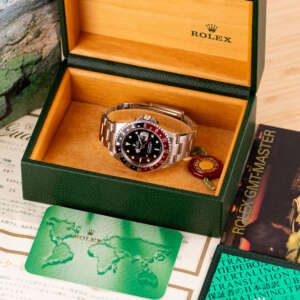 This particular piece, originally sold in 2000, features the classic red and black bezel configuration, commonly known as the “Coke.” The watch is in great condition with a very sharp case and a bracelet showing no stretch. It comes as a full set with the original box and papers, making it a highly desirable addition to any collection.