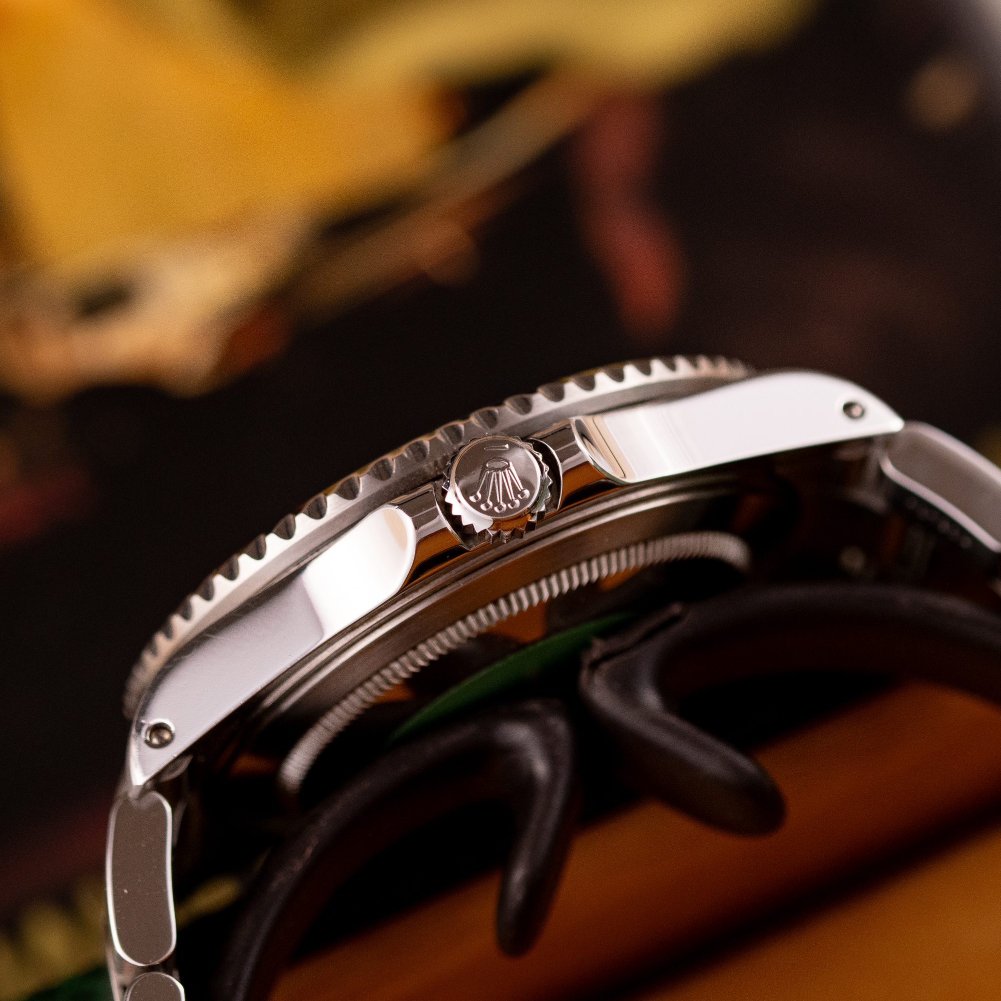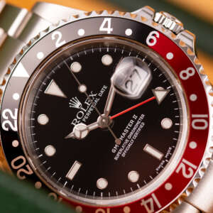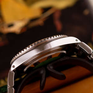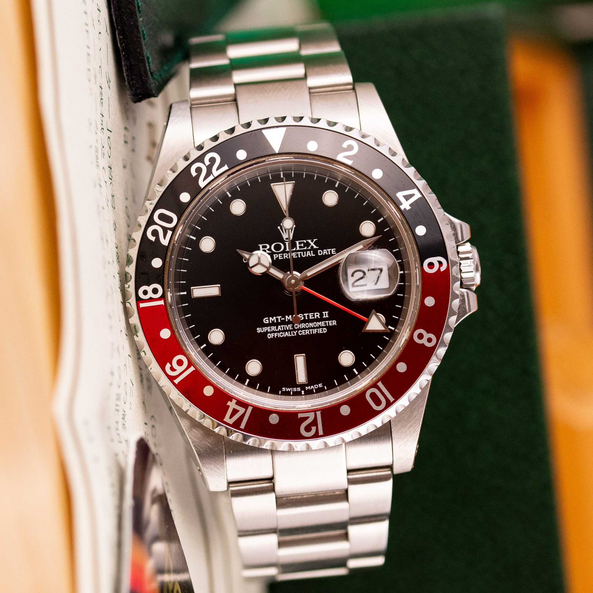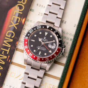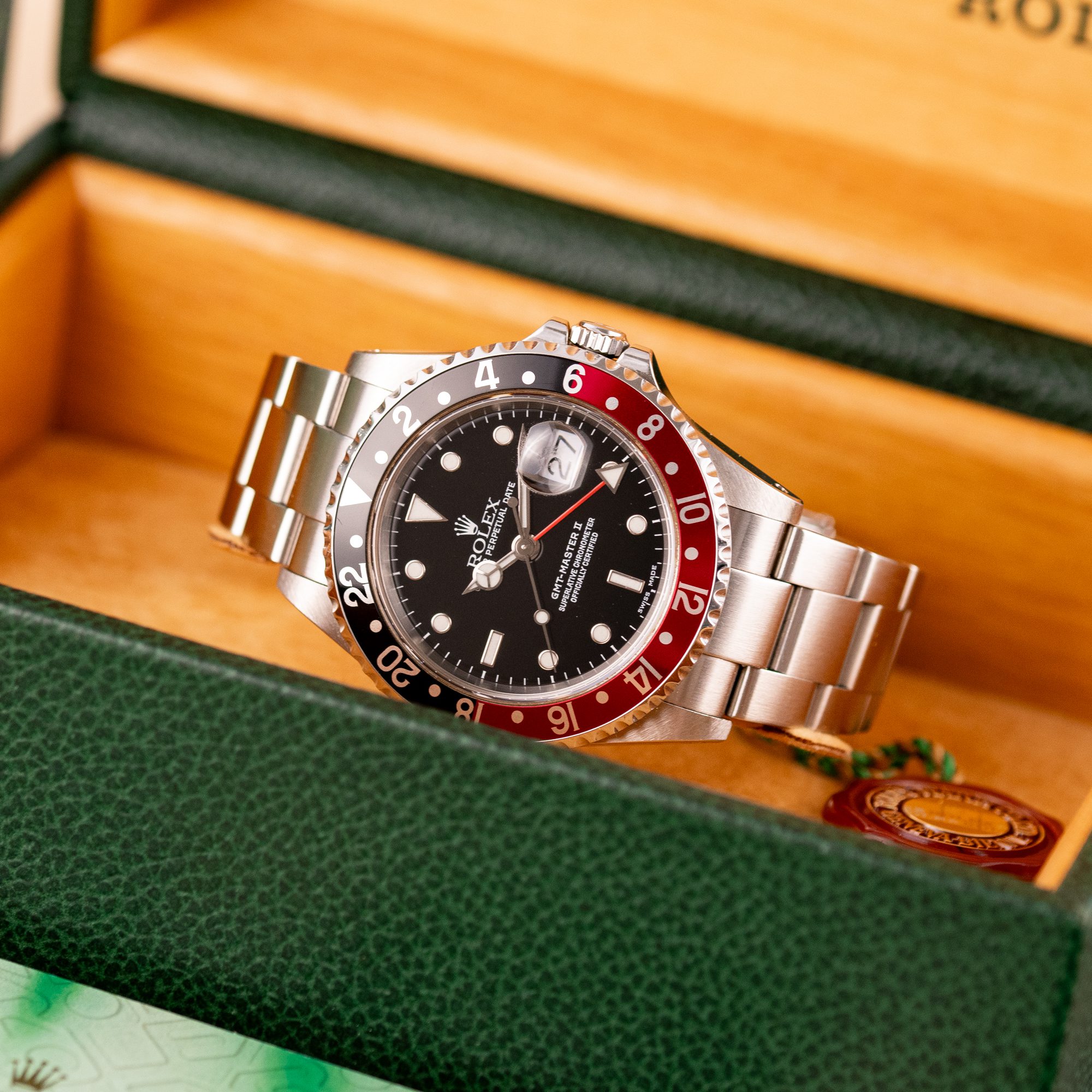 This particular piece, originally sold in 2000, features the classic red and black bezel configuration, commonly known as the “Coke.” The watch is in great condition with a very sharp case and a bracelet showing no stretch. It comes as a full set with the original box and papers, making it a highly desirable addition to any collection.