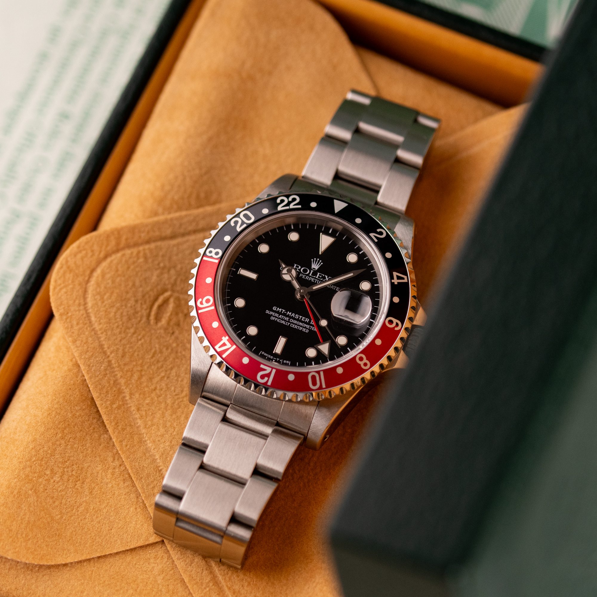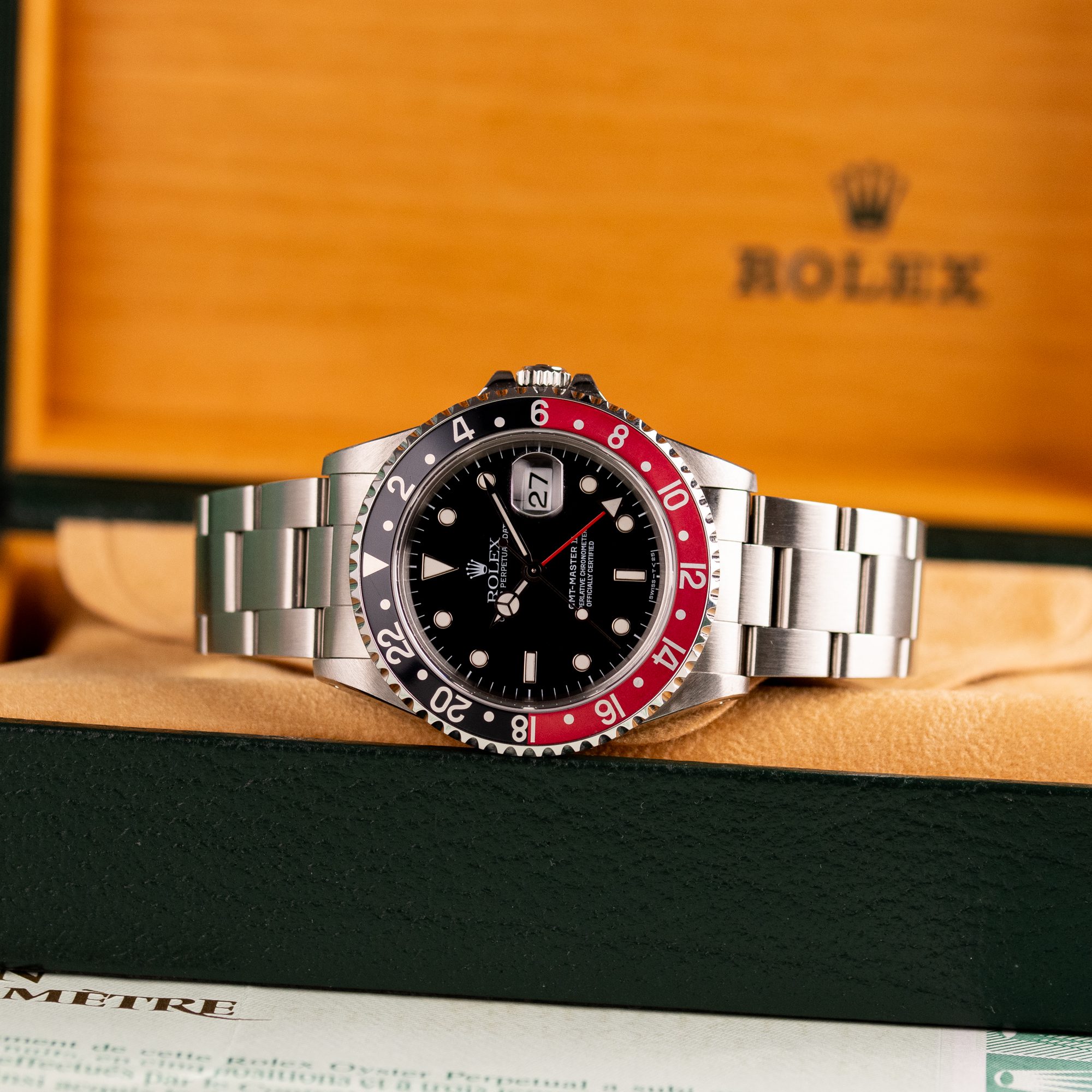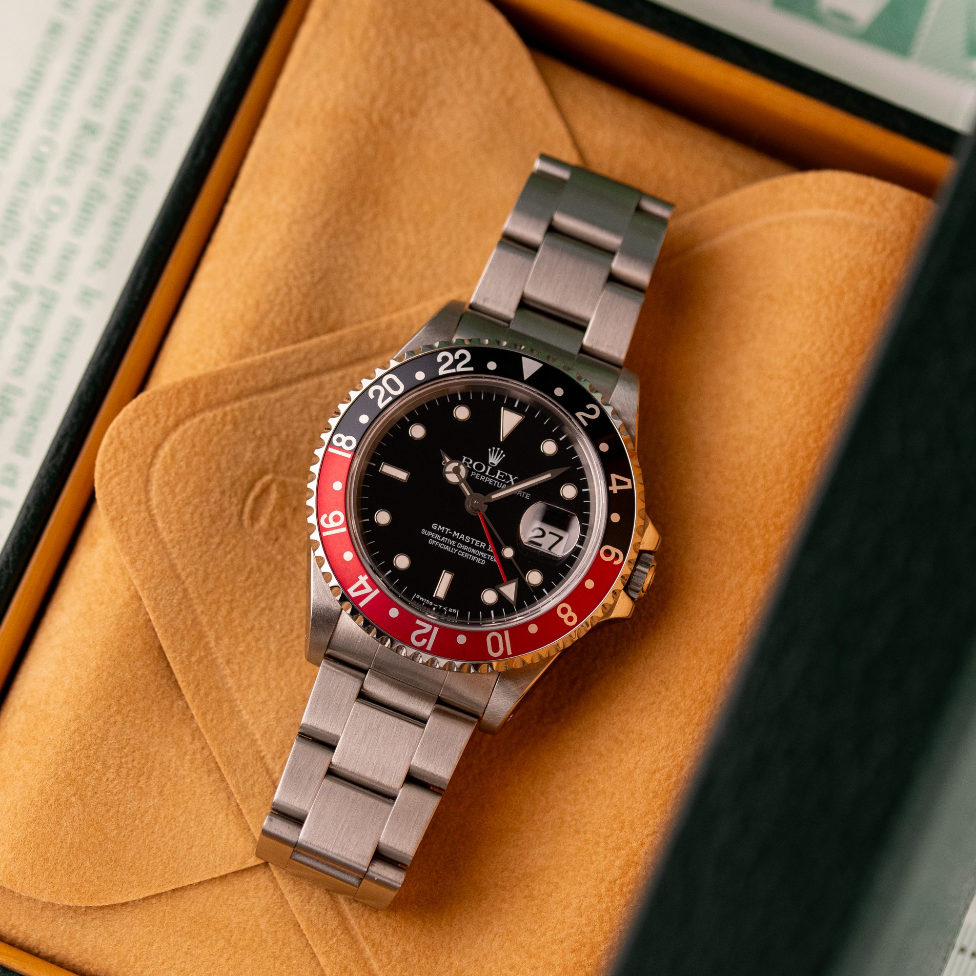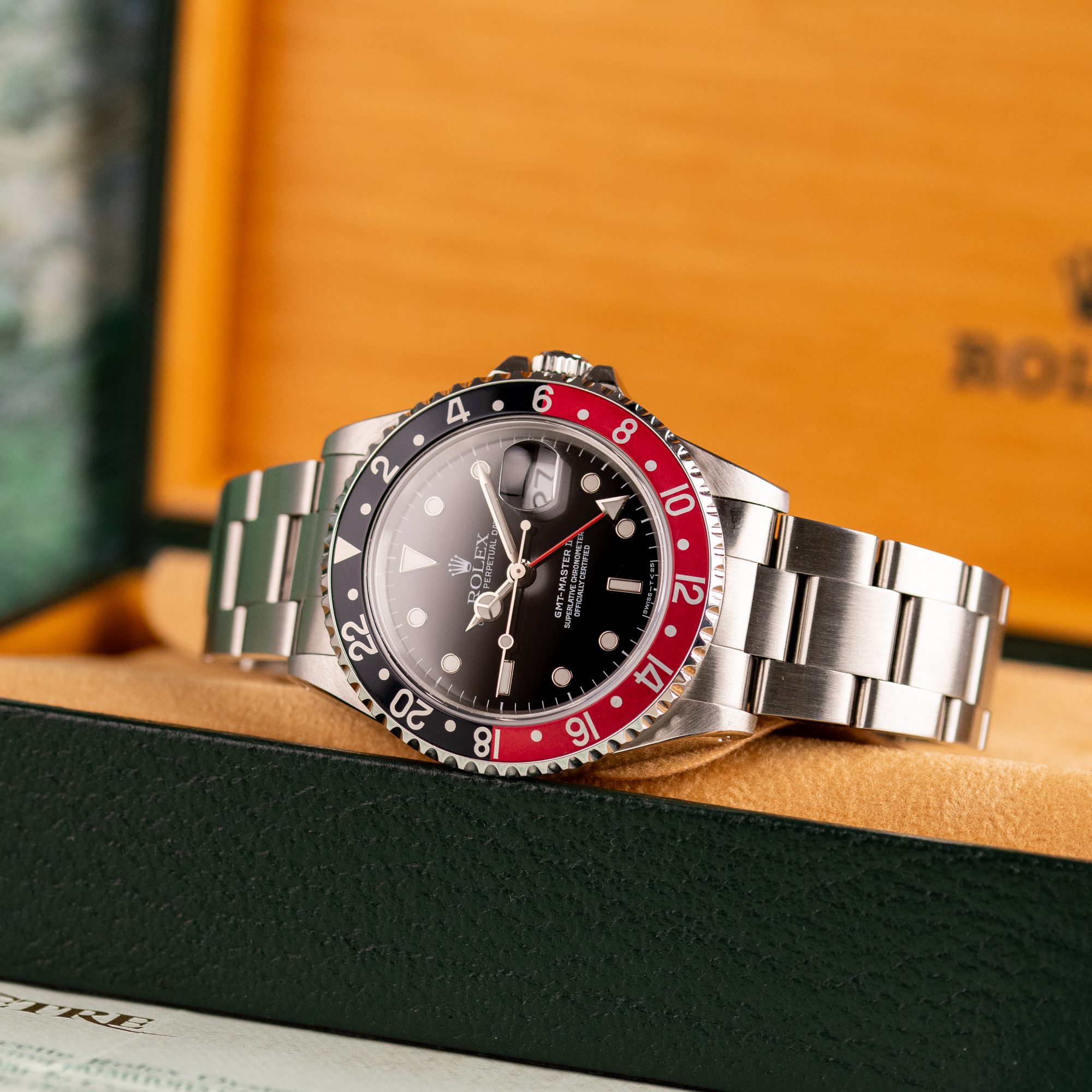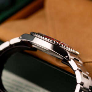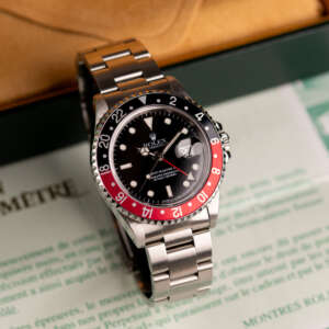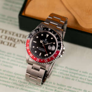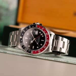 Originally sold in 1997, this example is in very good condition, with a fully functional automatic movement ensuring precise timekeeping and reliable performance. The Oyster bracelet, sized for wrists up to 18 cm, exhibits minimal wear, maintaining its sturdy construction. Presented as a full set with its original Rolex box and papers, this GMT Master II Coke is an excellent choice for collectors or those seeking a well-preserved, iconic timepiece.