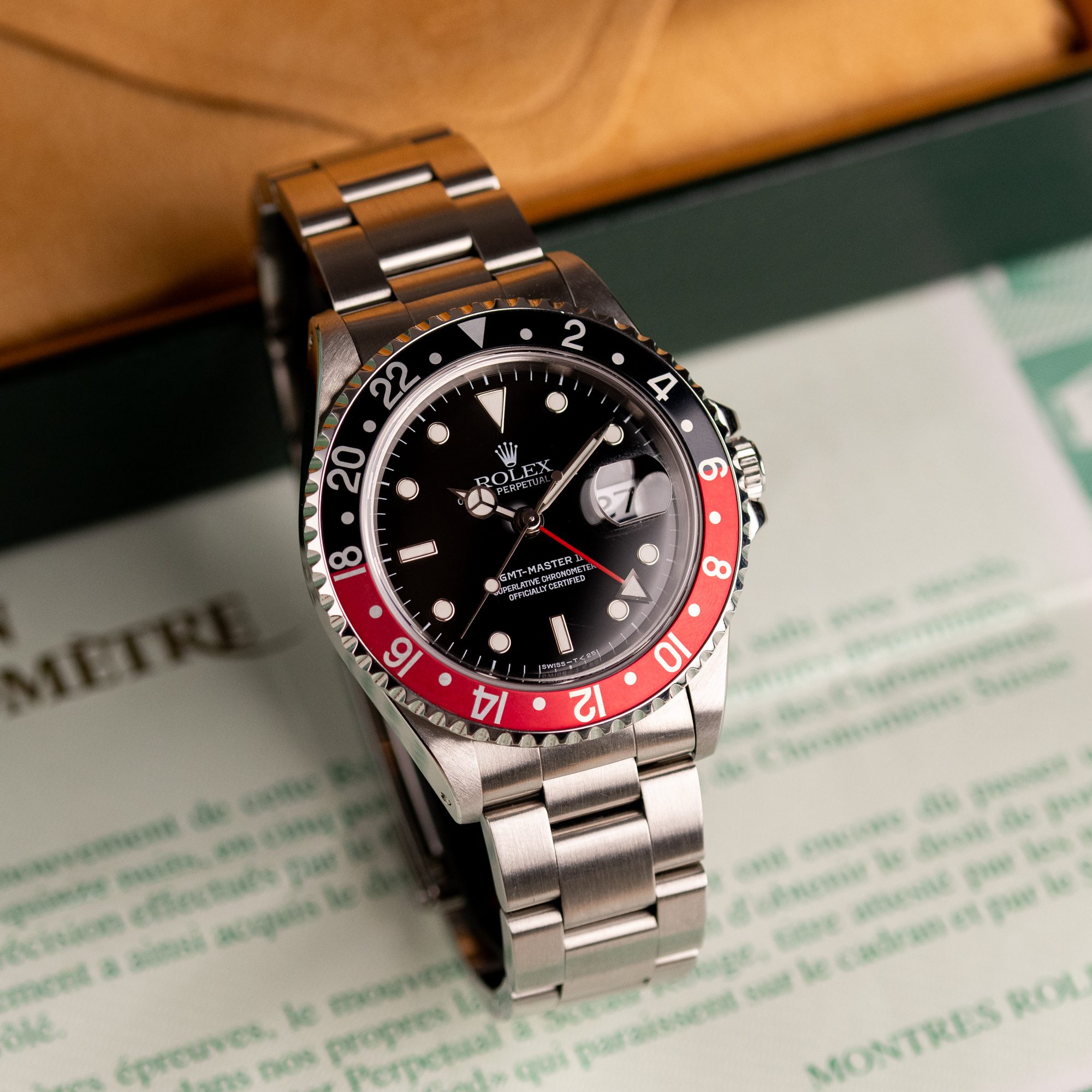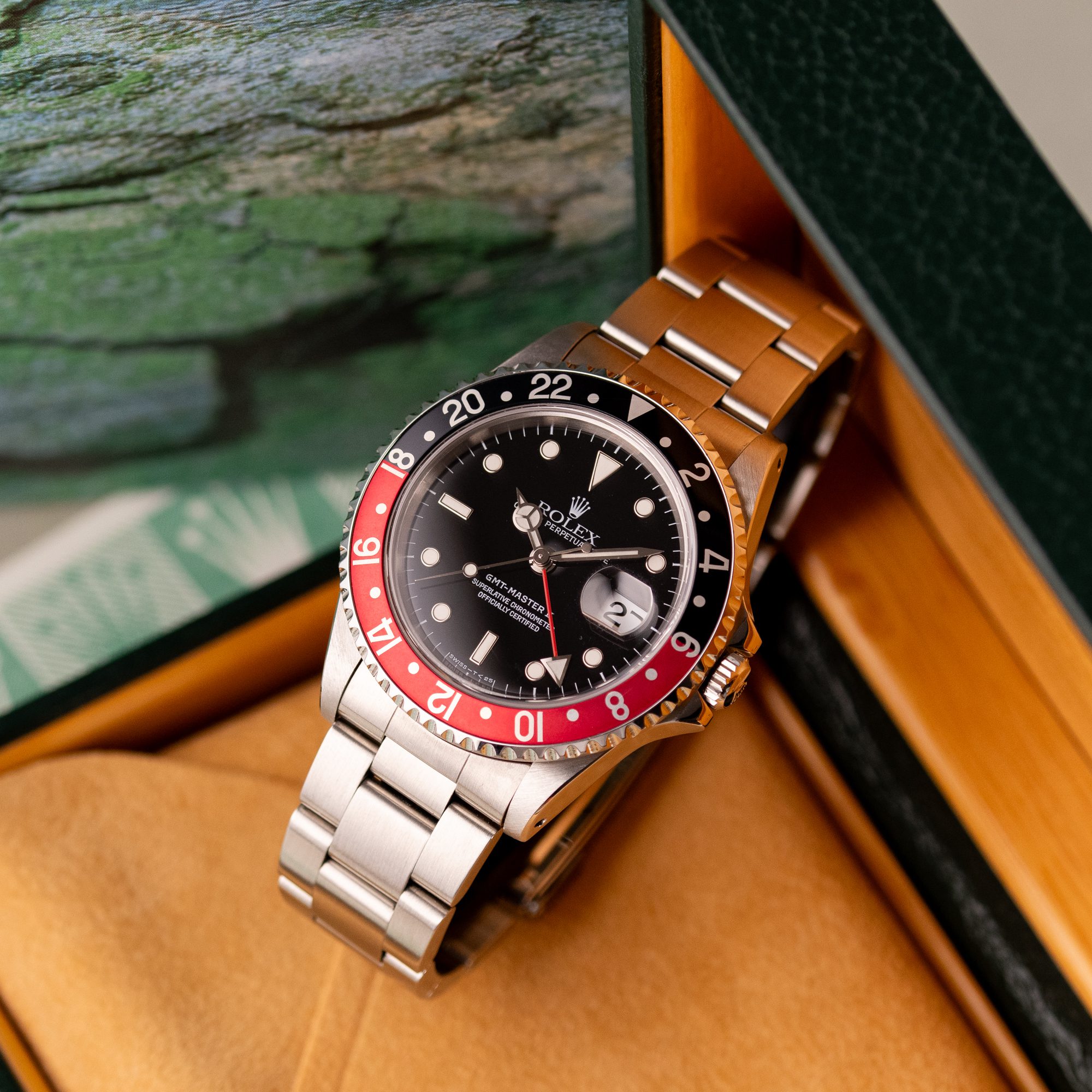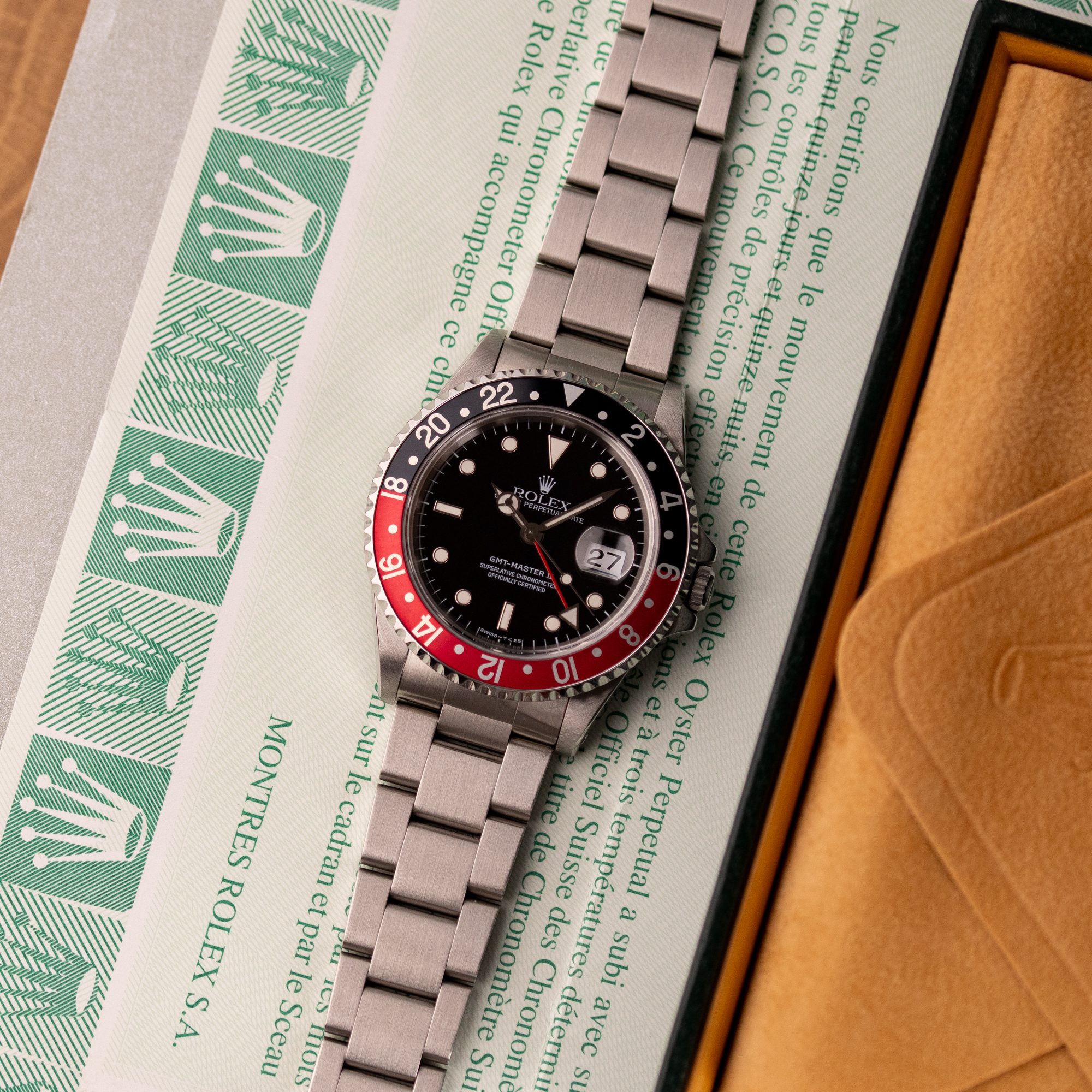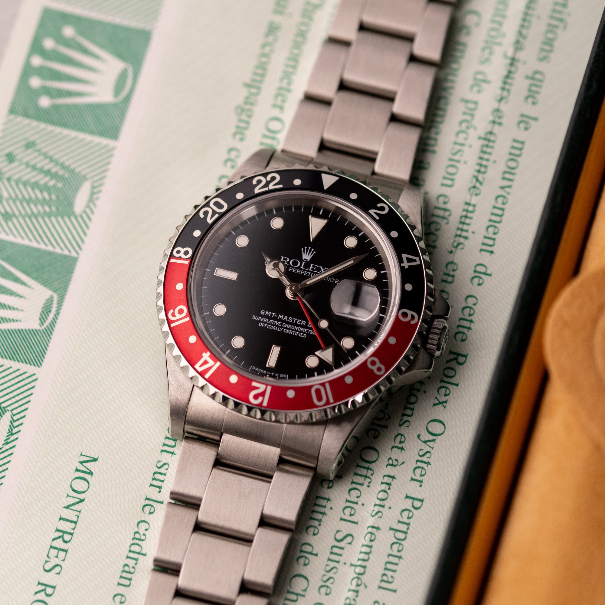 Originally sold in 1997, this example is in very good condition, with a fully functional automatic movement ensuring precise timekeeping and reliable performance. The Oyster bracelet, sized for wrists up to 18 cm, exhibits minimal wear, maintaining its sturdy construction. Presented as a full set with its original Rolex box and papers, this GMT Master II Coke is an excellent choice for collectors or those seeking a well-preserved, iconic timepiece.