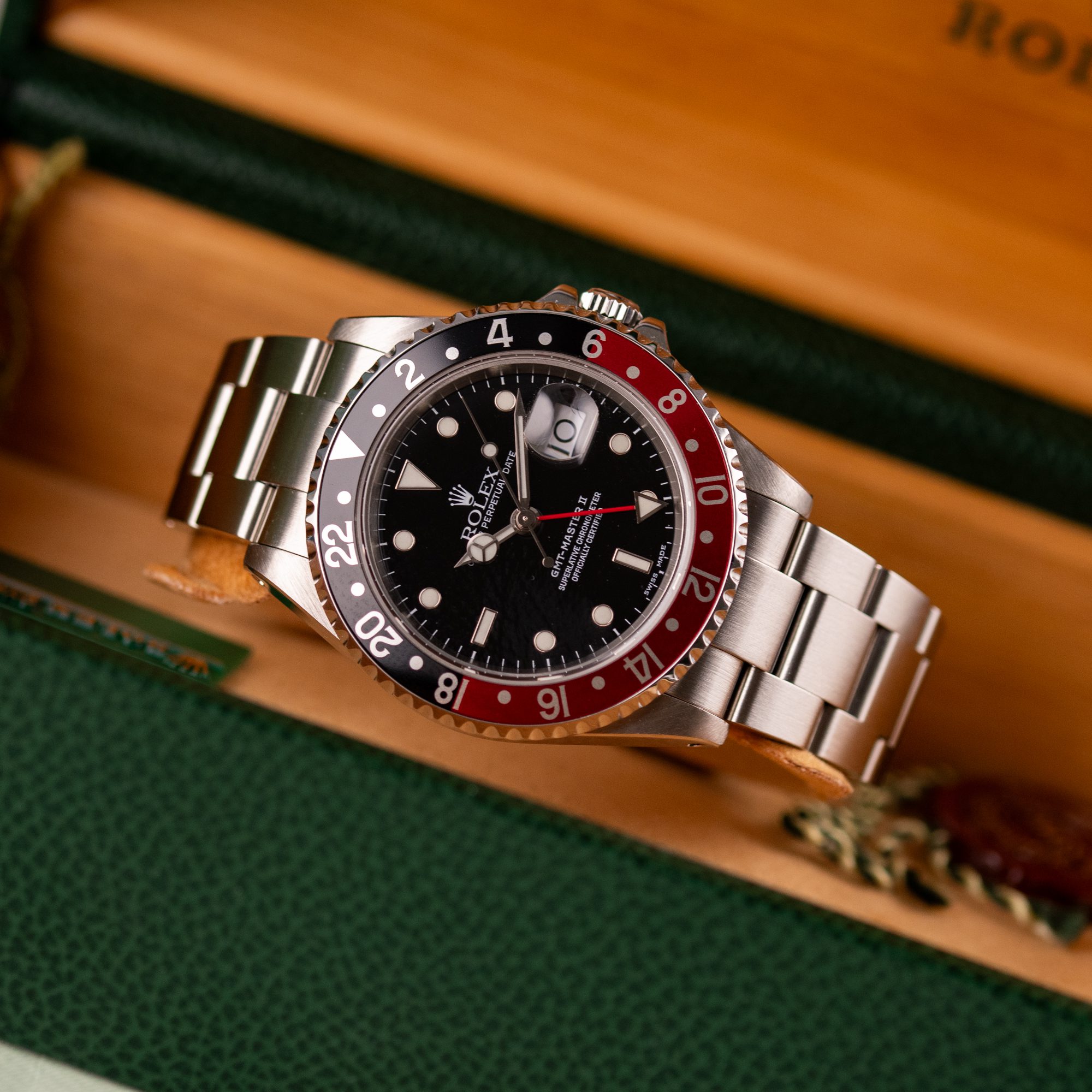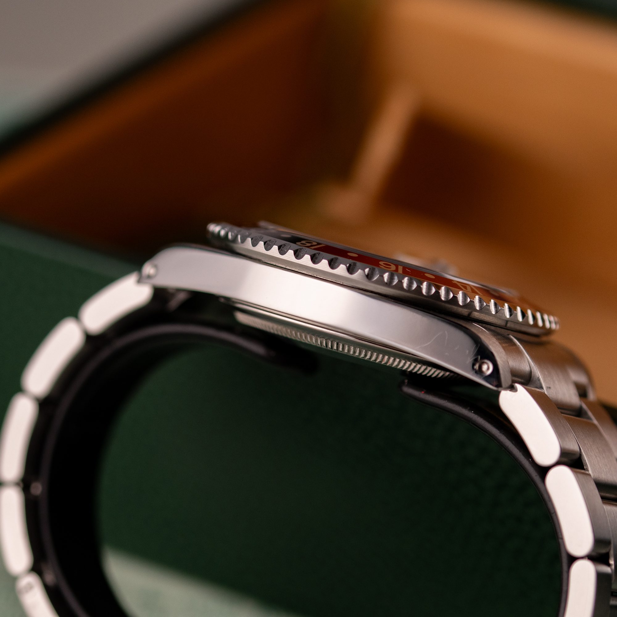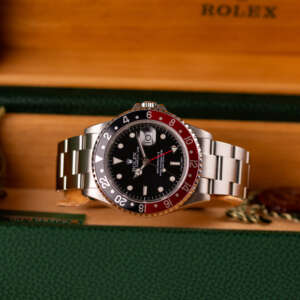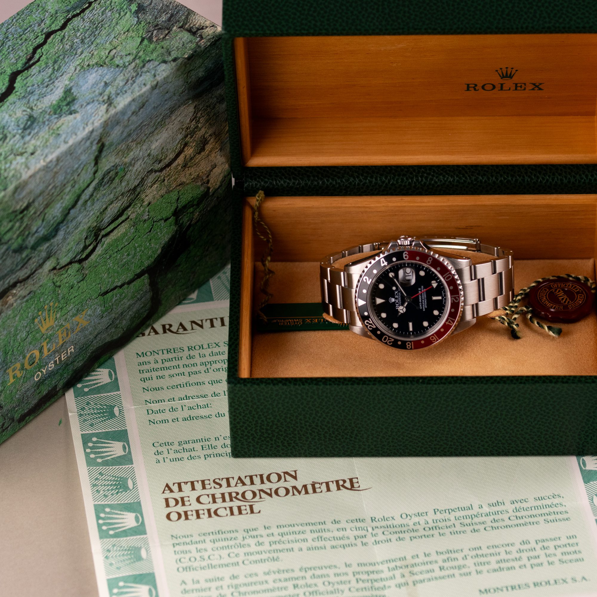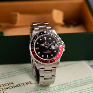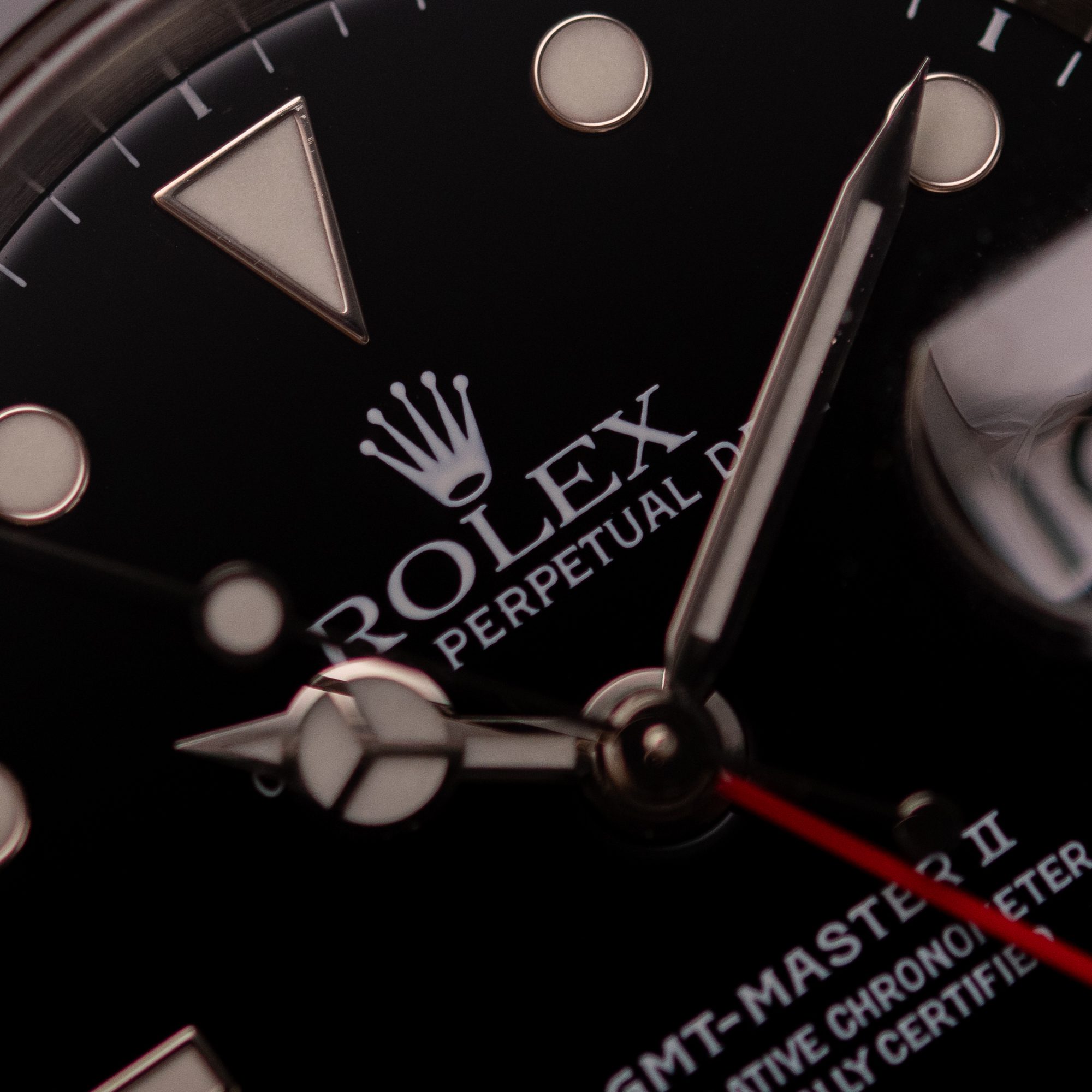 Originally sold in 2002, this example is in very good condition, freshly after a full service to ensure the automatic movement’s full functionality and precise timekeeping. The Oyster bracelet, sized for wrists up to 18 cm, shows minimal wear, maintaining its robust structure. Presented as a full set with its original Rolex box and papers, this GMT Master II is an excellent choice for collectors or those seeking a well-maintained, iconic timepiece.