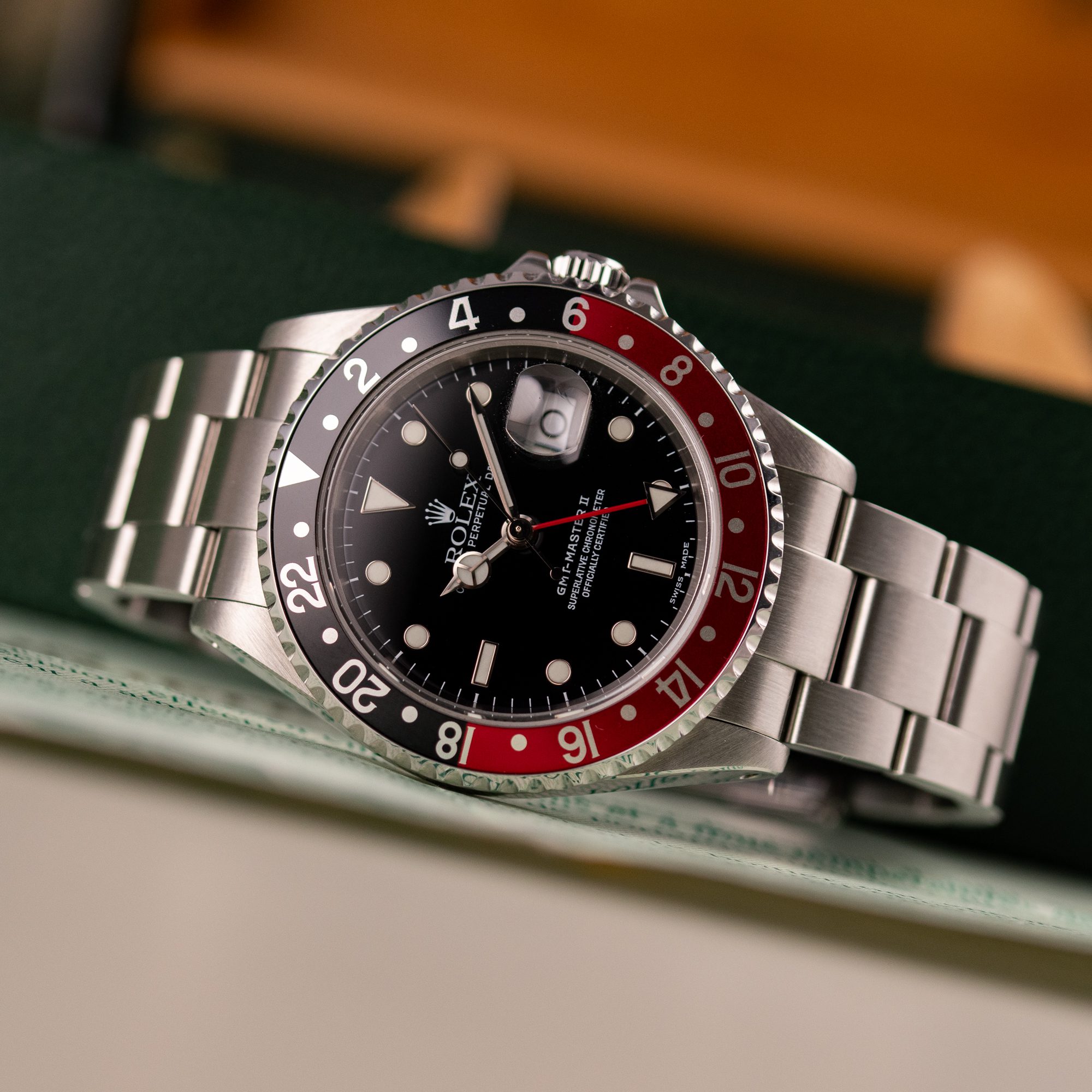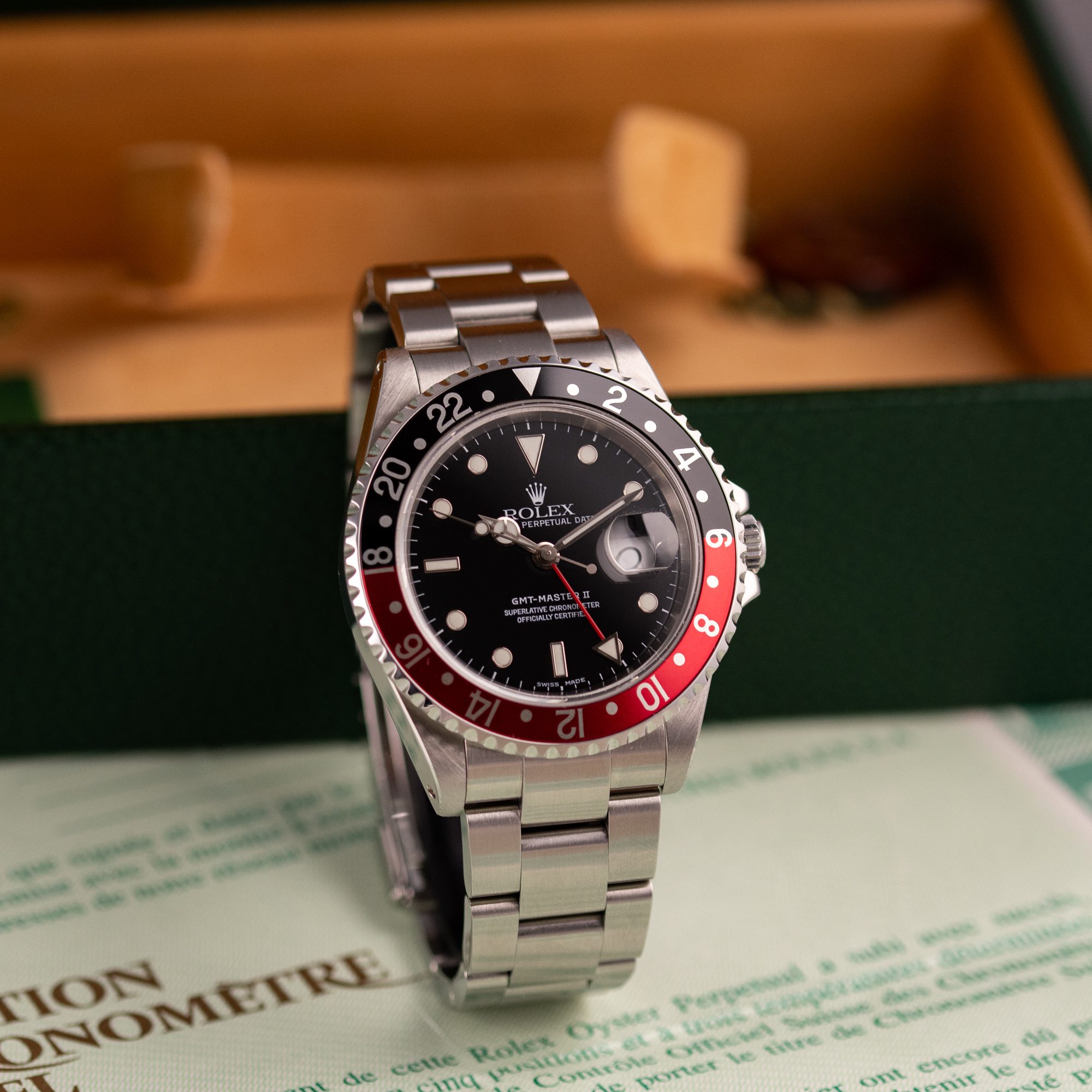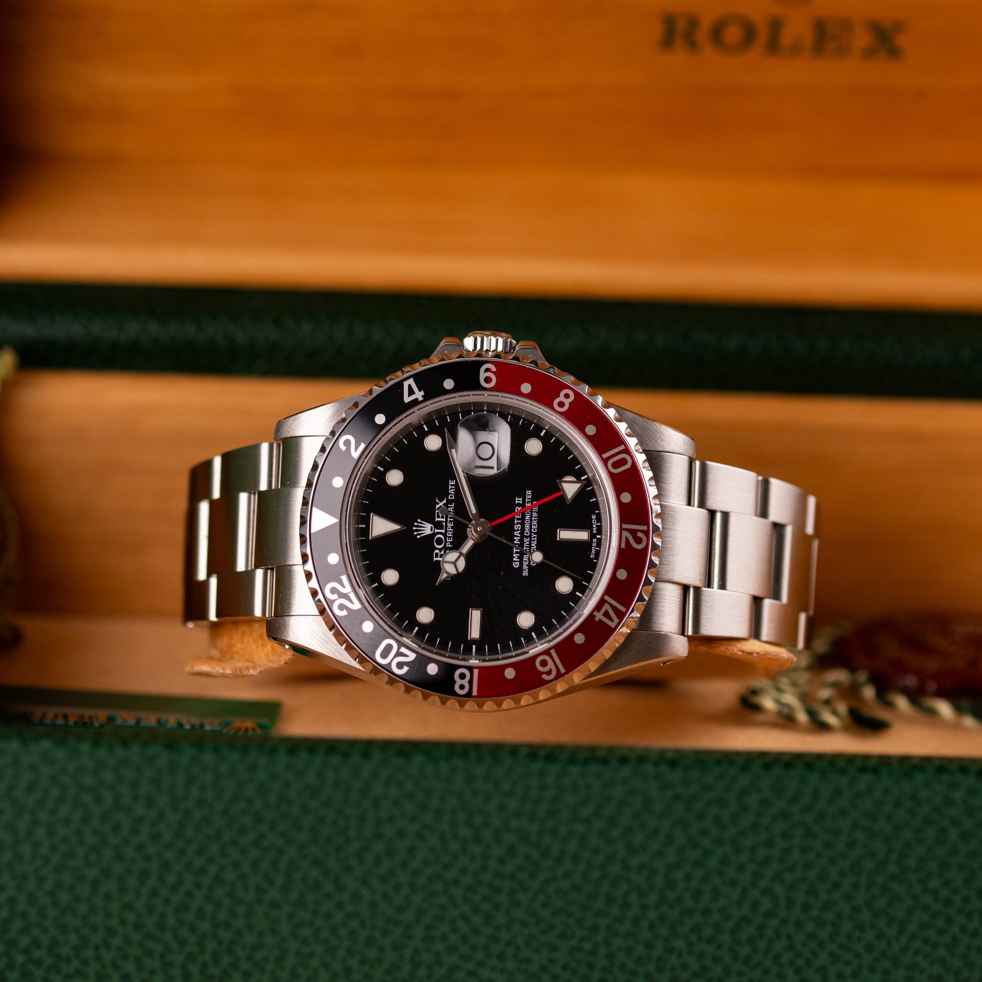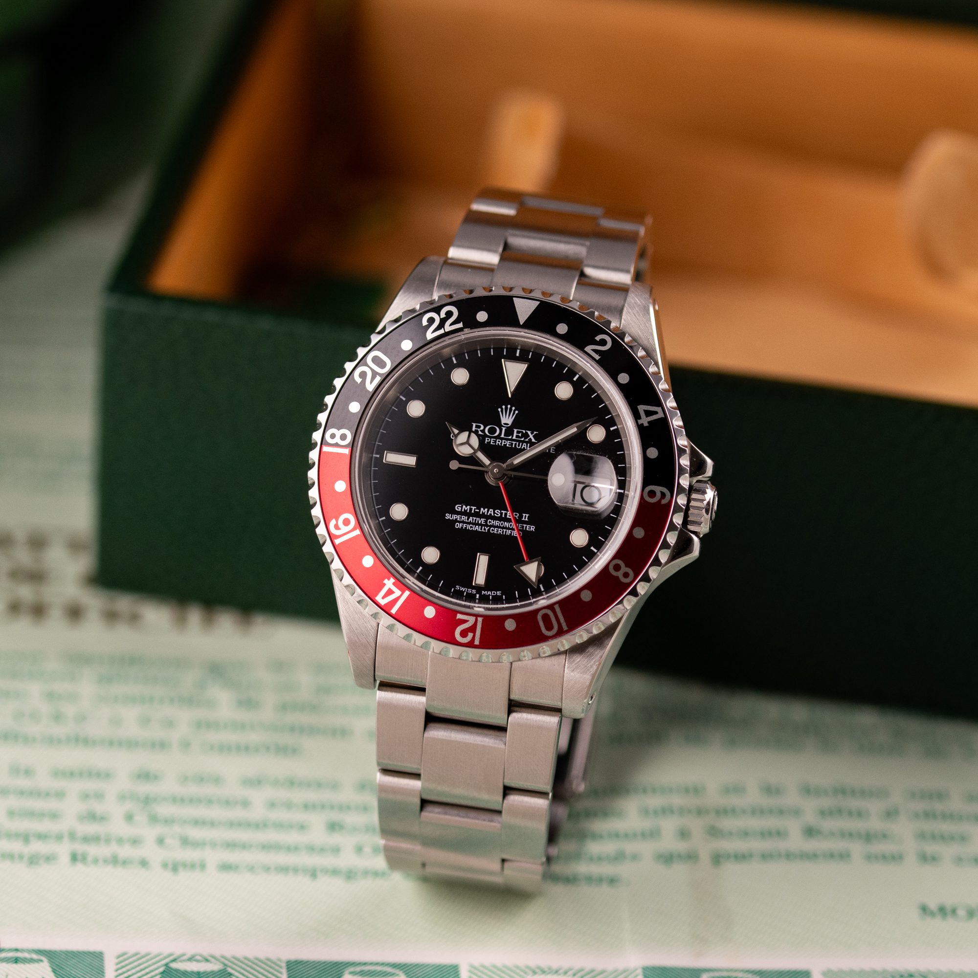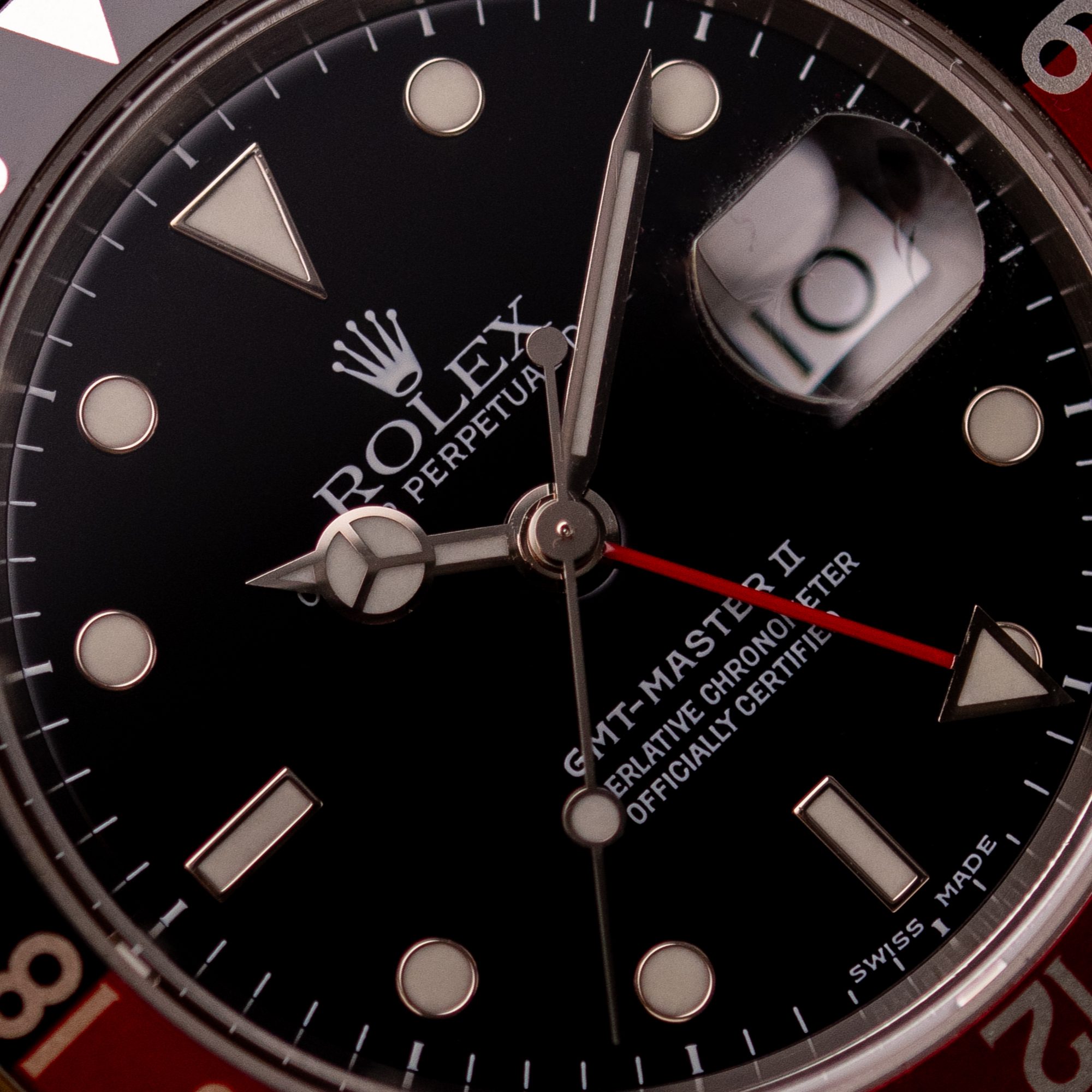 Originally sold in 2002, this example is in very good condition, freshly after a full service to ensure the automatic movement’s full functionality and precise timekeeping. The Oyster bracelet, sized for wrists up to 18 cm, shows minimal wear, maintaining its robust structure. Presented as a full set with its original Rolex box and papers, this GMT Master II is an excellent choice for collectors or those seeking a well-maintained, iconic timepiece.