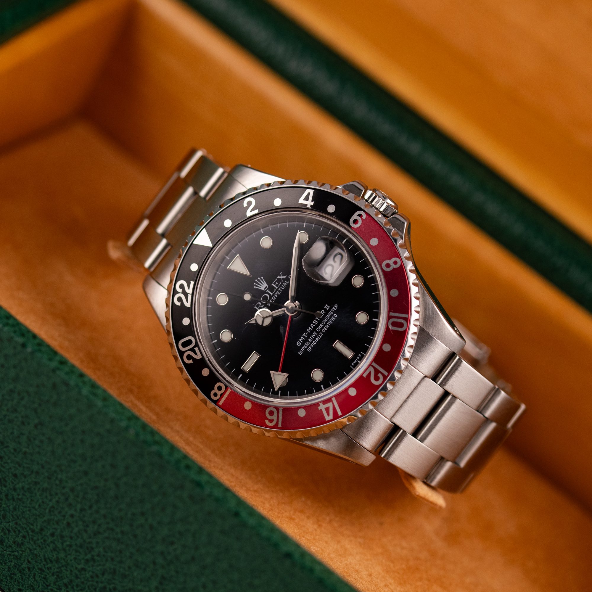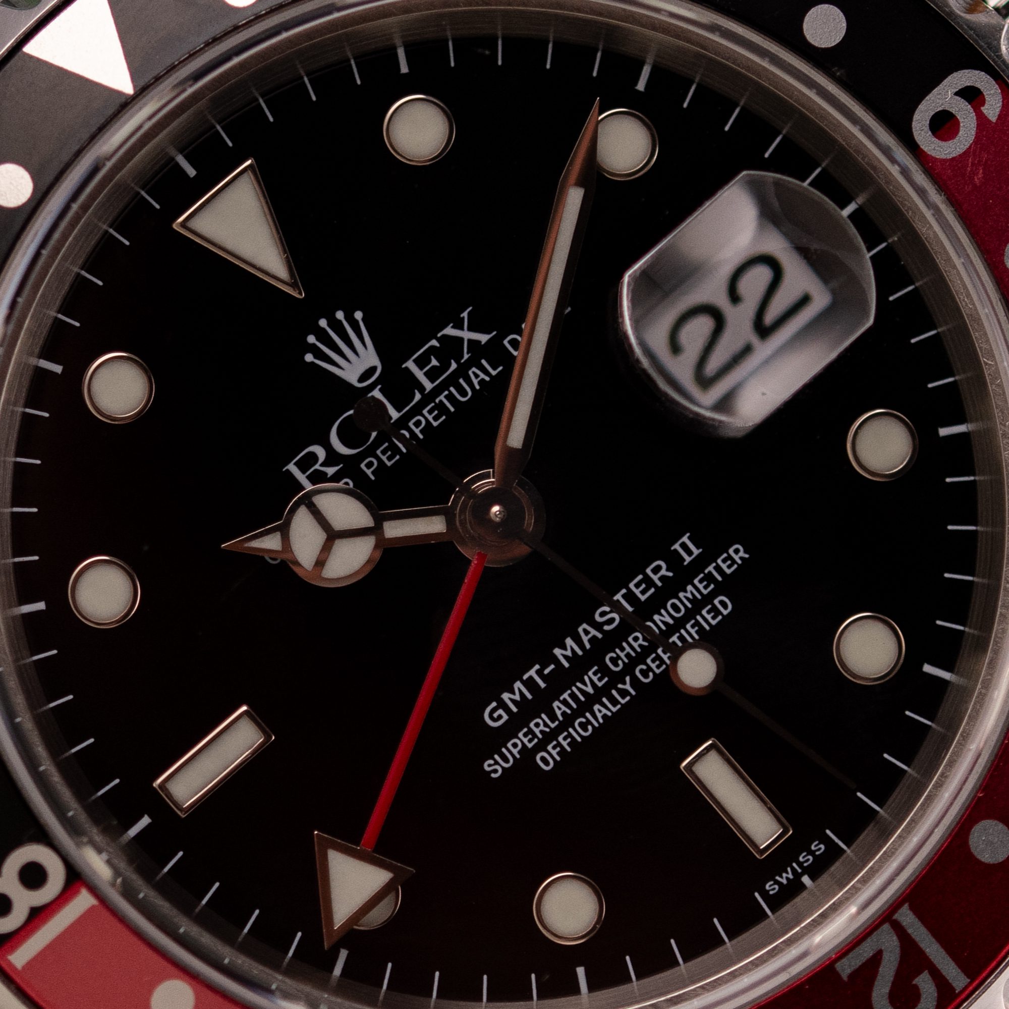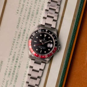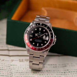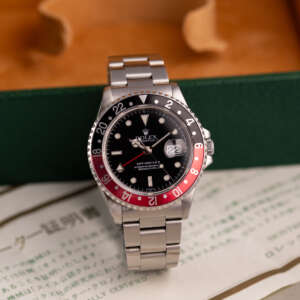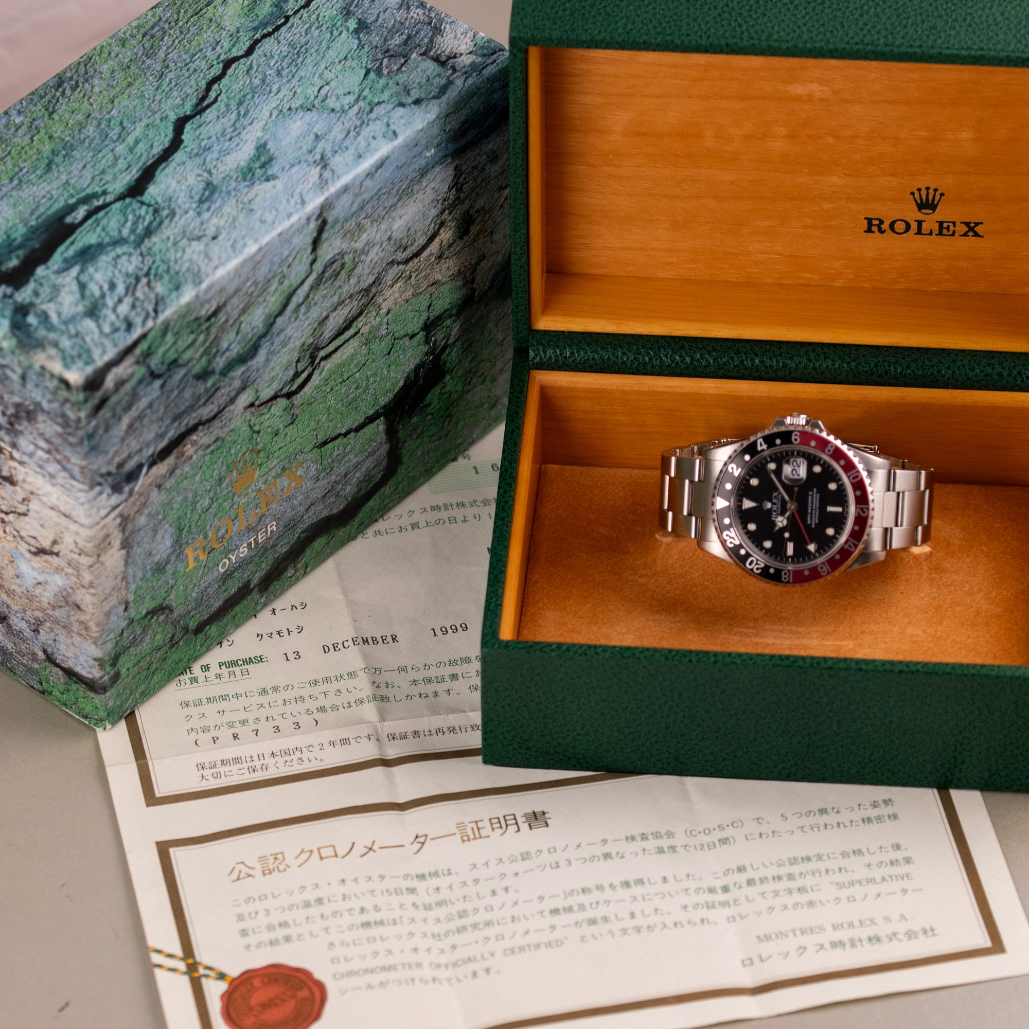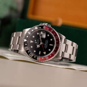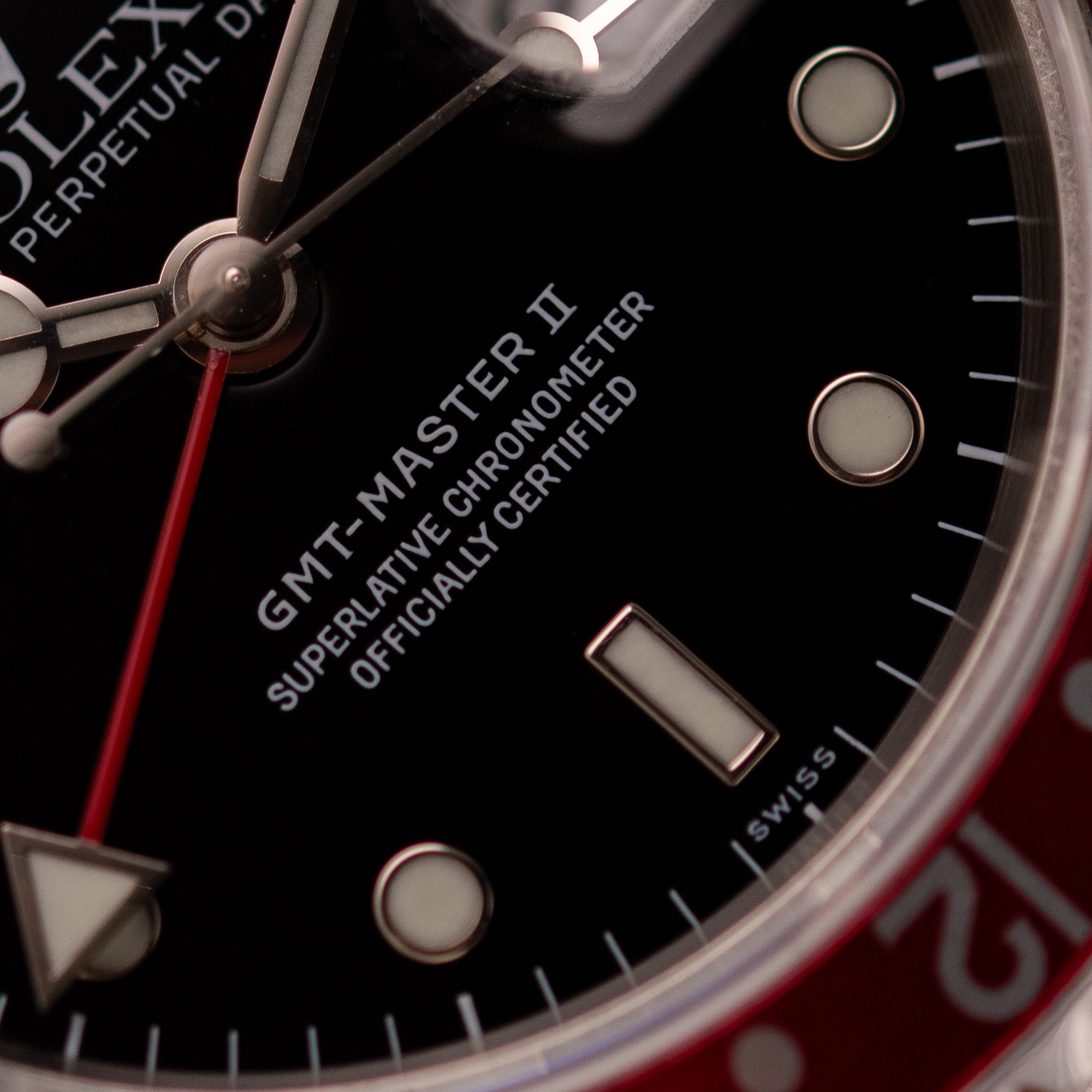 Originally sold in 1999, this example is equipped with a transitional “Swiss Only” dial produced for only one year, adding a collectible appeal to its vintage character. The watch is in very good condition, with a fully functional automatic movement, an unscratched bezel, and a recently completed full watchmaker service ensuring optimal performance. The Oyster bracelet, sized for wrists up to 18 cm, shows minimal wear while maintaining its robust structure. Presented as a full set with its original Rolex box and papers, this GMT Master II is an excellent choice for collectors or those seeking a well-maintained, historically significant timepiece.