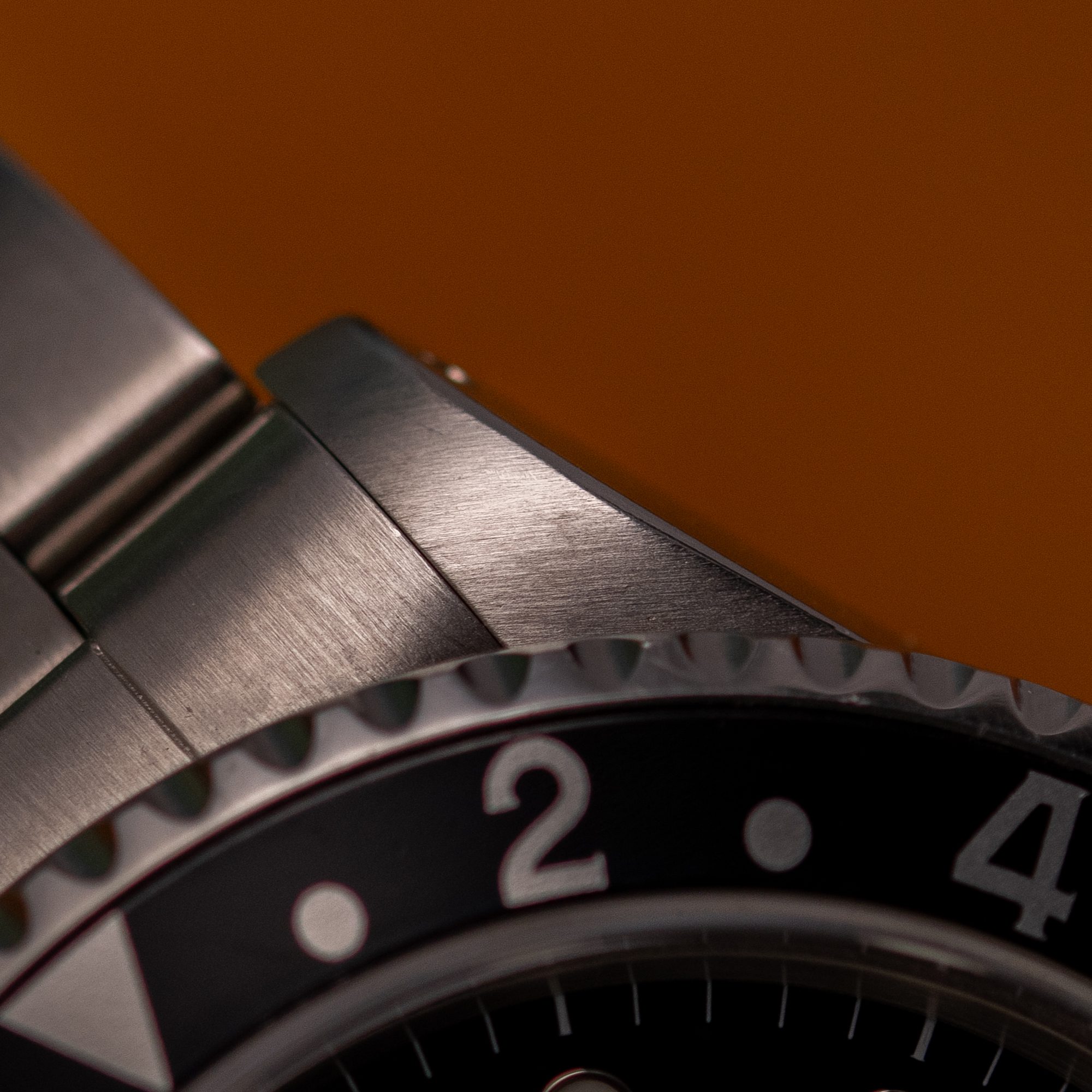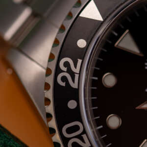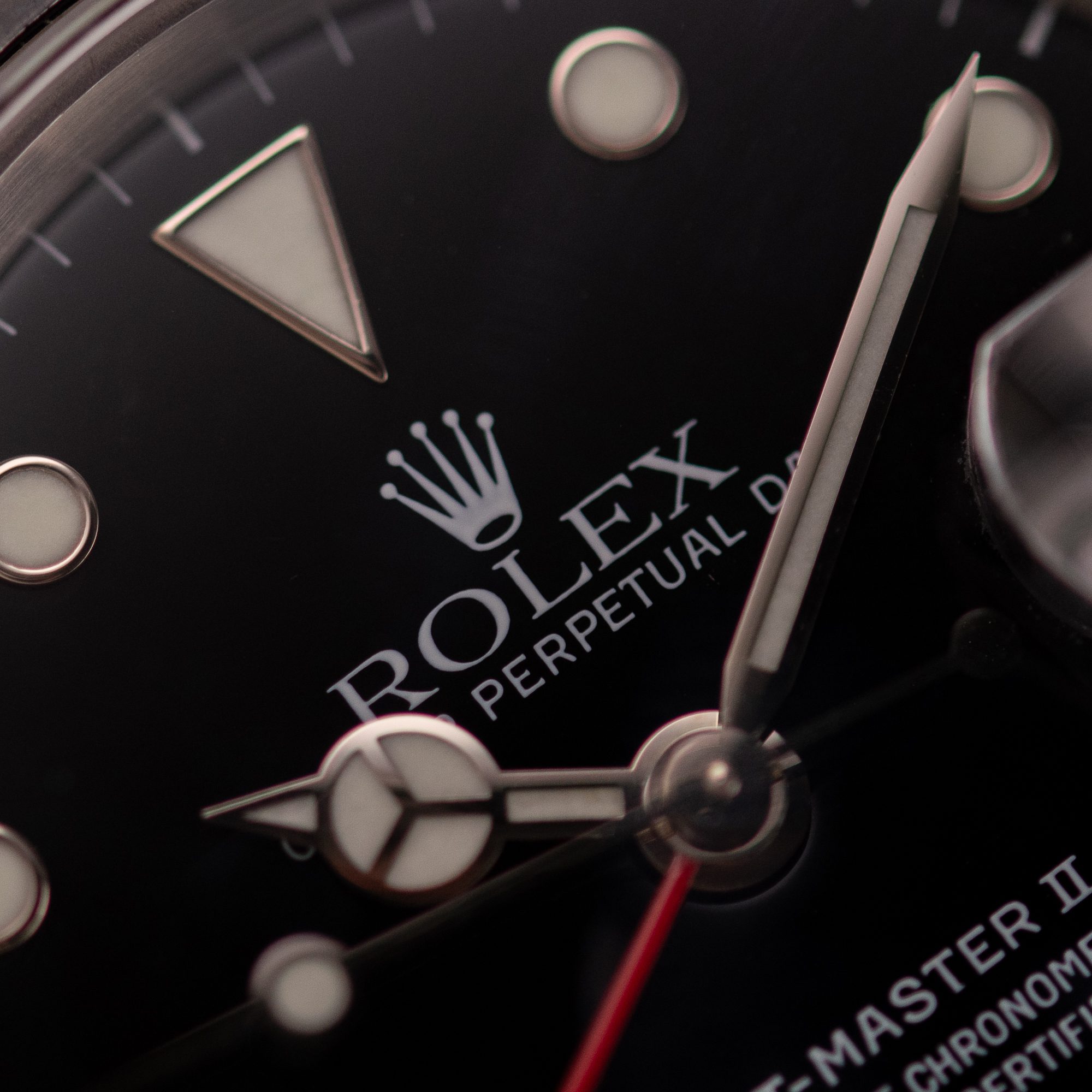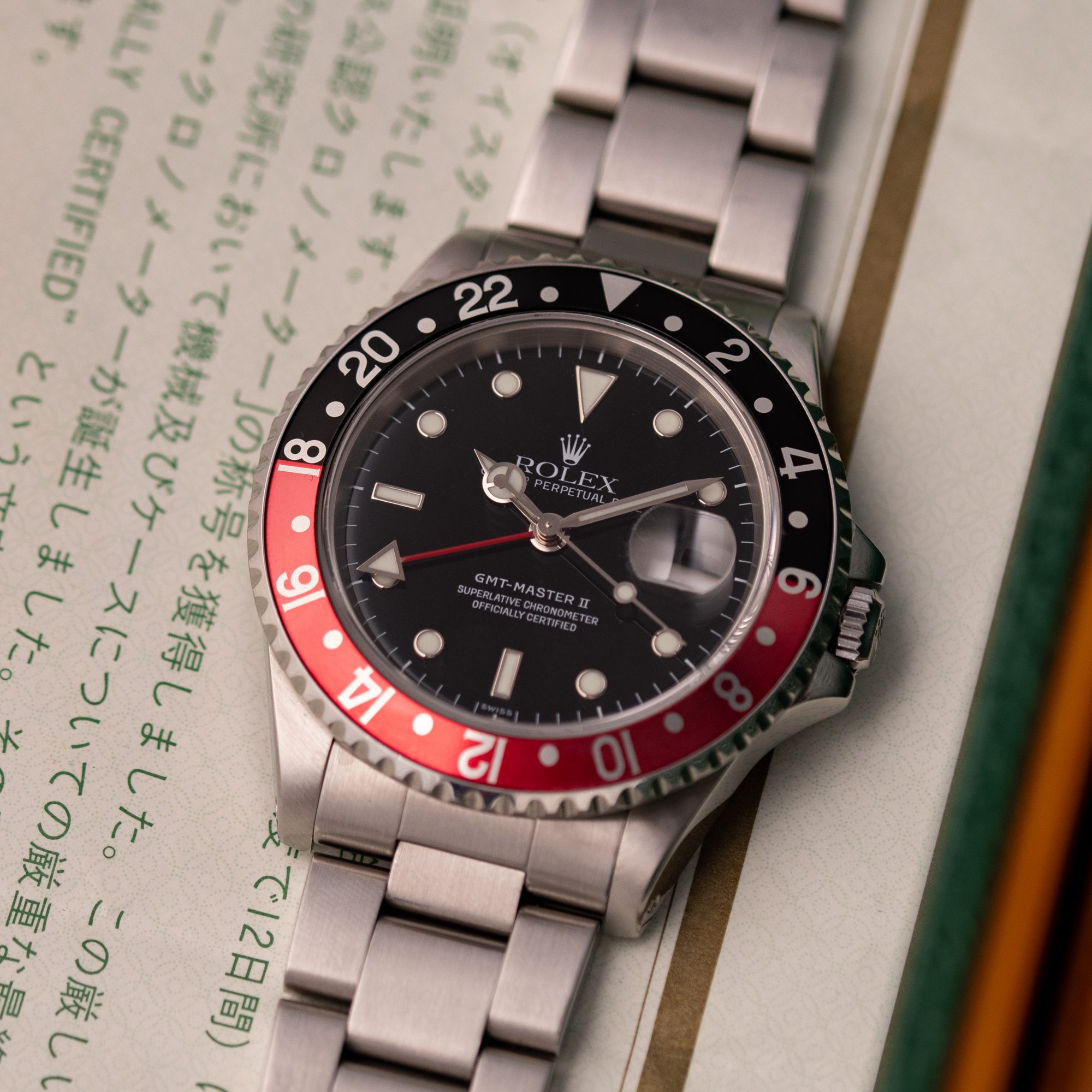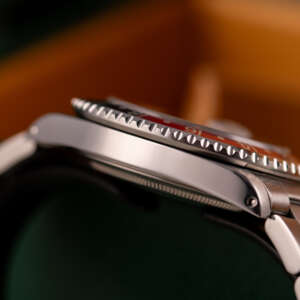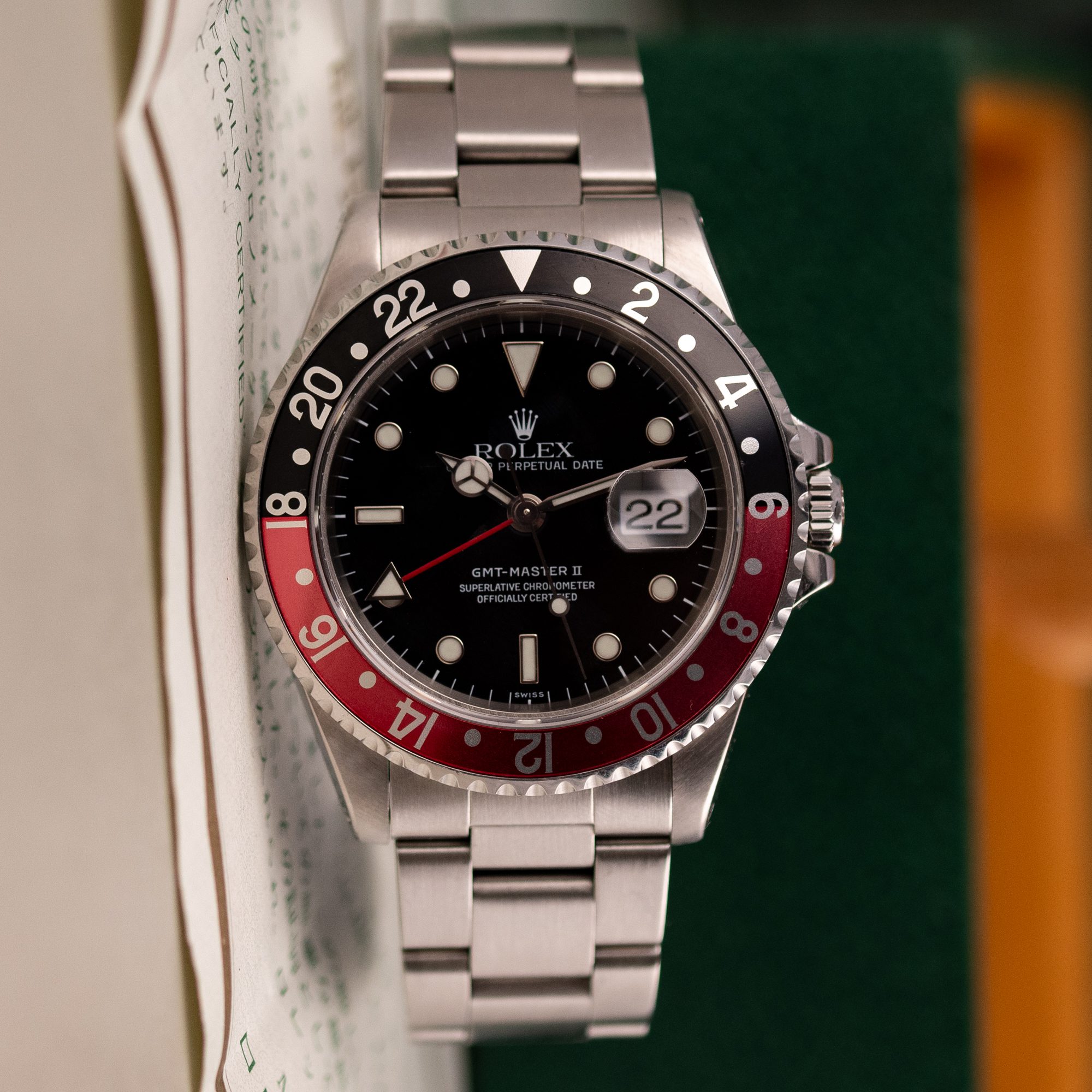 Originally sold in 1999, this example is equipped with a transitional “Swiss Only” dial produced for only one year, adding a collectible appeal to its vintage character. The watch is in very good condition, with a fully functional automatic movement, an unscratched bezel, and a recently completed full watchmaker service ensuring optimal performance. The Oyster bracelet, sized for wrists up to 18 cm, shows minimal wear while maintaining its robust structure. Presented as a full set with its original Rolex box and papers, this GMT Master II is an excellent choice for collectors or those seeking a well-maintained, historically significant timepiece.