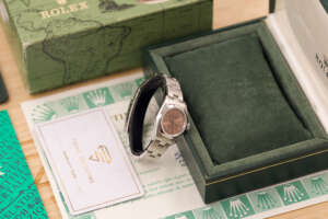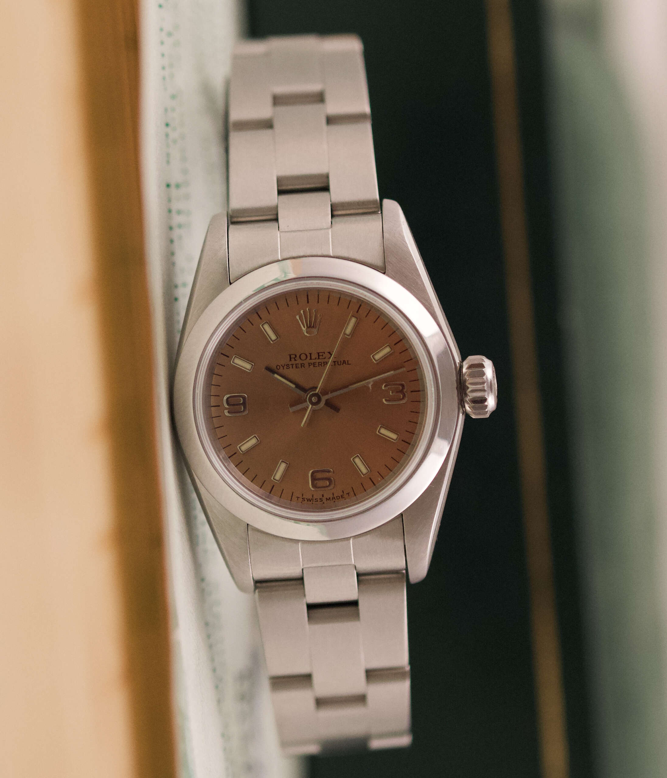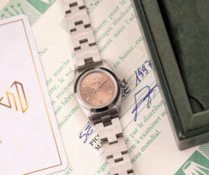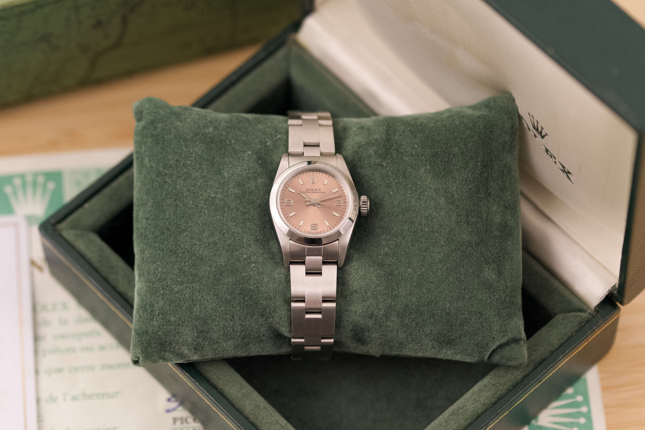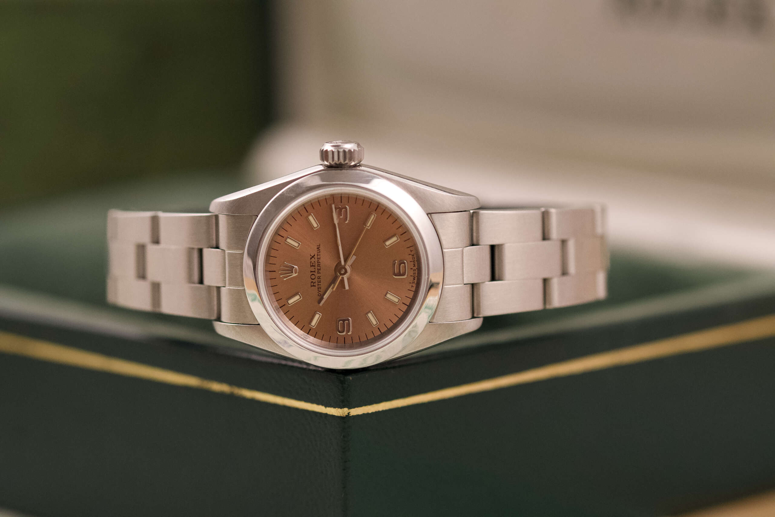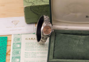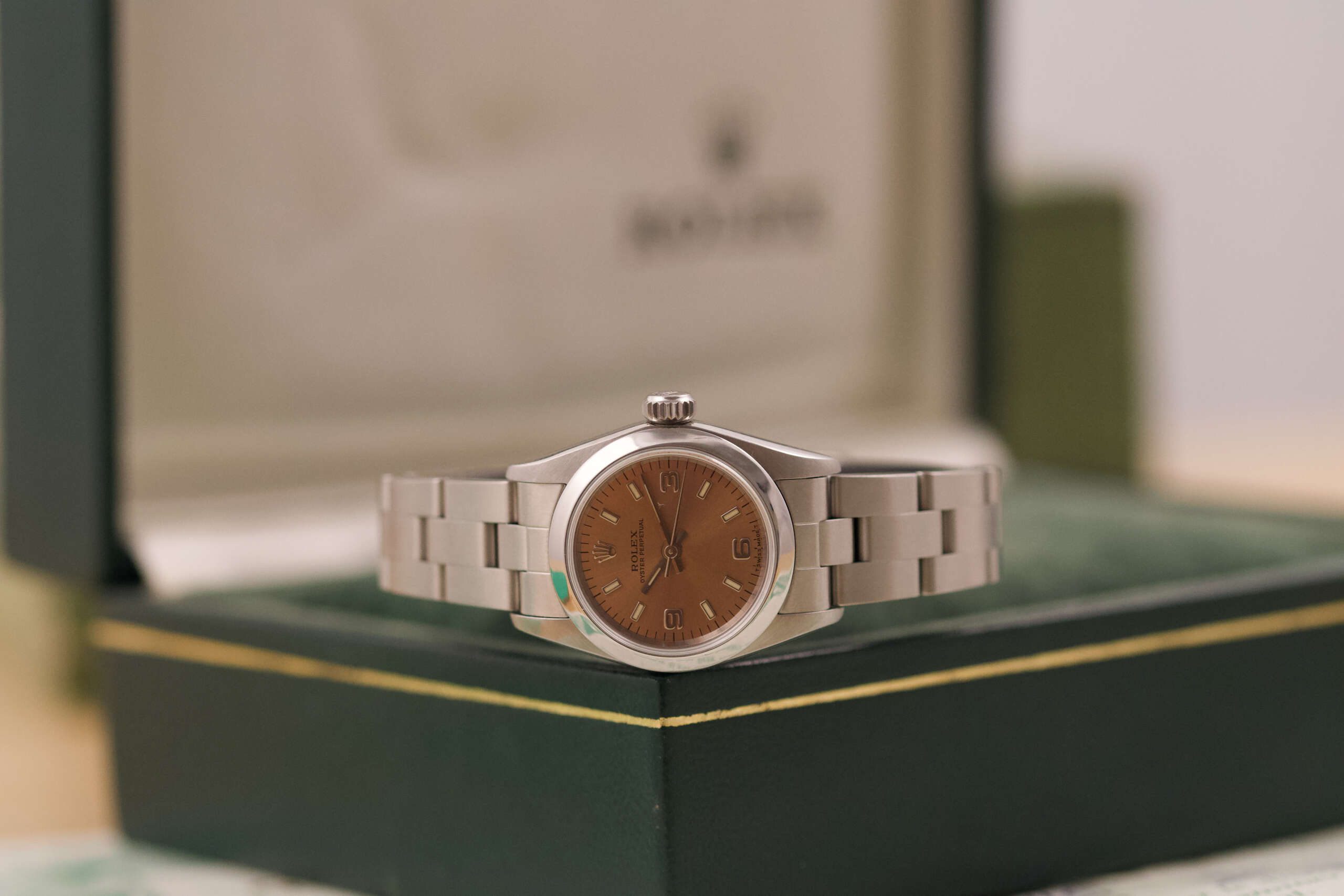 This particular example was originally sold in 1997. It features a beautiful salmon-toned dial with Arabic numerals and is in excellent condition, with a bracelet free of stretch. The bracelet fits wrists up to 16 cm. The watch comes as a complete set with the original Rolex box and papers.