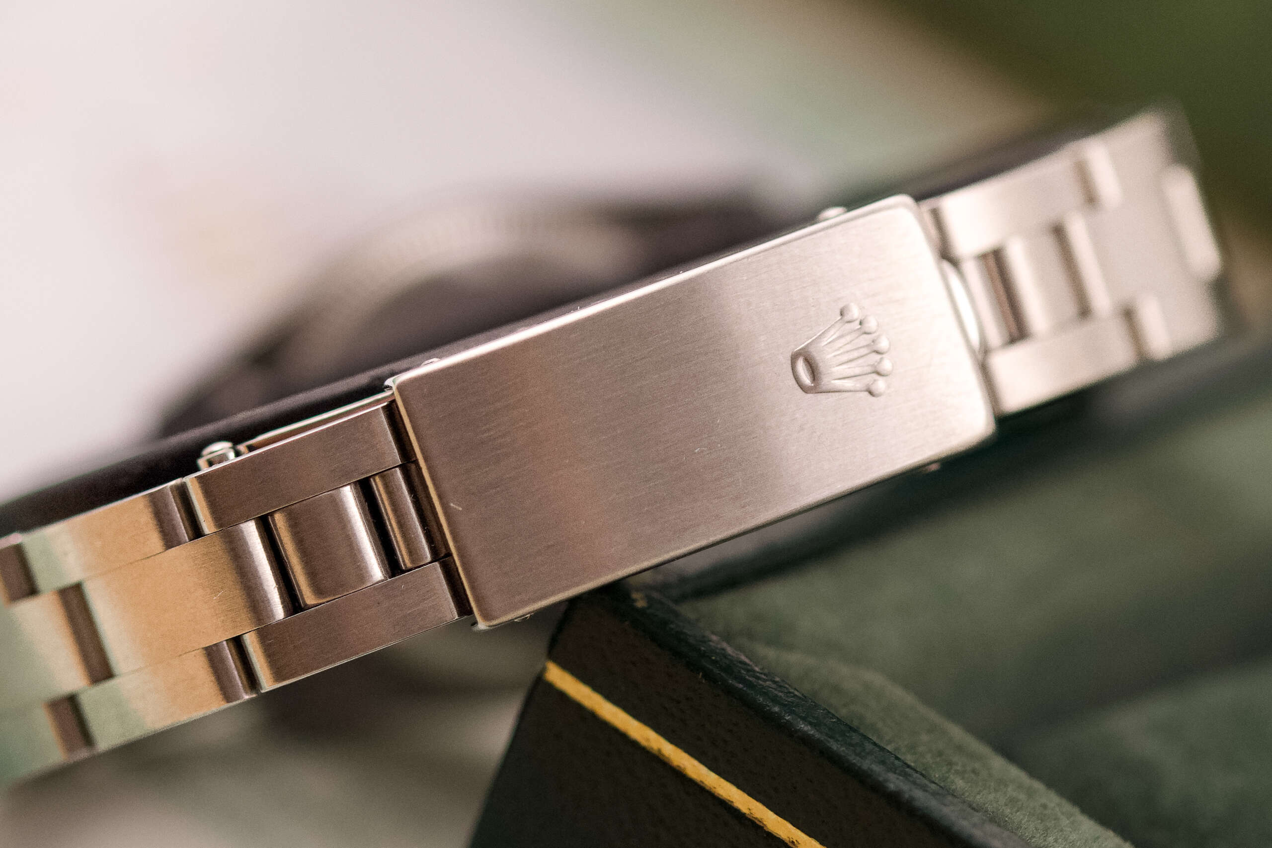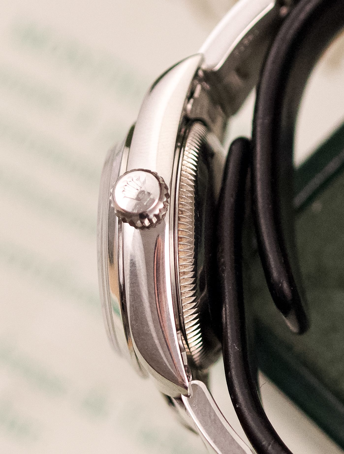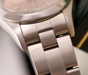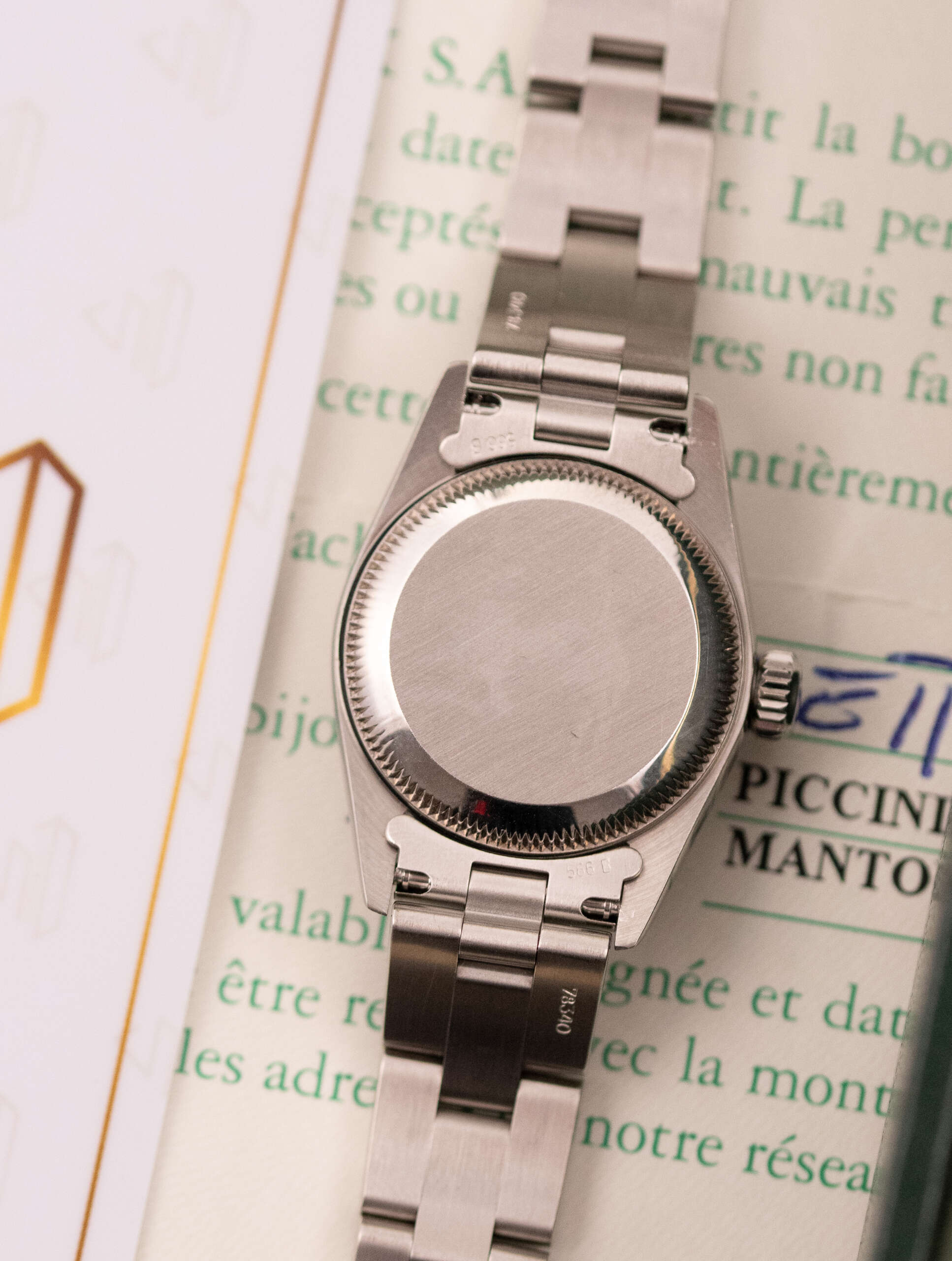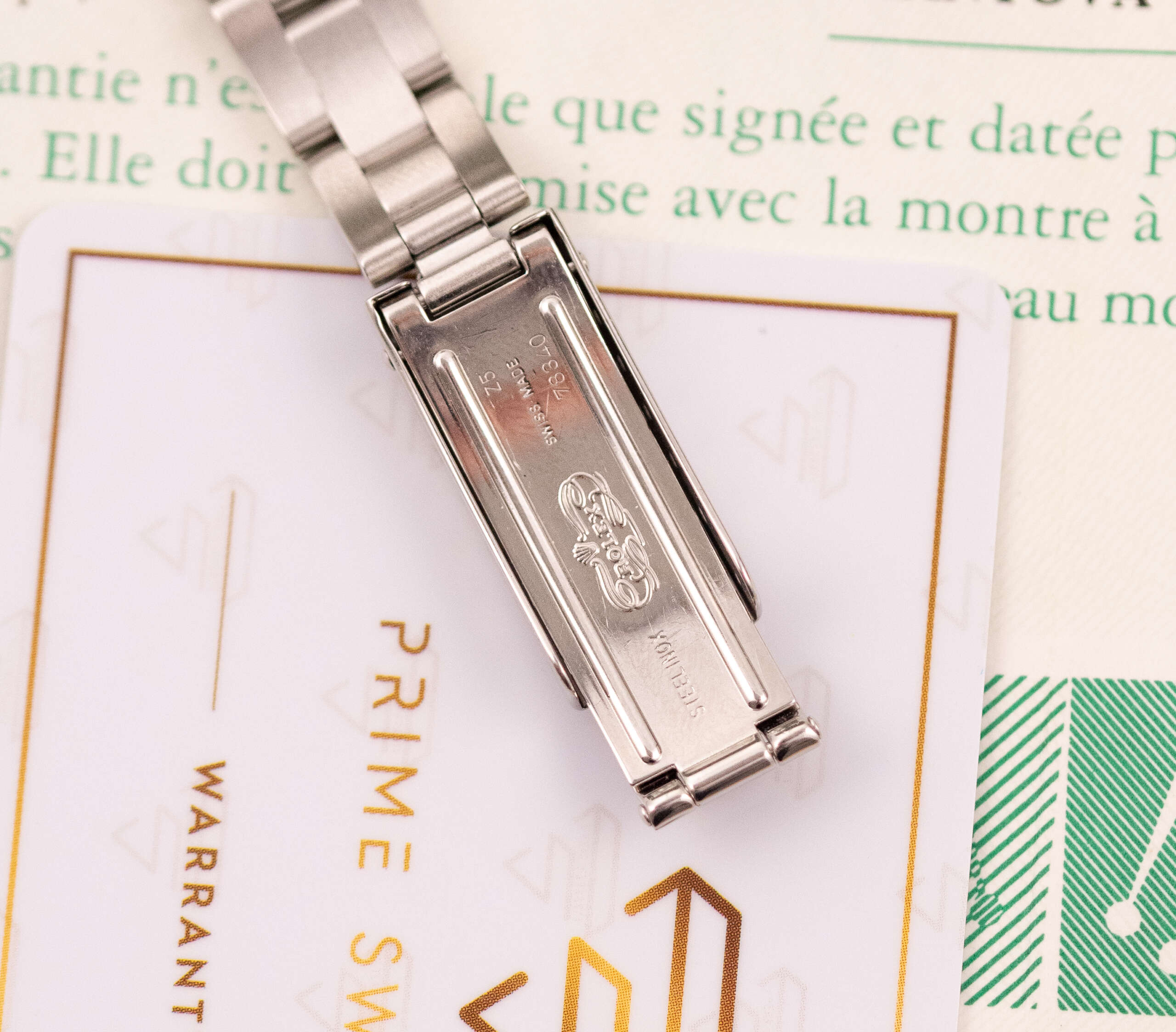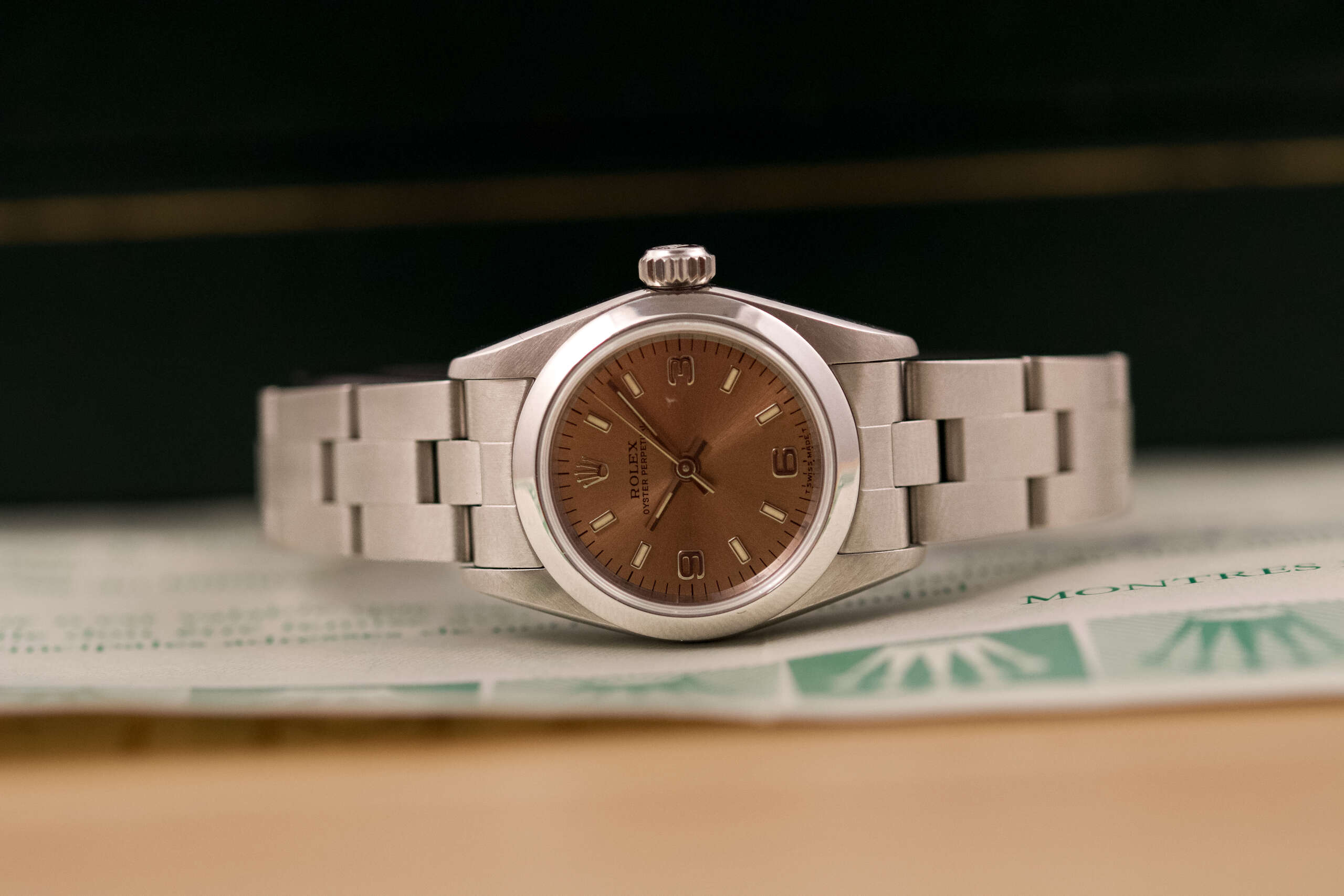 This particular example was originally sold in 1997. It features a beautiful salmon-toned dial with Arabic numerals and is in excellent condition, with a bracelet free of stretch. The bracelet fits wrists up to 16 cm. The watch comes as a complete set with the original Rolex box and papers.
