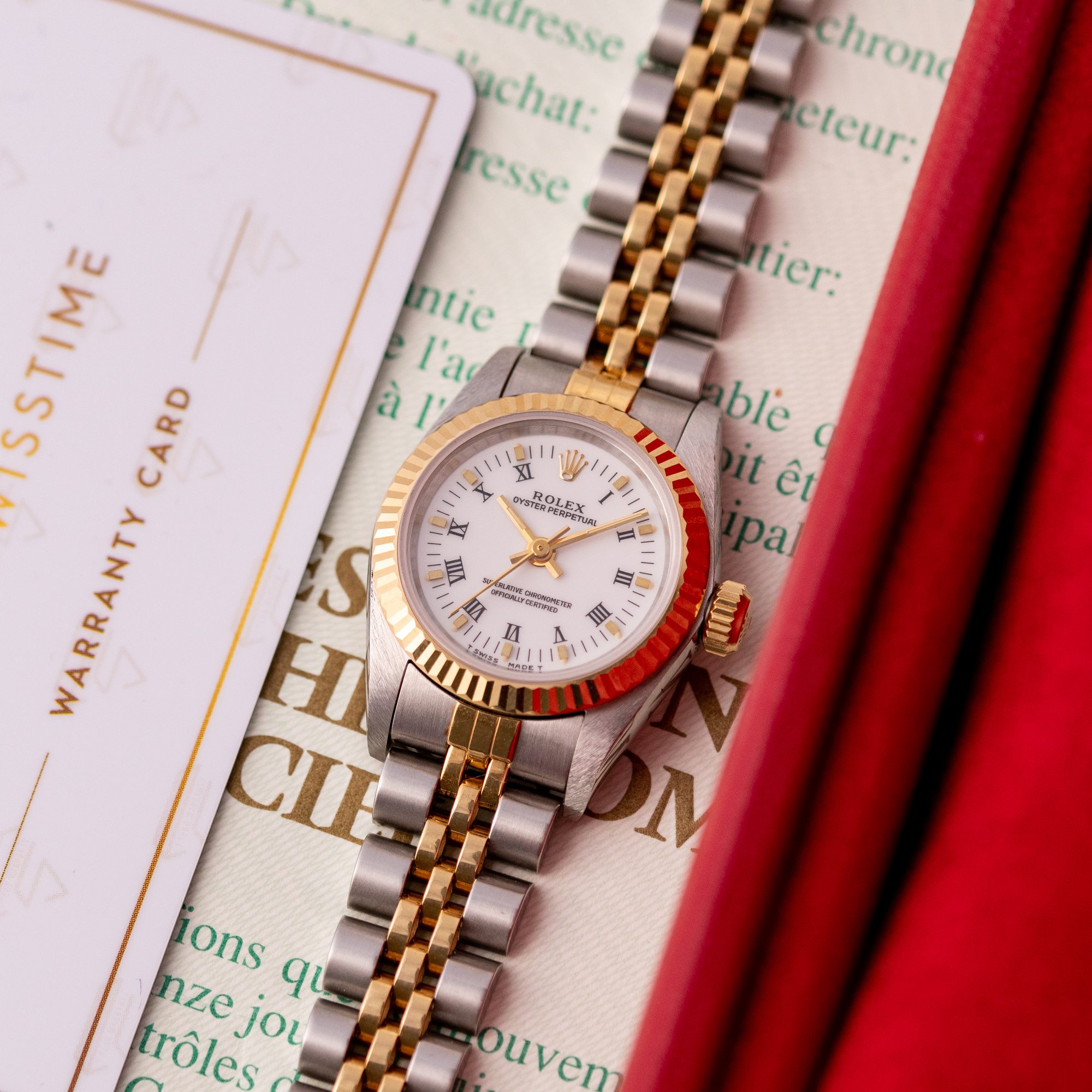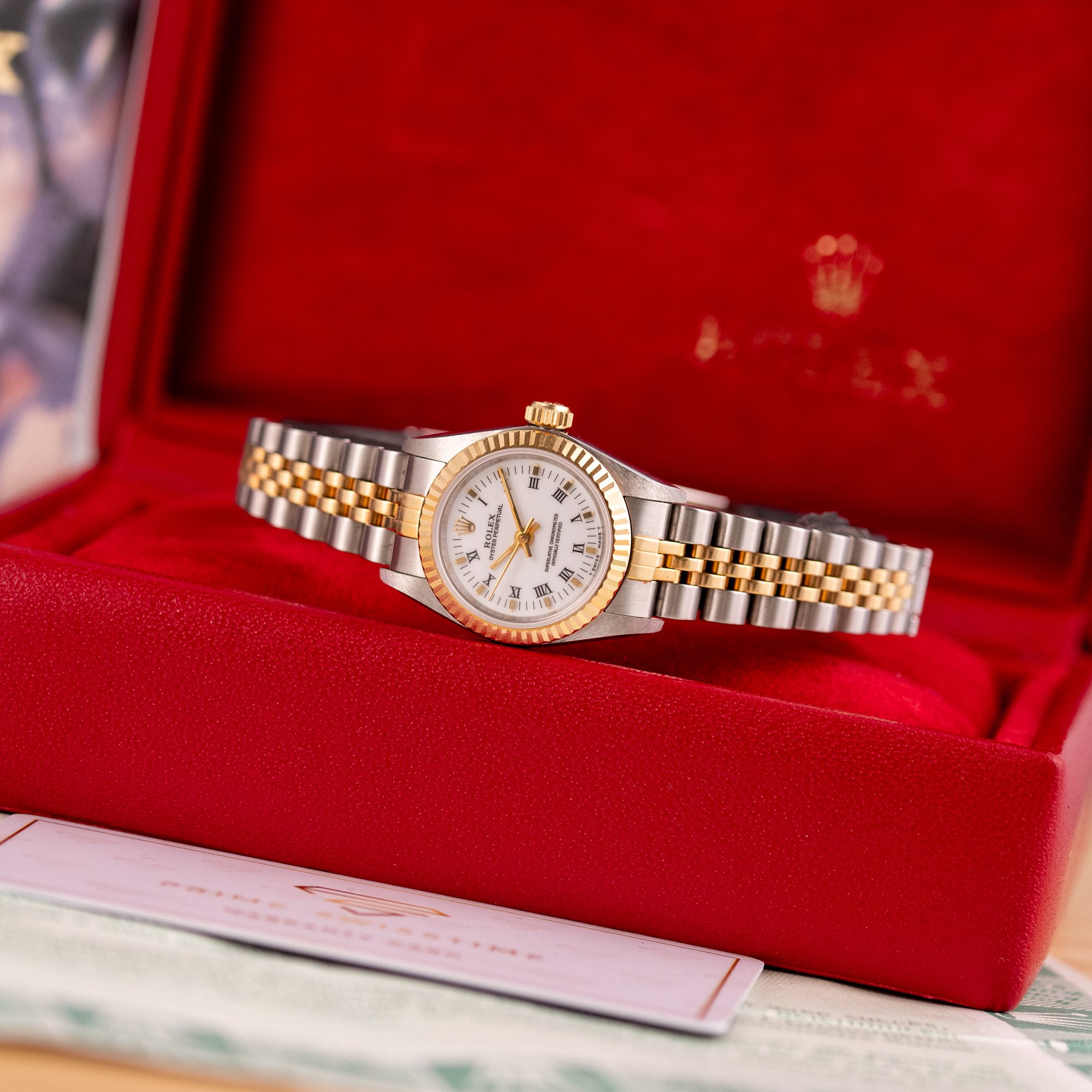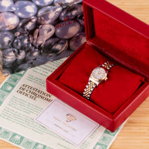 This particular example was originally sold in 1997. It features the sought-after white Roman dial and is in excellent condition, with a bracelet free of stretch. The bracelet fits wrists up to 16 cm. The watch has just undergone a full service and comes as a complete set with the original Rolex box and papers.