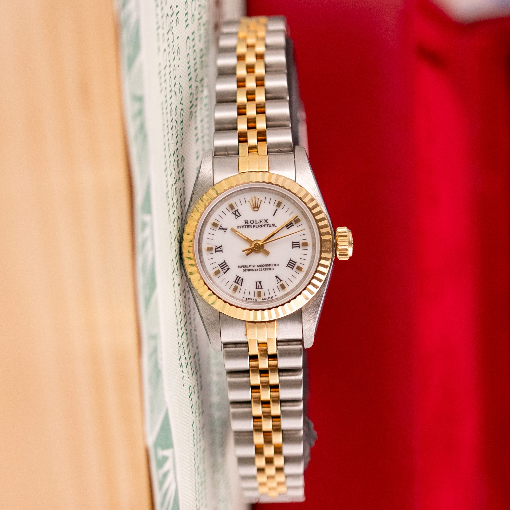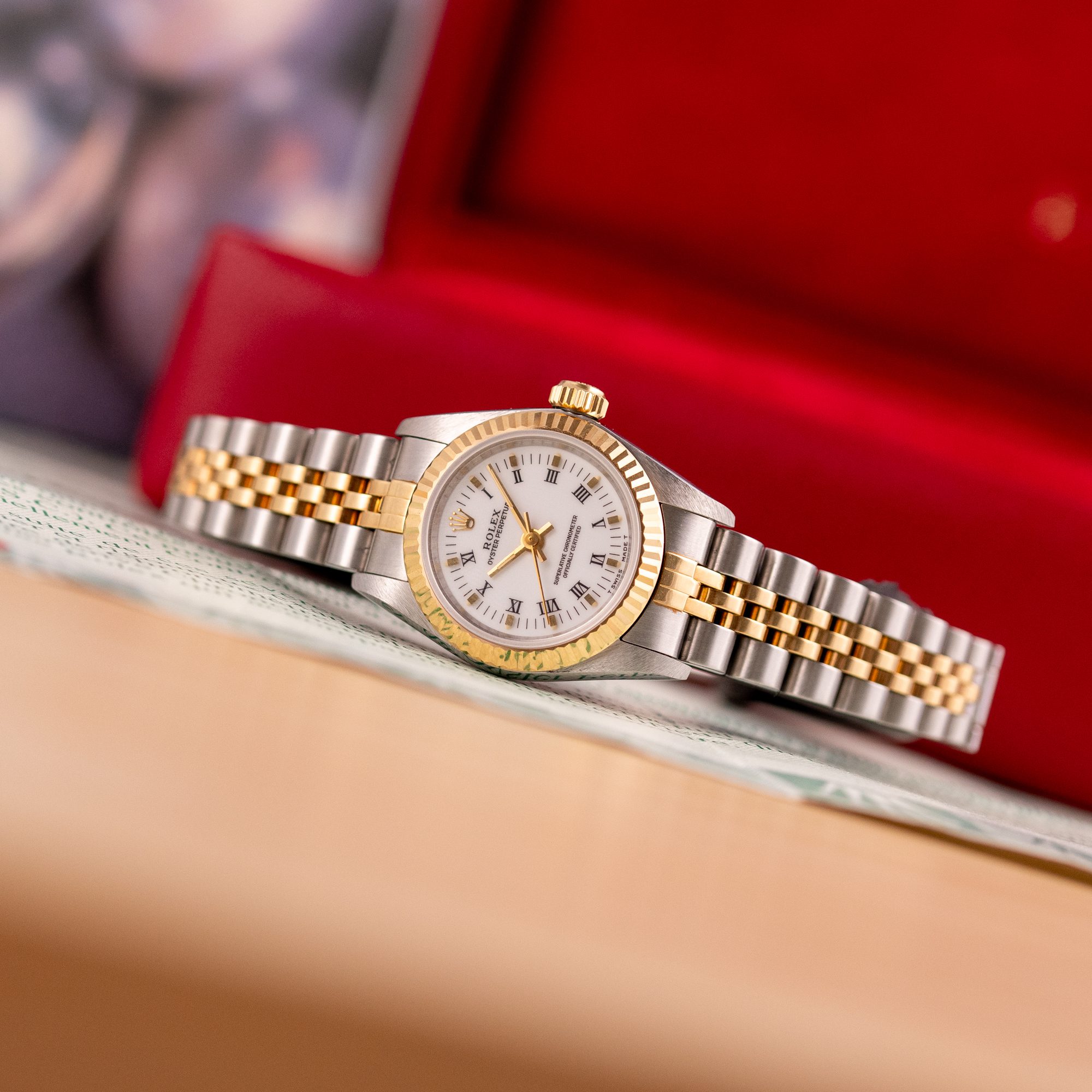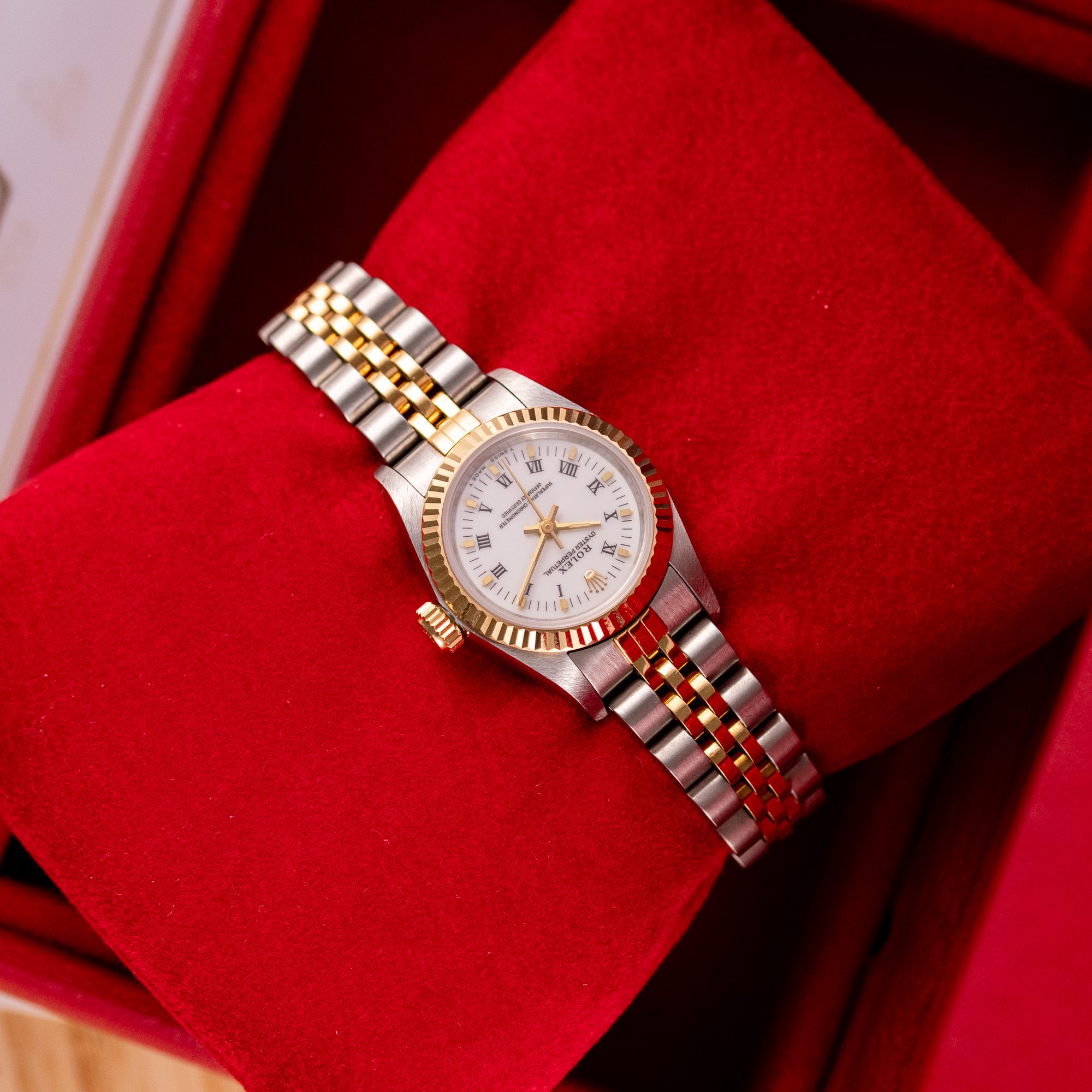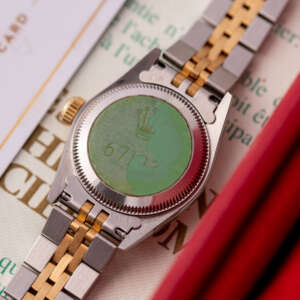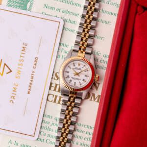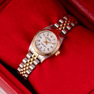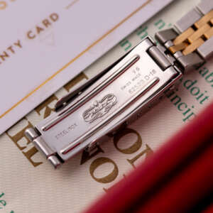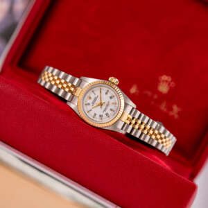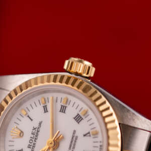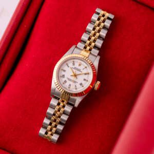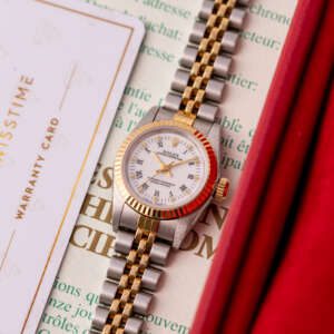 The Rolex Oyster Perpetual 26 ref. 67193 is a refined and classic ladies’ timepiece that blends stainless steel with yellow gold for a timeless two-tone aesthetic. Its clean white Roman dial enhances legibility while maintaining the understated elegance that defines the Oyster Perpetual collection.