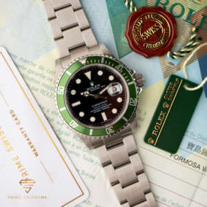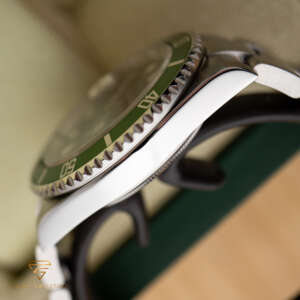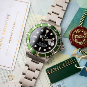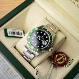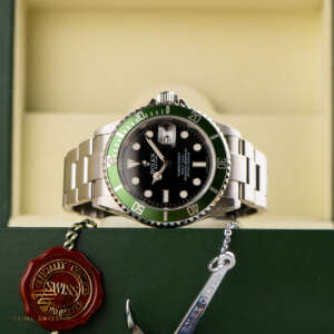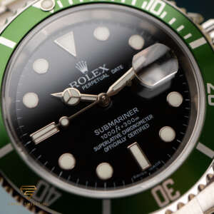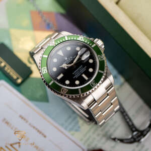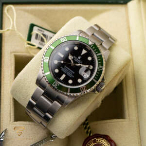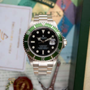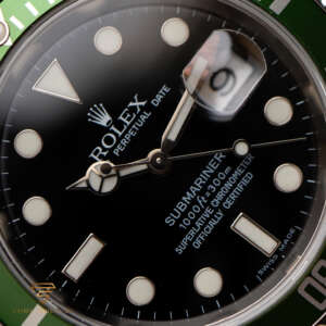 The Rolex Submariner Date “Kermit” was created to celebrate the 50th anniversary of the Submariner. It features a unique green bezel and a classic black dial, making it a standout in the Submariner lineup.