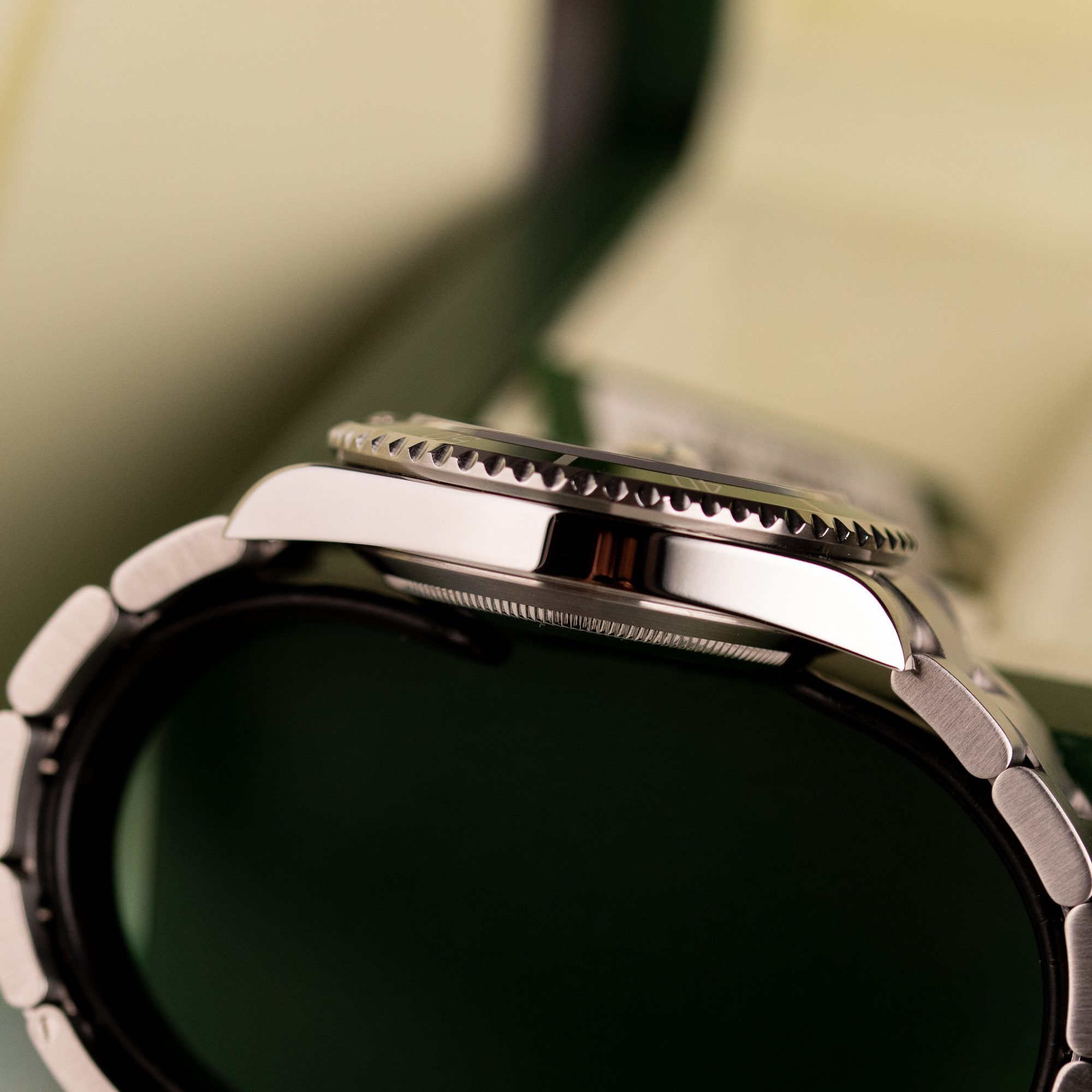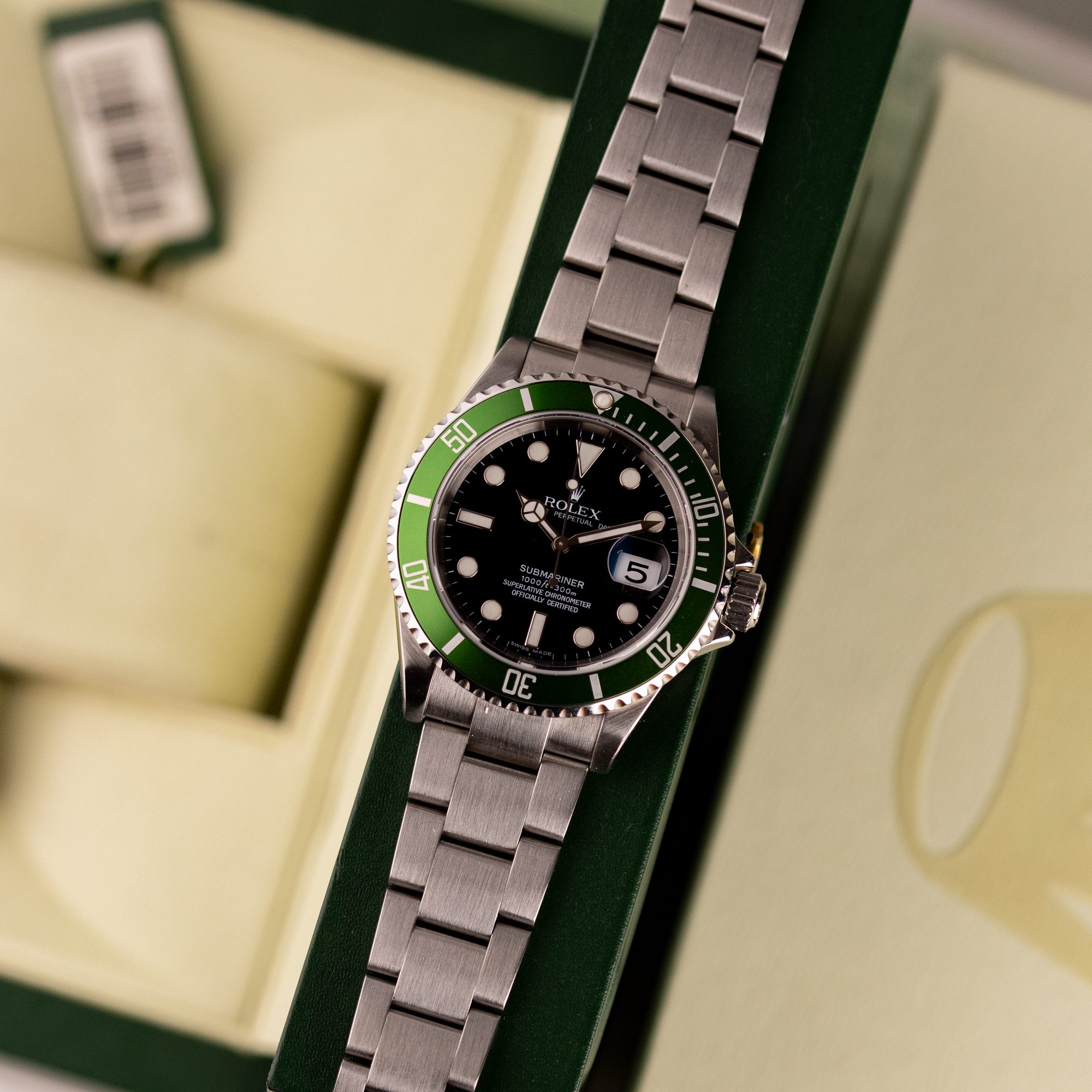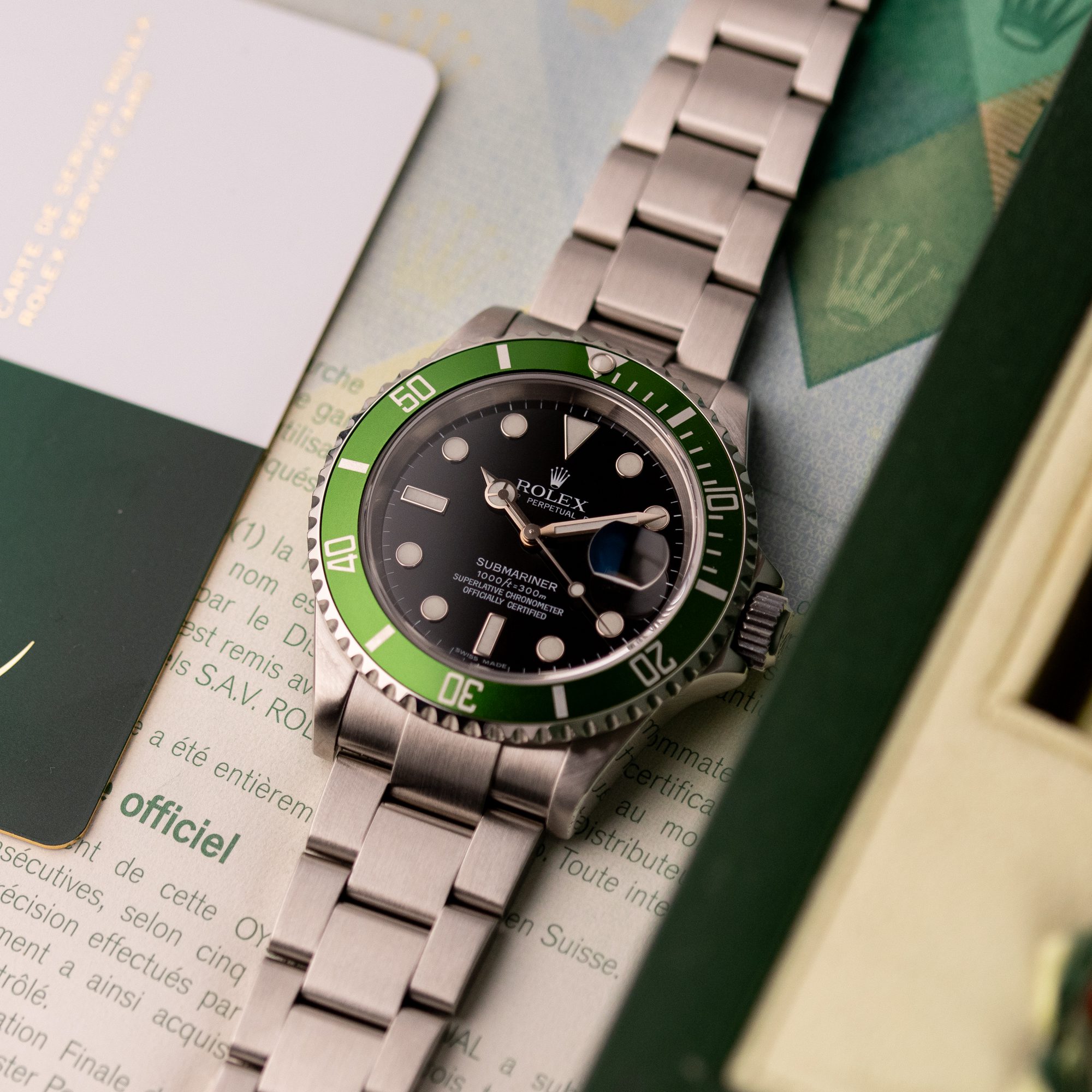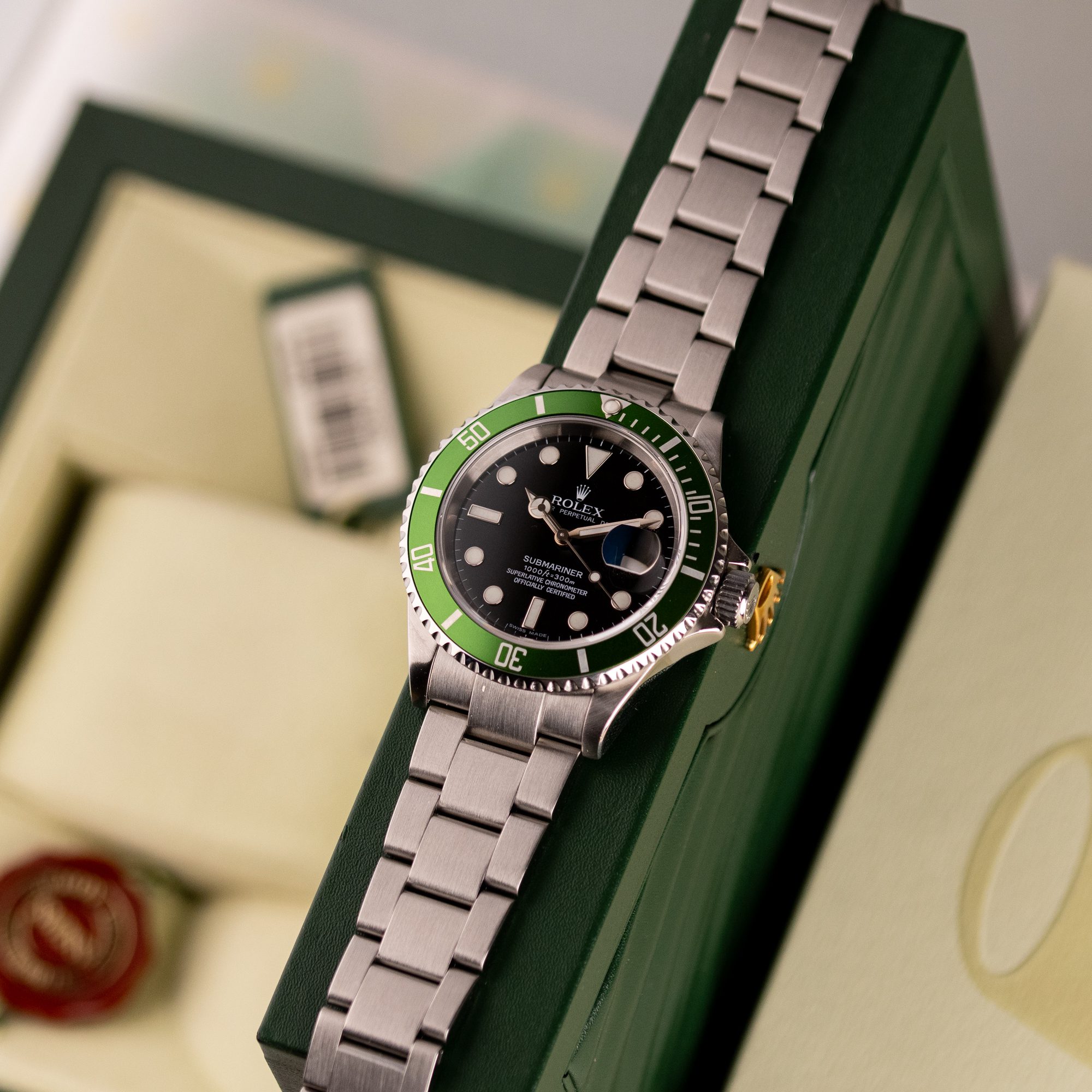 The Rolex Submariner Date ref. 16610LV, affectionately known as the “Kermit,” was introduced in 2003 to celebrate the 50th anniversary of the Submariner line. It marked a major departure from tradition with the debut of a green aluminum bezel, making it the first Submariner to feature a color other than black.