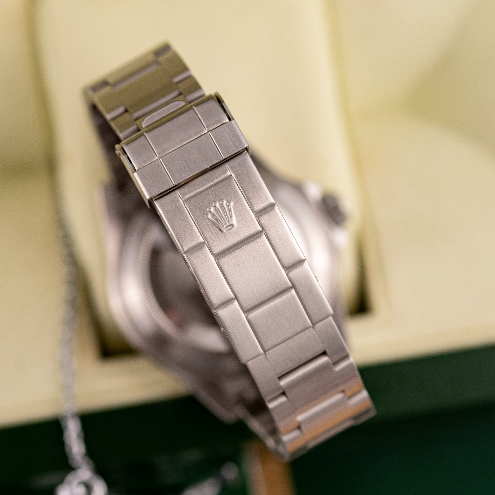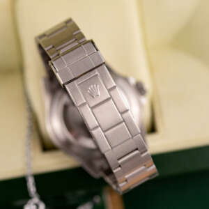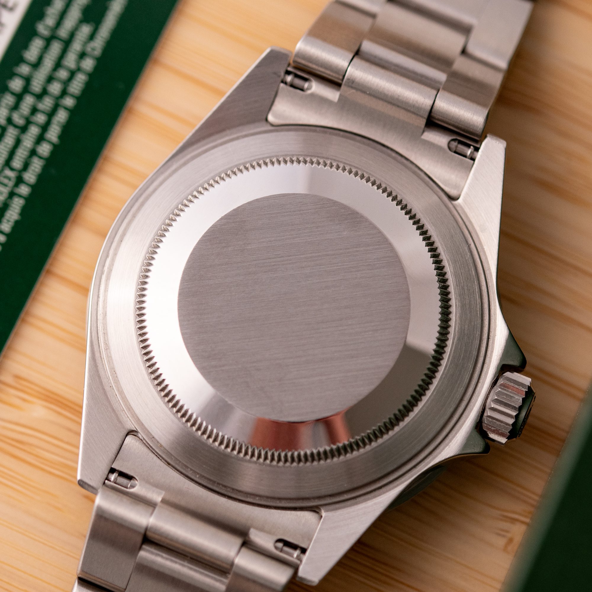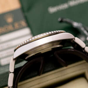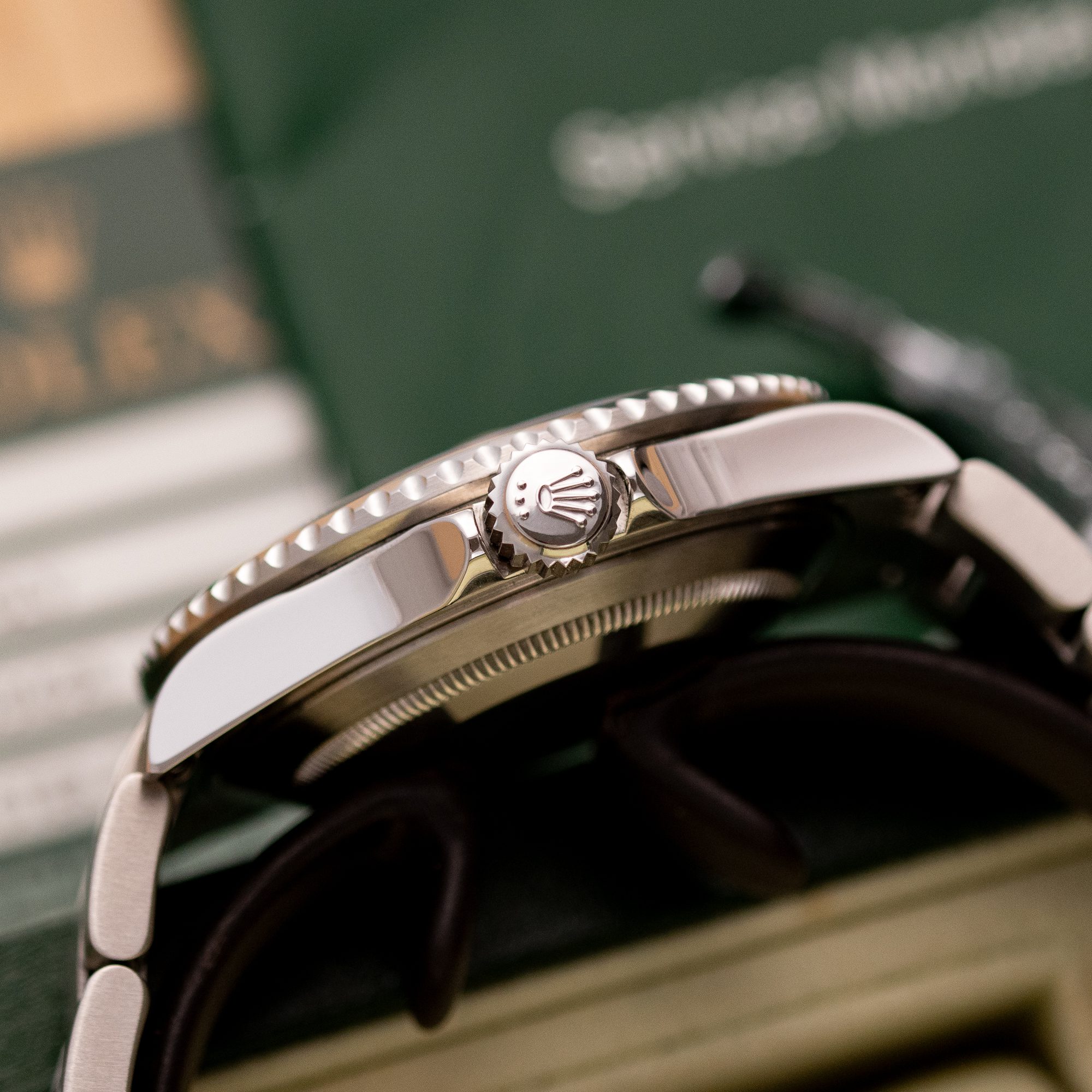 This particular piece, originally sold in 2008, comes in the later case version with the engraved Rehaut. It is in great condition with a scratch-free bezel and has just undergone a full service. The watch is offered as a full set with the original box and papers, making it an outstanding addition to any serious collection.
