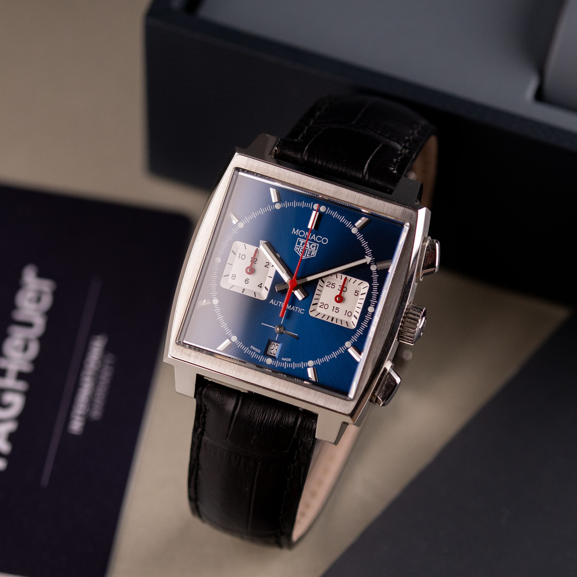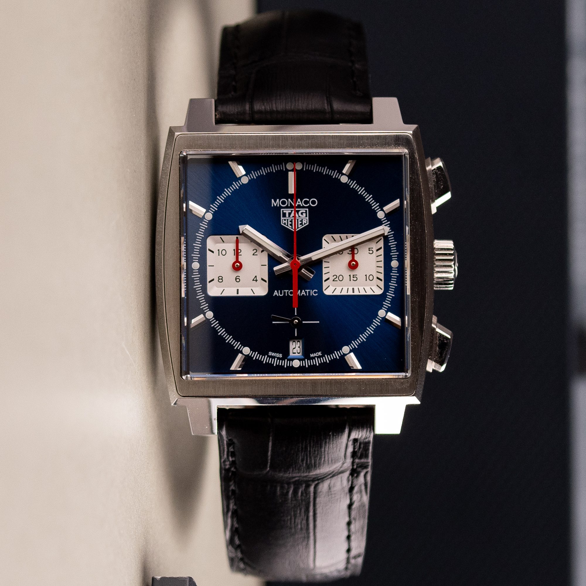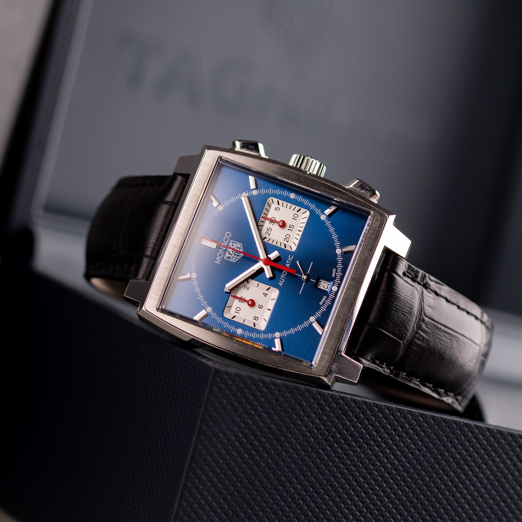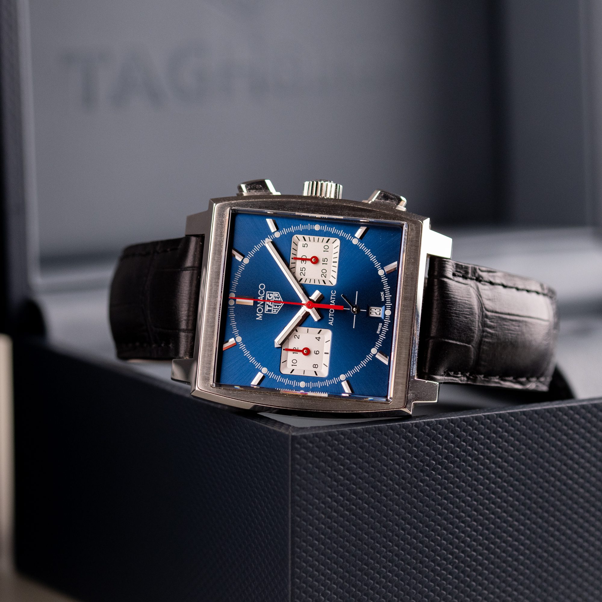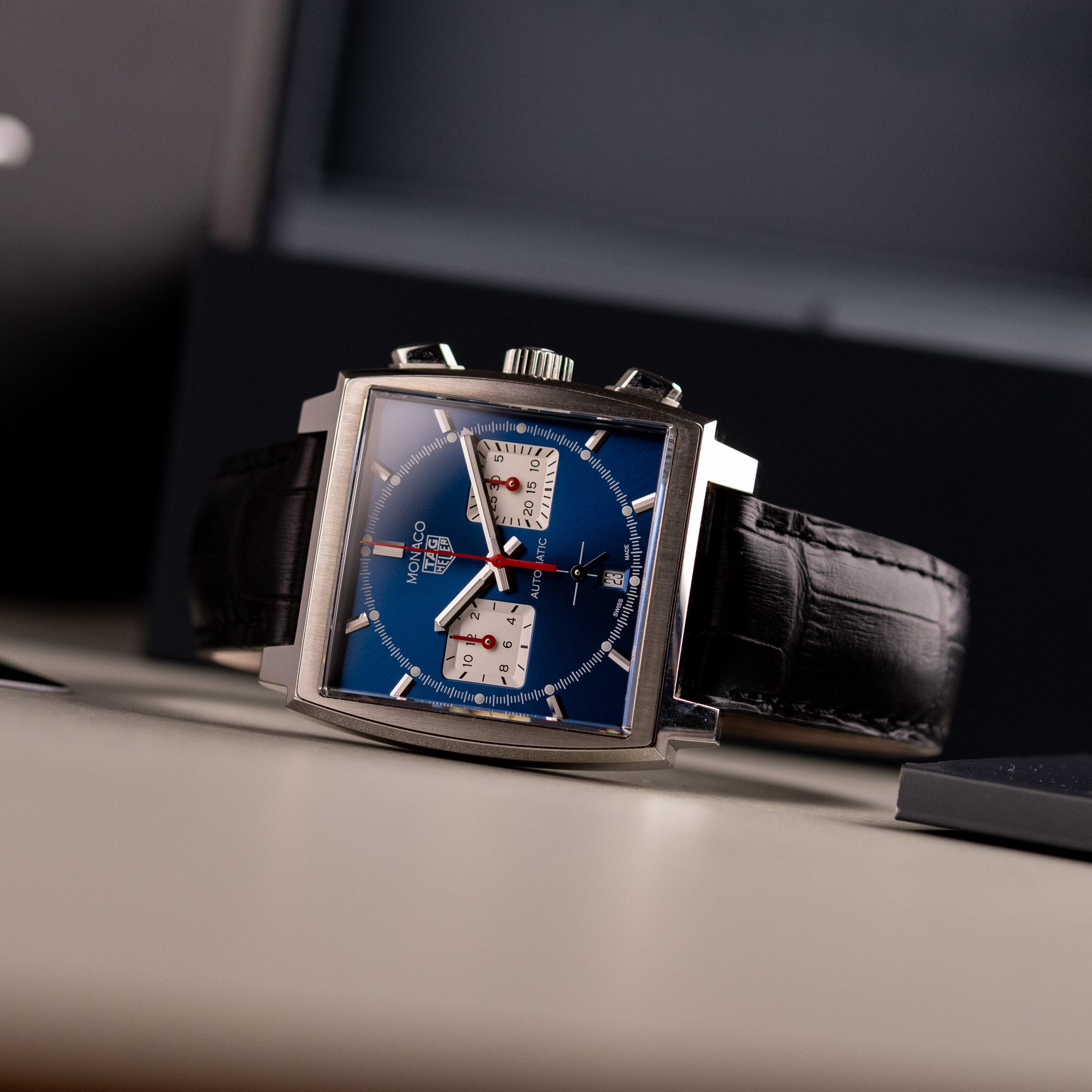 The TAG Heuer Monaco, ref. CBL2111.FC6453, crafted in stainless steel, features a 39mm square case with a bold blue dial and red accents, embodying the iconic motorsport-inspired design that has defined this legendary chronograph since its debut, ideal for enthusiasts of racing heritage.