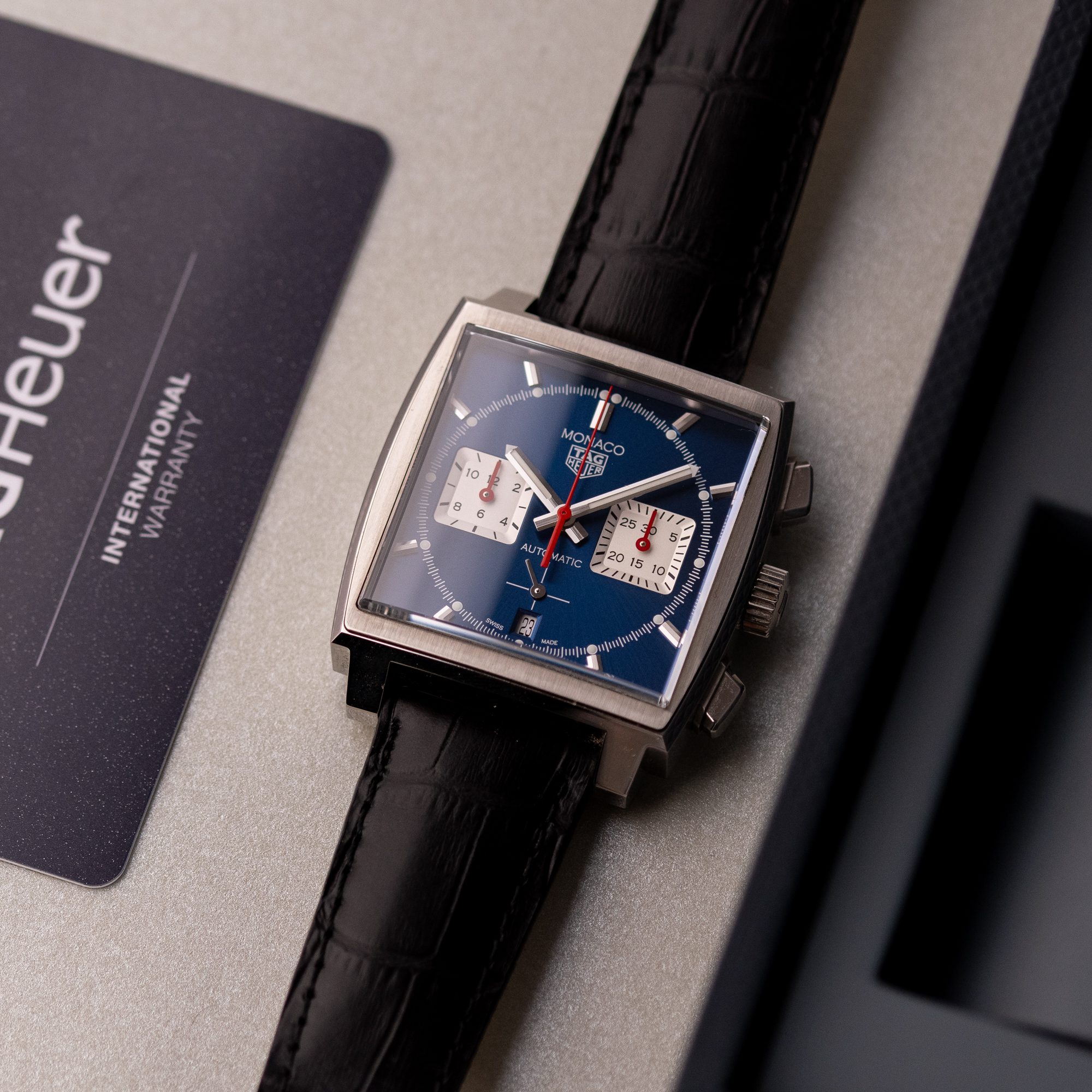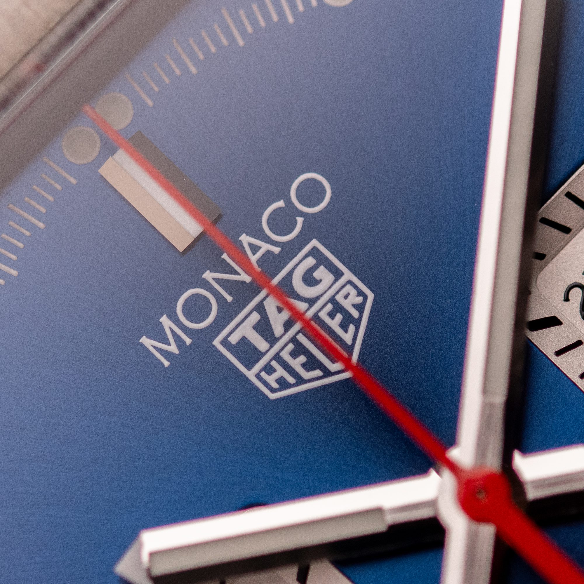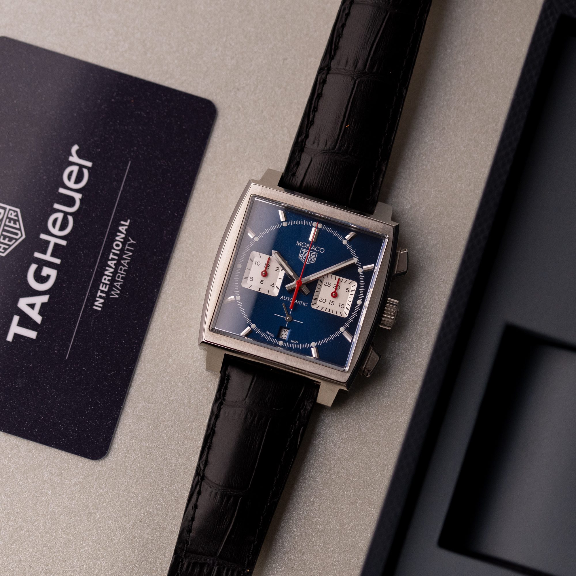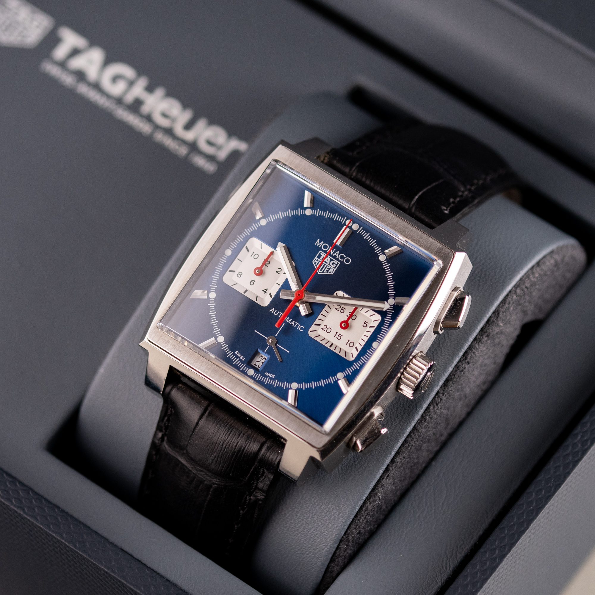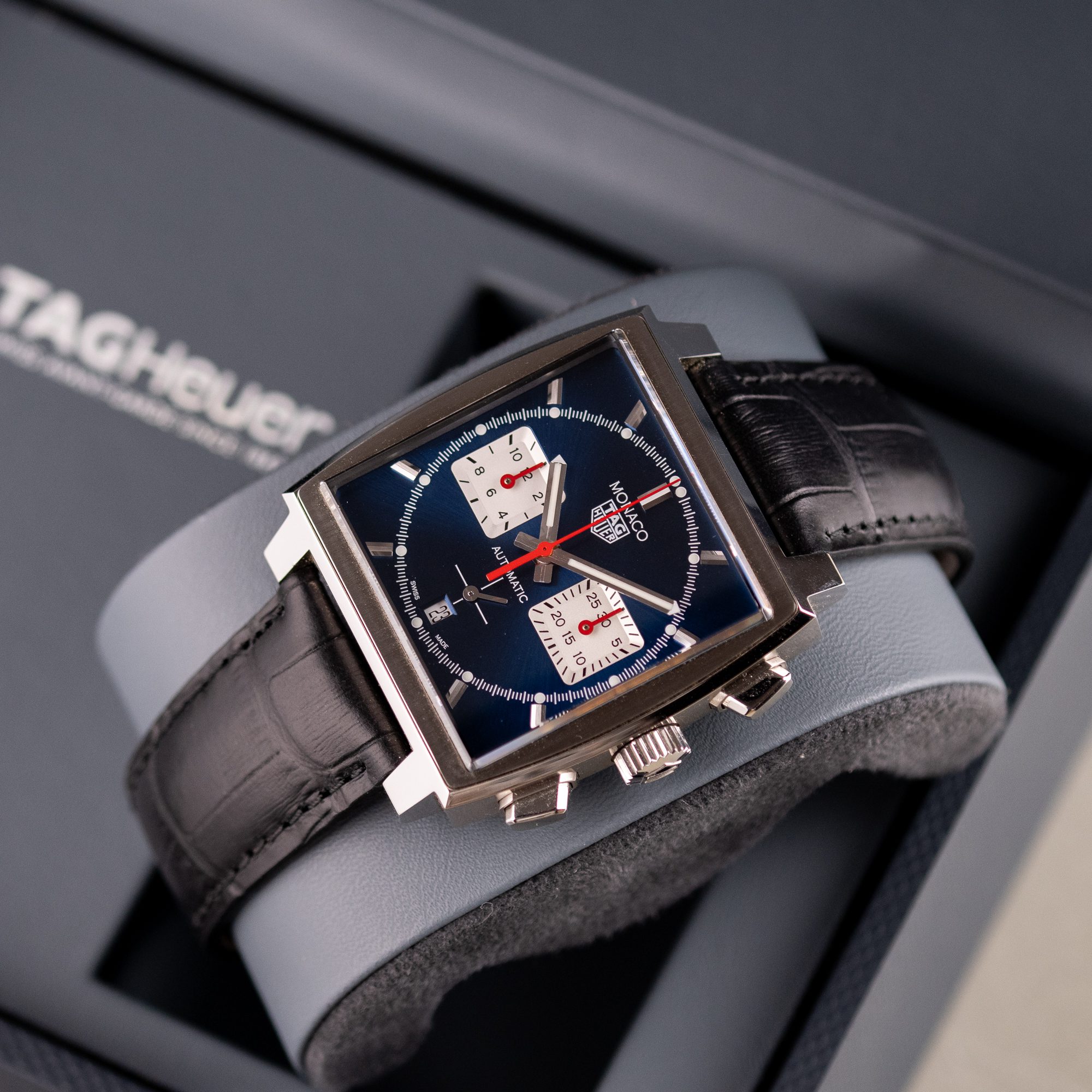 The TAG Heuer Monaco, ref. CBL2111.FC6453, crafted in stainless steel, features a 39mm square case with a bold blue dial and red accents, embodying the iconic motorsport-inspired design that has defined this legendary chronograph since its debut, ideal for enthusiasts of racing heritage.