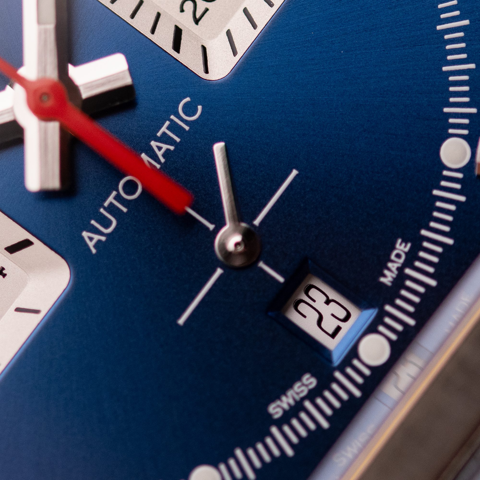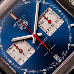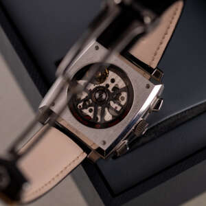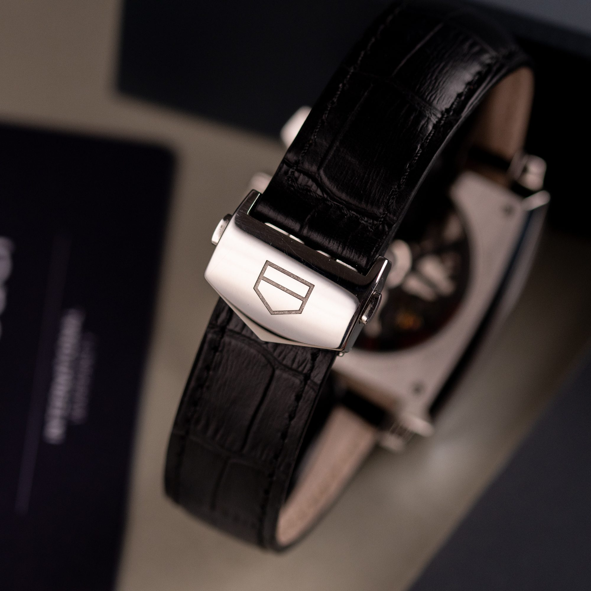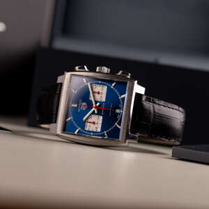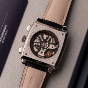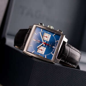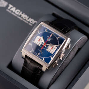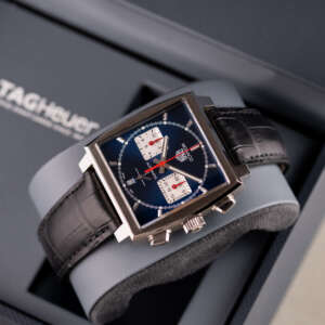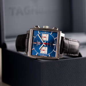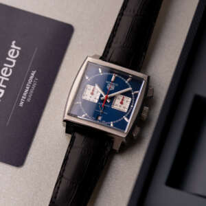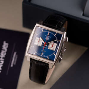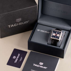This example is in very good condition, with a fully functional automatic chronograph movement ensuring precise timekeeping and reliable performance. Fitted with a new external leather strap, it offers enhanced comfort and a refined aesthetic suitable for various occasions. Presented as a full set with its original TAG Heuer box and papers, this Monaco is an excellent choice for collectors or those seeking a distinctive, high-performance timepiece.