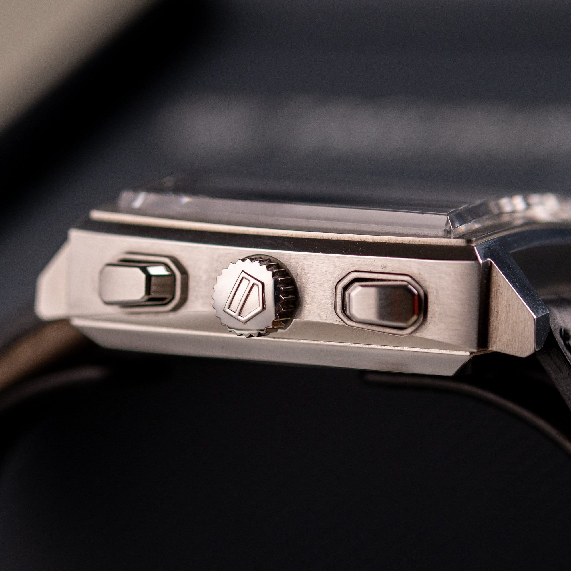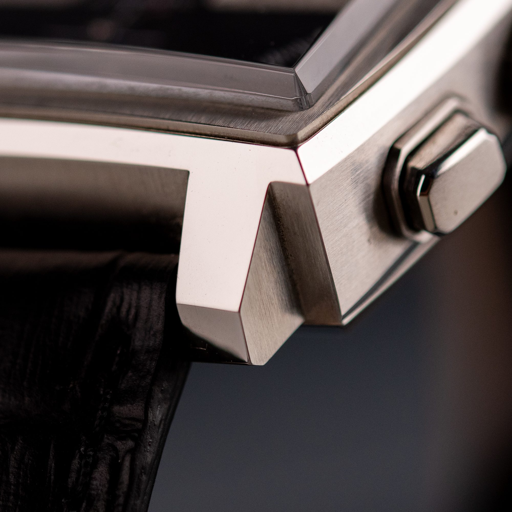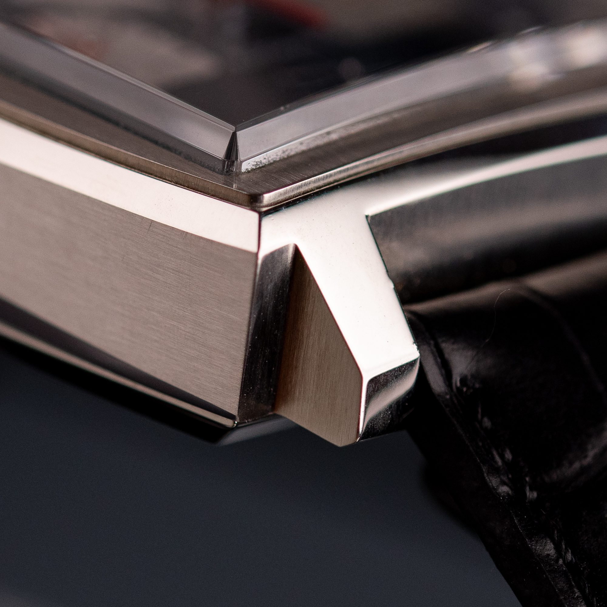 This example is in very good condition, with a fully functional automatic chronograph movement ensuring precise timekeeping and reliable performance. Fitted with a new external leather strap, it offers enhanced comfort and a refined aesthetic suitable for various occasions. Presented as a full set with its original TAG Heuer box and papers, this Monaco is an excellent choice for collectors or those seeking a distinctive, high-performance timepiece.